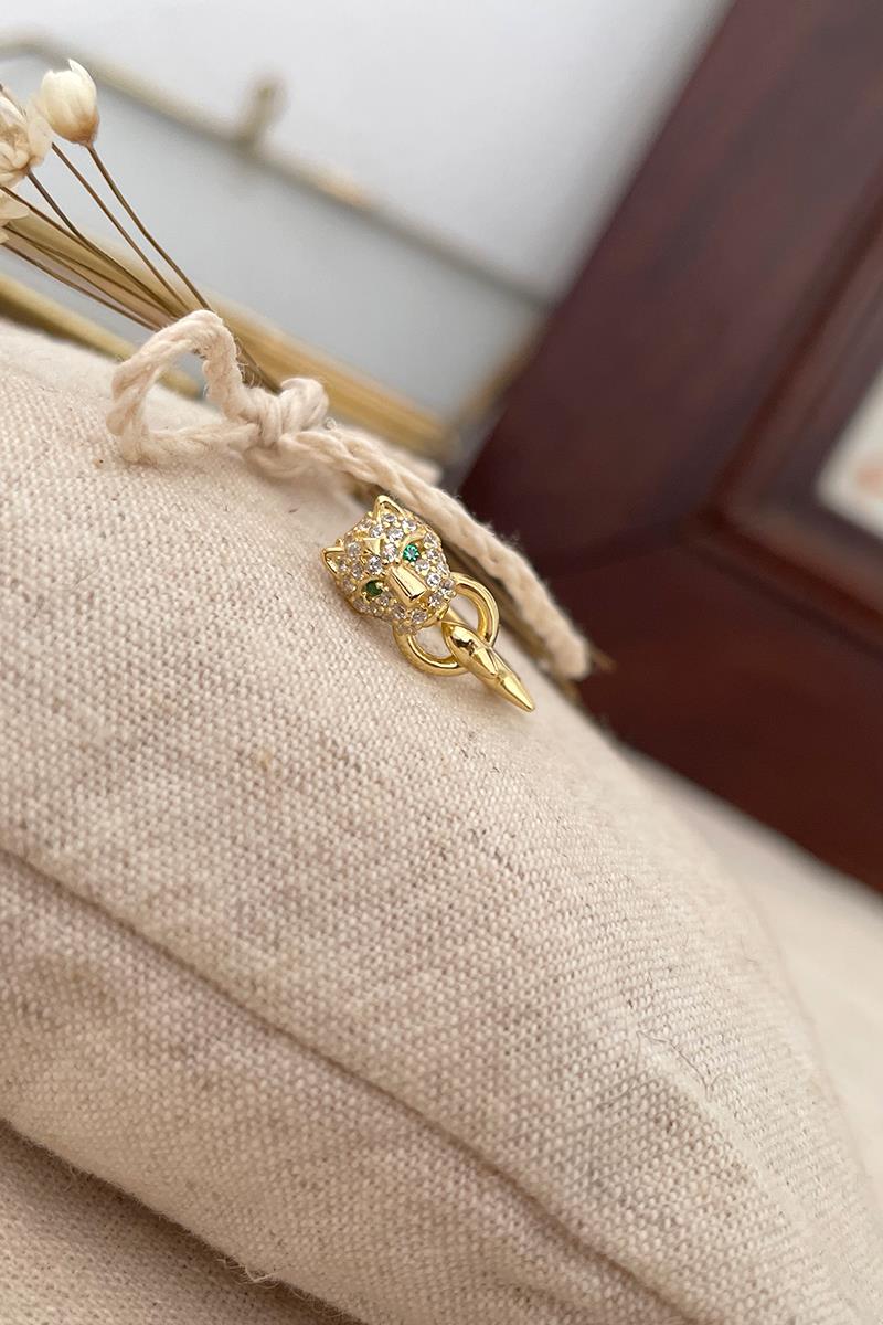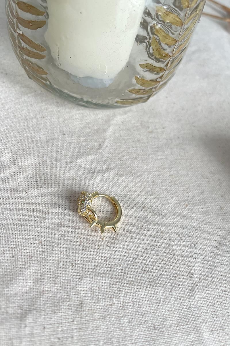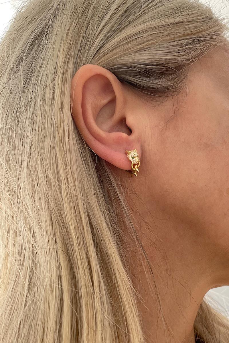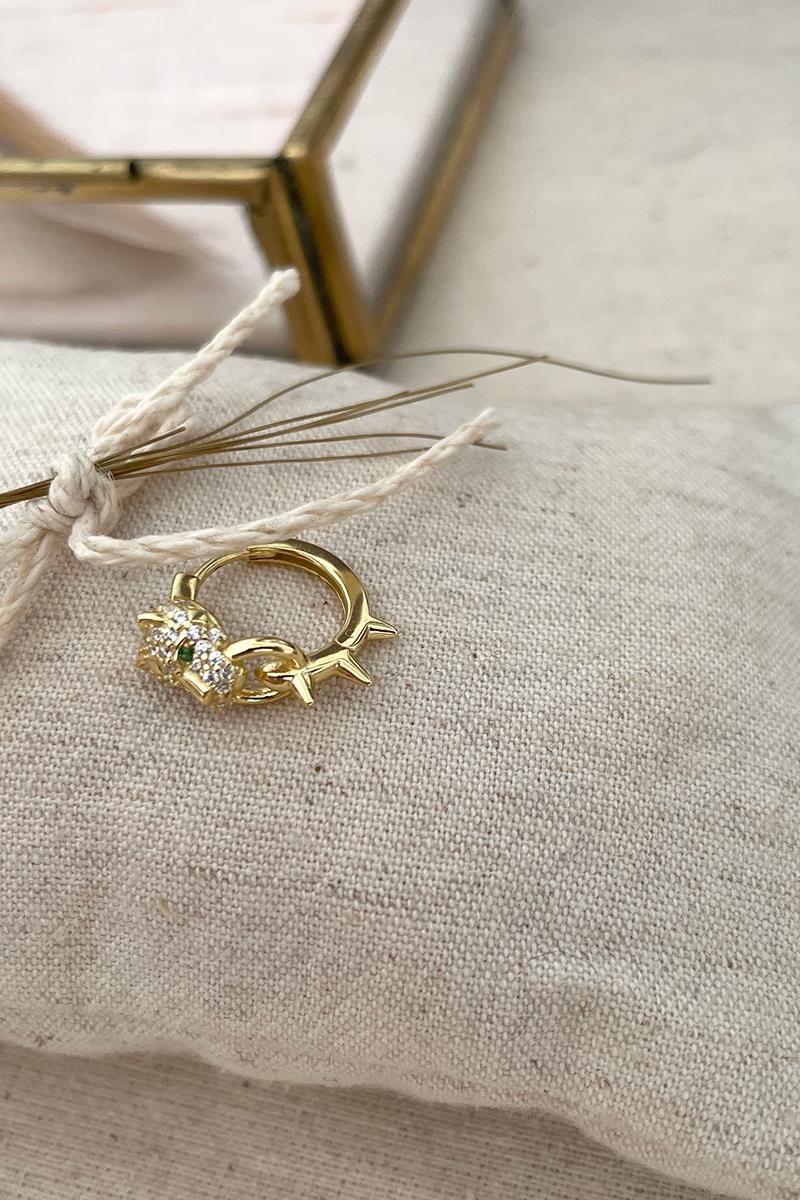 Aro pequeño con un jaguar decorado con circonitas, como detalle destacan las piedrecitas verdes de los ojos. Un pendiente pequeño, pero muy vistoso. Con cierre de click para mayor comodidad. Hecho de plata con baño de oro. Medida: 16 mm exterior, 10 mm interior. Se vende individualmente.