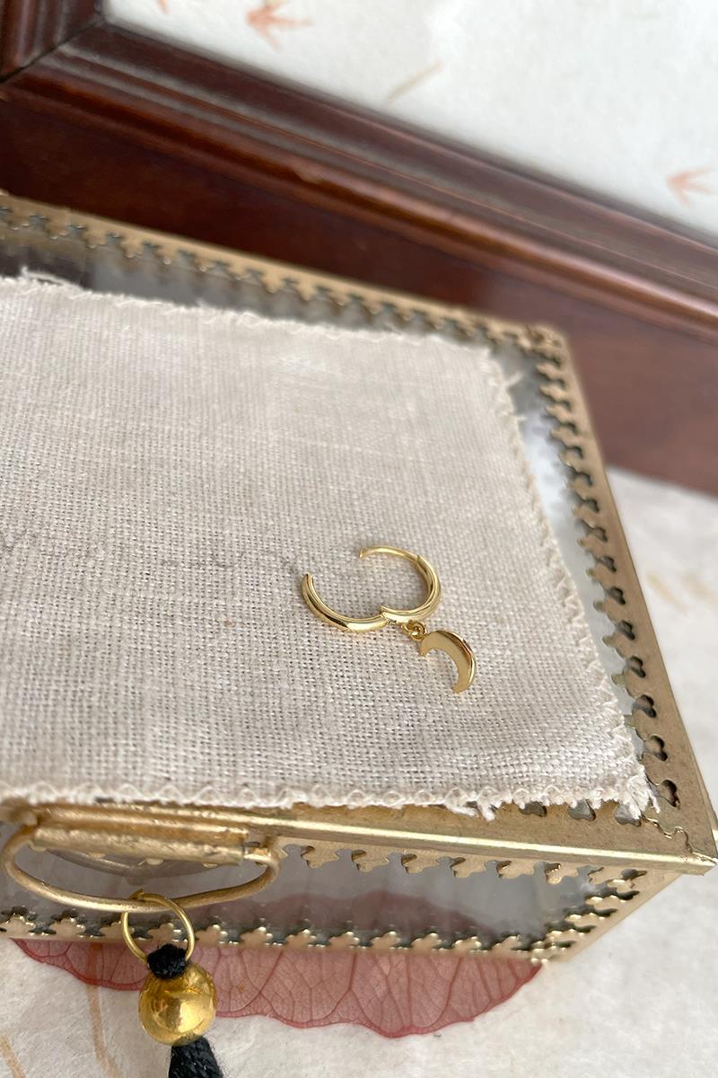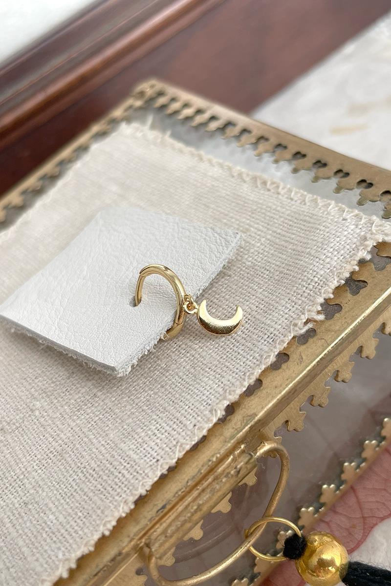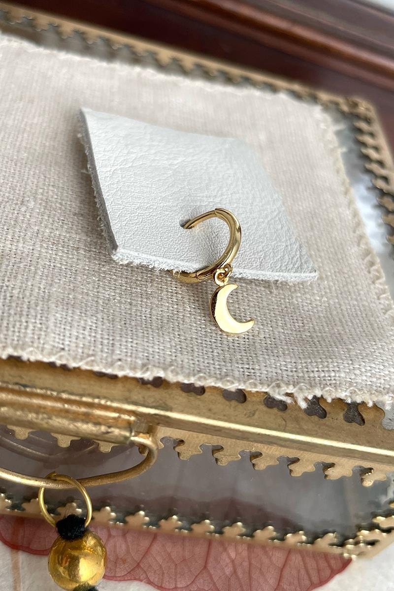 Aro pequeño con luna que cuelga. Perfecto para combinar otros modelos de pendientes con rayos, estrellas o lunas. Con cierre de click que te resultará muy fácil de poner y quitar. Es de plata rodiada. Se vende individualmente.
