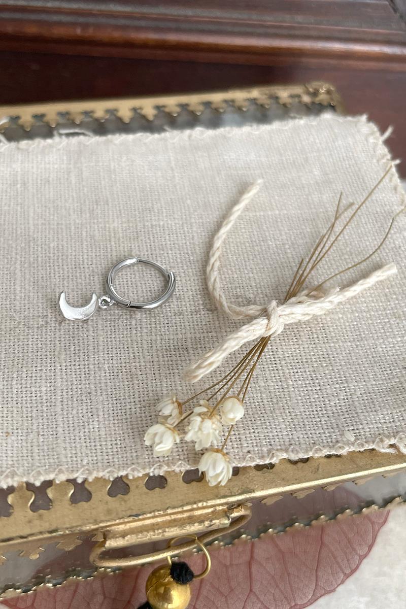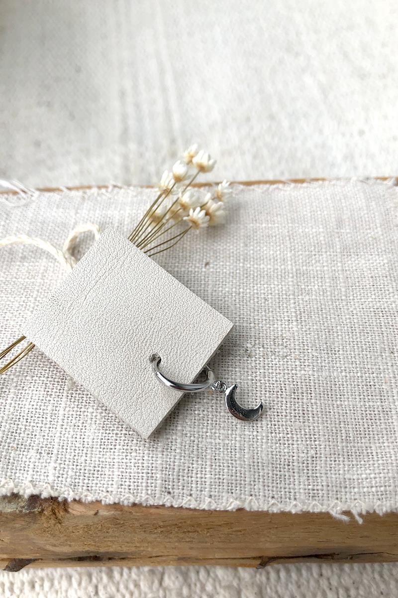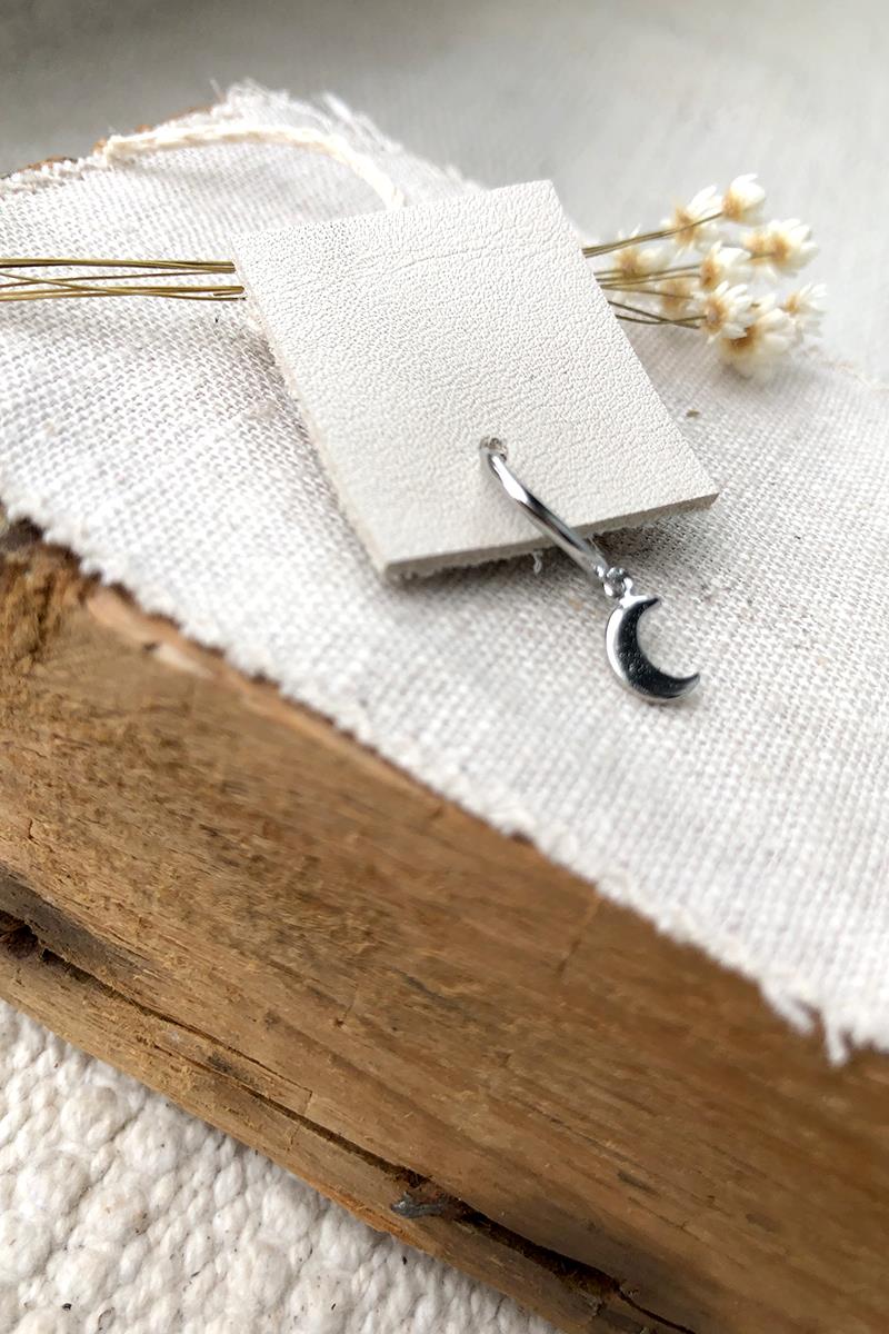 Aro pequeño con luna que cuelga. Perfecto para combinar otros modelos de pendientes con rayos, estrellas o lunas. Con cierre de click que te resultará muy fácil de poner y quitar. Es de plata rodiada. Se vende individualmente.