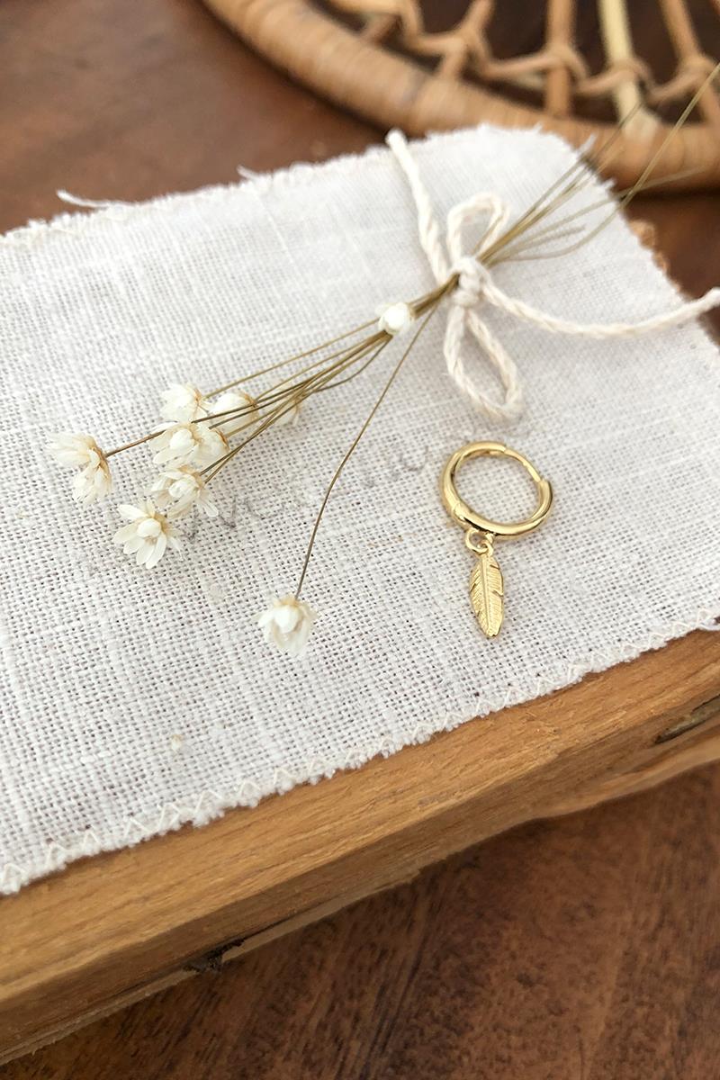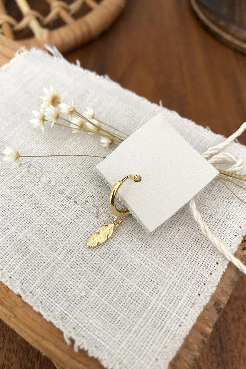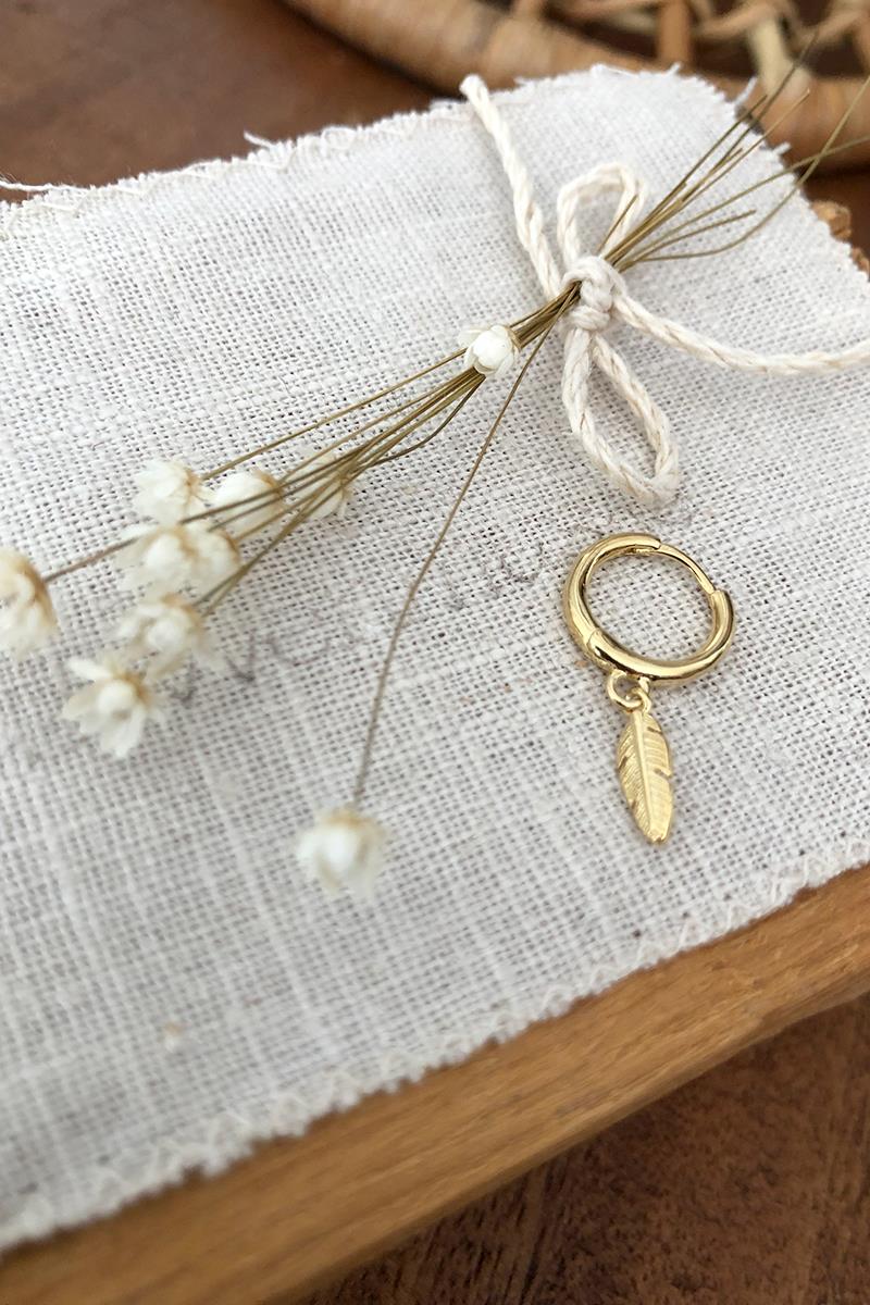 Aro pequeño con una pluma. Combínalo con otros aritos o pendientes solos de nuestra colección. El cierre es de click que resulta muy fácil de poner y quitar. Es de plata con baño de oro. Se vende individualmente.