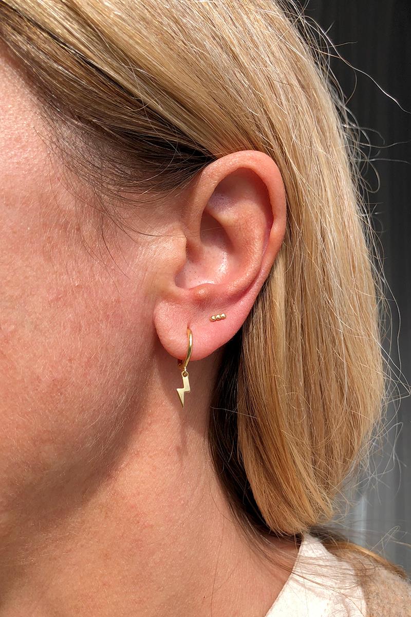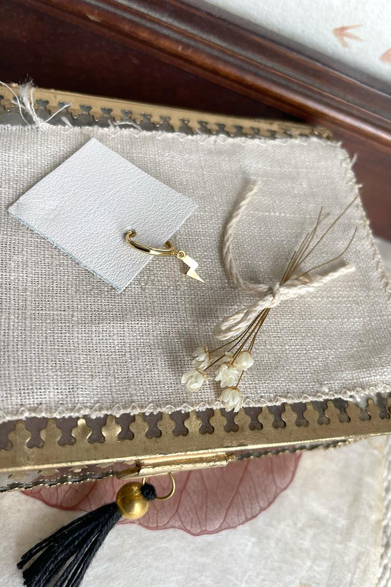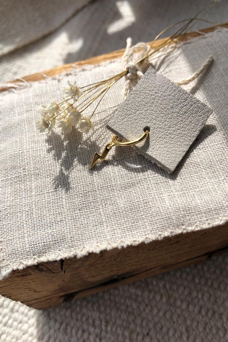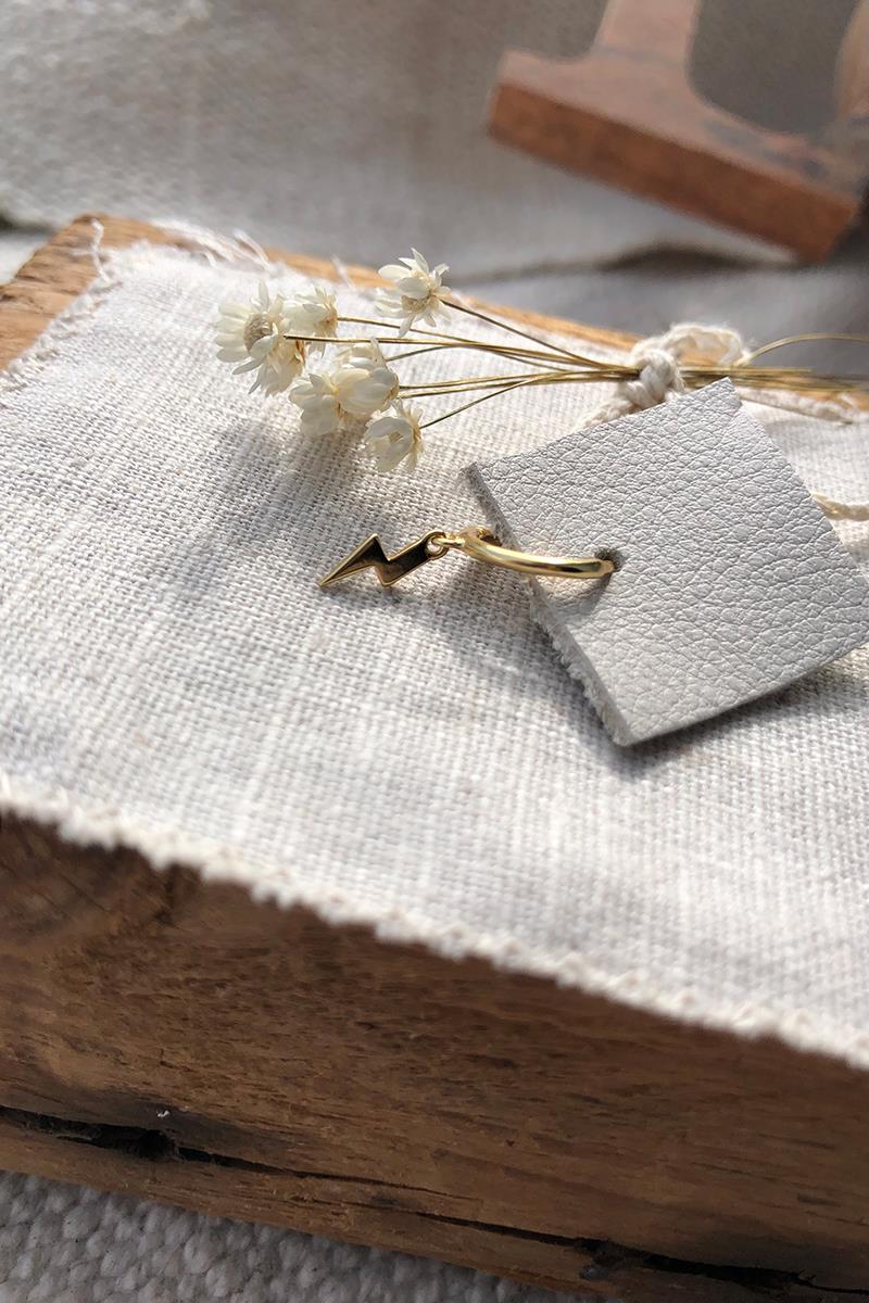Aro pequeño con rayo que cuelga. Perfecto para combinar otros modelos de pendientes con rayos, estrellas o lunas. Con cierre de click que te resultará muy fácil de poner y quitar. Es de plata con baño de oro. Se vende individualmente.