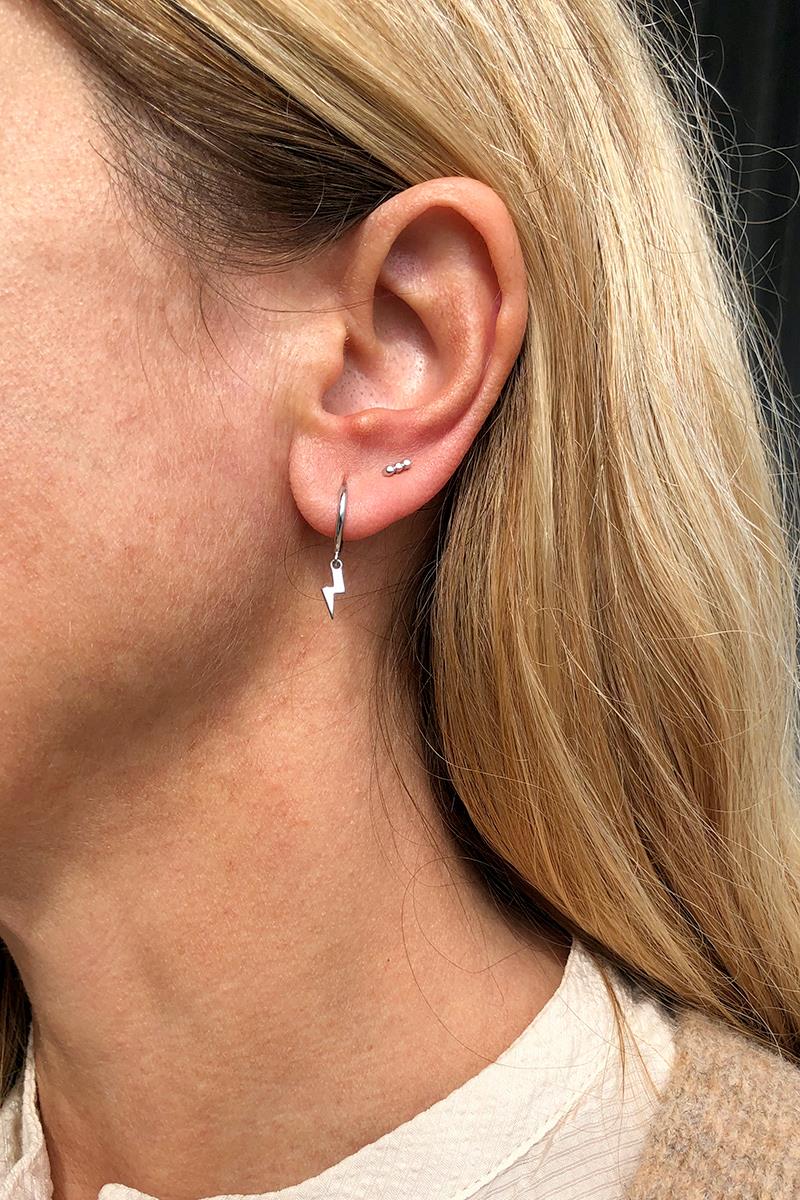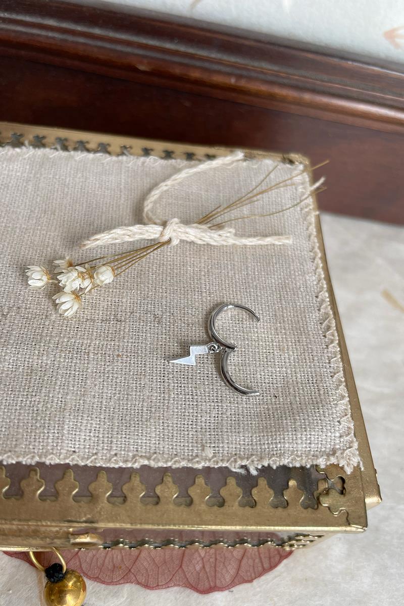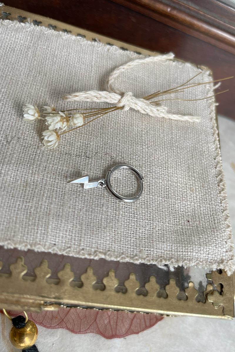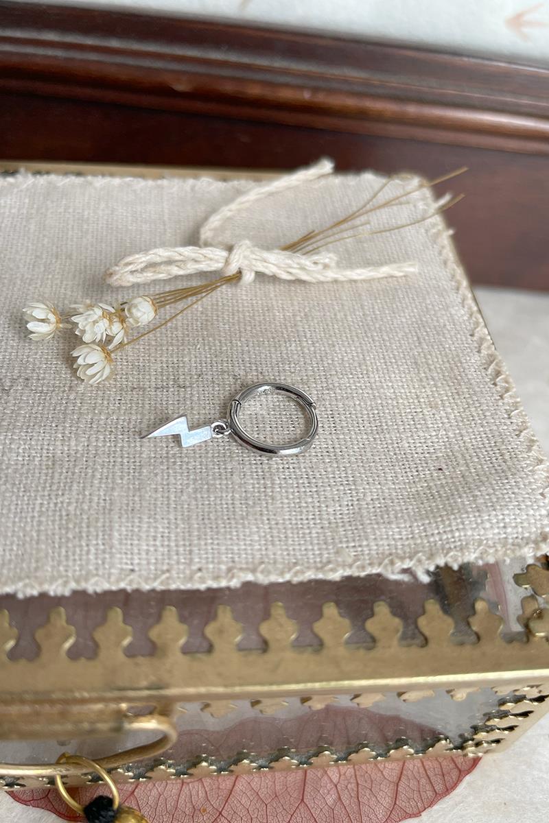 Aro pequeño con rayo que cuelga. Perfecto para combinar otros modelos de pendientes con rayos, estrellas o lunas. Con cierre de click que te resultará muy fácil de poner y quitar. Es de plata con baño de oro. Se vende individualmente.