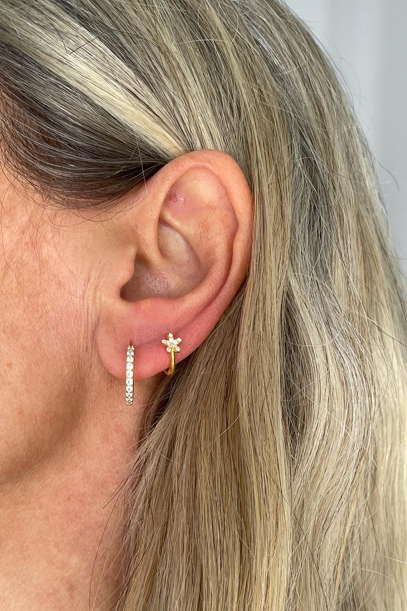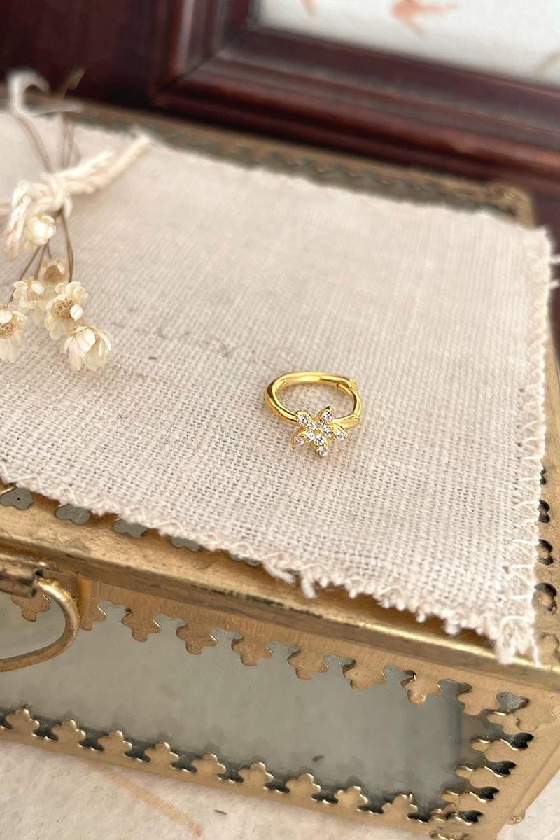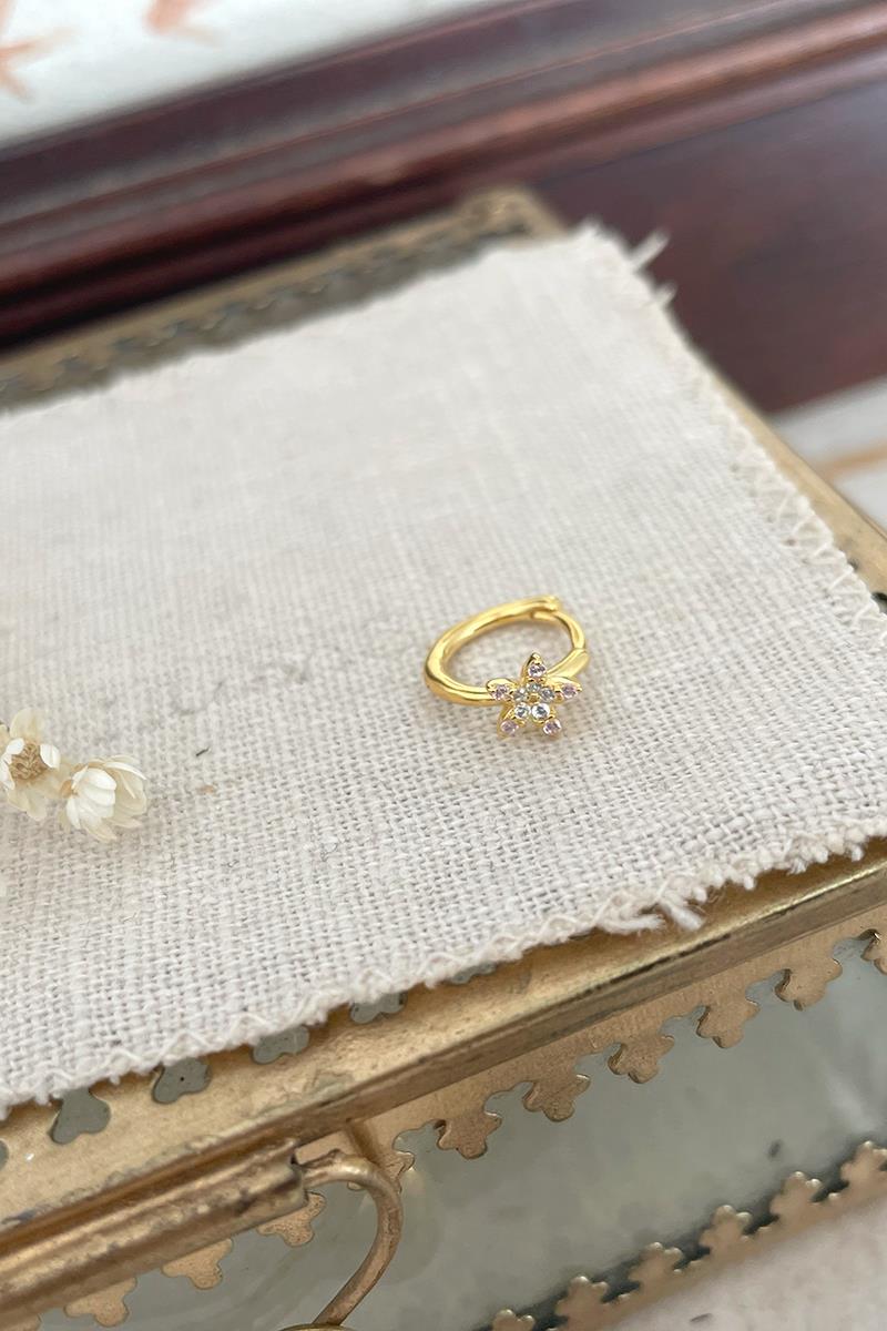 Arito con pequeña estrella decorada con circonitas. Ideal para segundas y posteriores perforaciones, te servirá para la perforación principal siempre y cuando no esté demasiado arriba y/o tengas el lóbulo chiquitín. Muy fácil de poner y quitar gracias al cierre de click. Es de plata con baño de oro. Se vende individualmente.