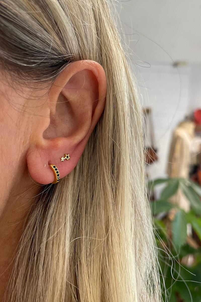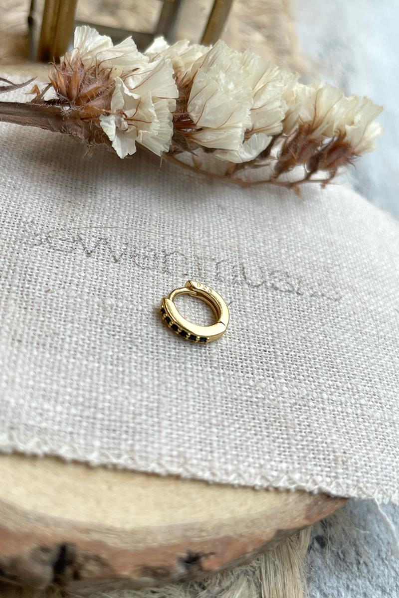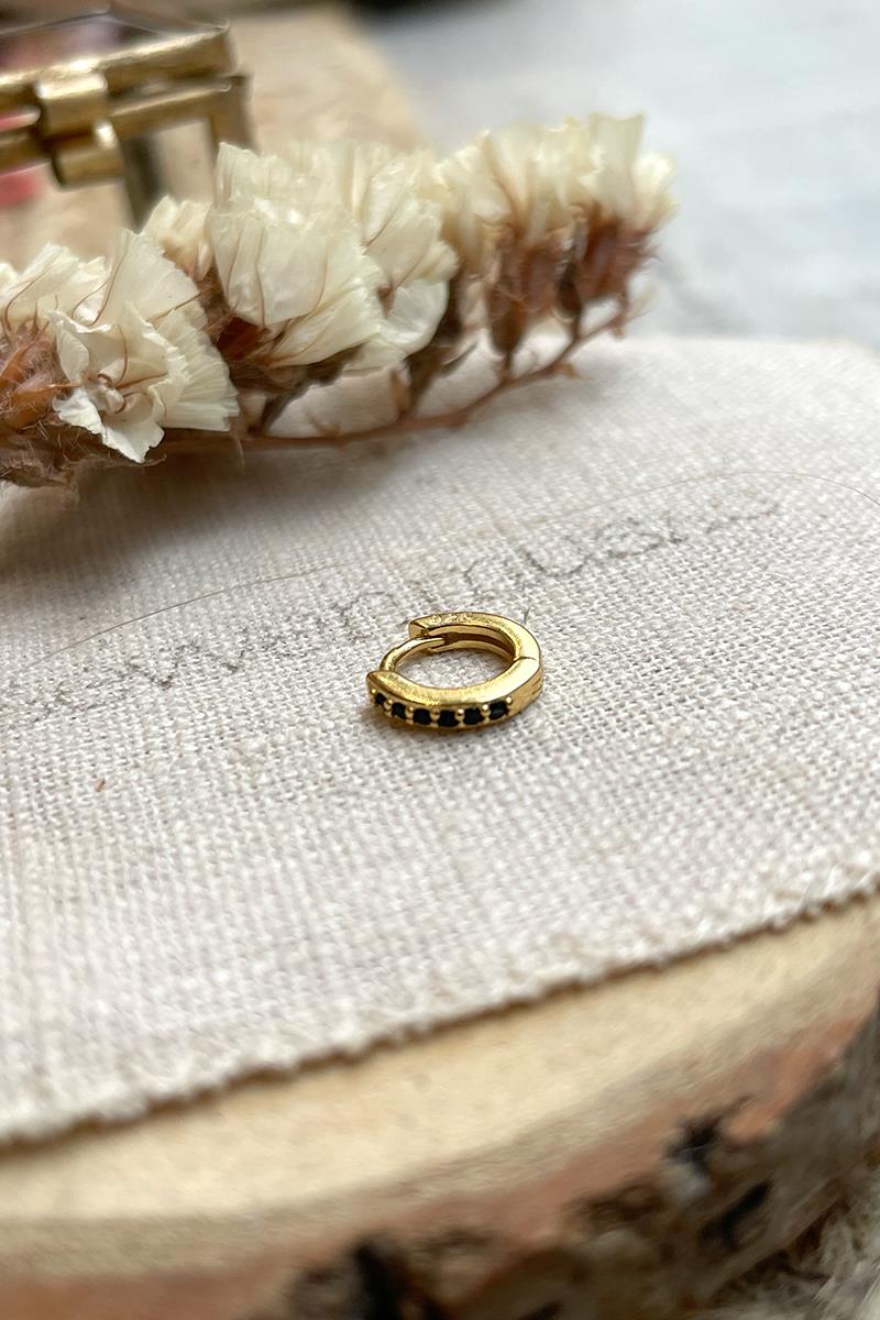 Aro pequeño con mini circonitas negras. Un pendiente delicado y sutil a la vez. Perfecto para combinar otros aritos o pendientes de nuestra colección. Con cierre de click que te resultará muy fácil de poner y quitar. Ten en cuenta que por su medida puede ser apropiado para cualquier perforación siempre y cuando tu lóbulo sea pequeño o tengas las perforaciones cerca del borde. Es de plata con baño de oro. Medida 10mm exterior, 6mm interior. Se vende individualmente.