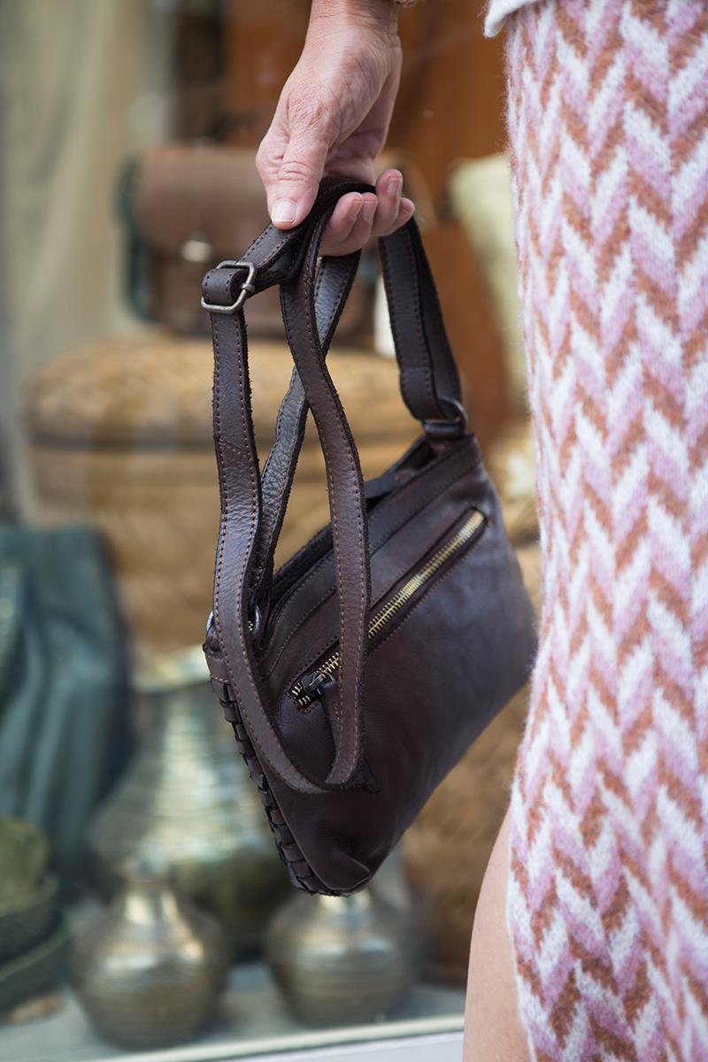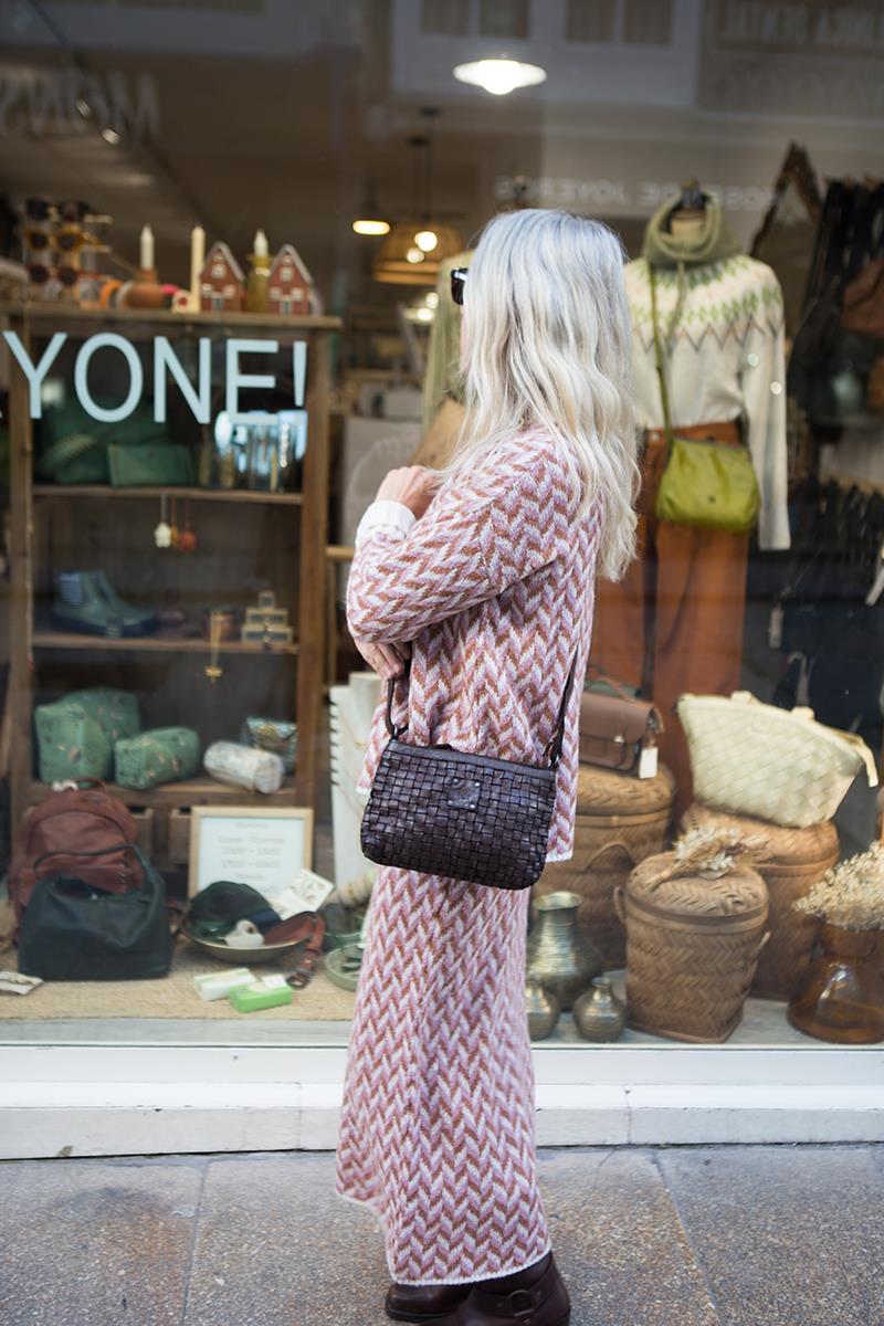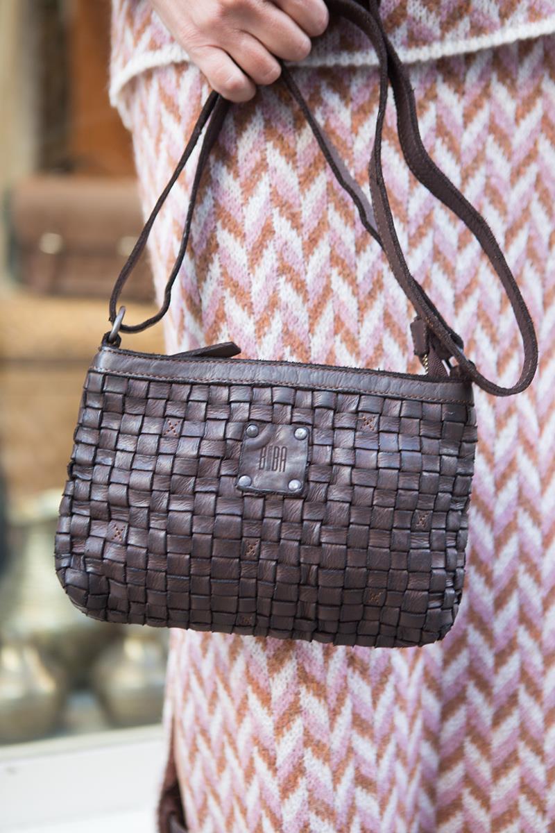 Un bolsito pequeño con forma de bandolera color marrón. Perfecto cuando quieres llevar una pieza que no ocupe y en la que te quepa lo imprescindible. Es muy ligero y cómodo. Hecho con piel de vacuno con un bonito trenzado en la parte delantera, que resulta suave, flexible y muy agradable al tacto. La parte trasera es de piel lisa y dispone de un bolsillo de cremallera para poder acceder con facilidad a aquellas cosas que necesites tener a mano. Con banda regulable para poder ponerlo a la altura deseada. El interior está forrado con tela a juego y tiene un bolsillo con cremallera. Se cierra con cremallera.