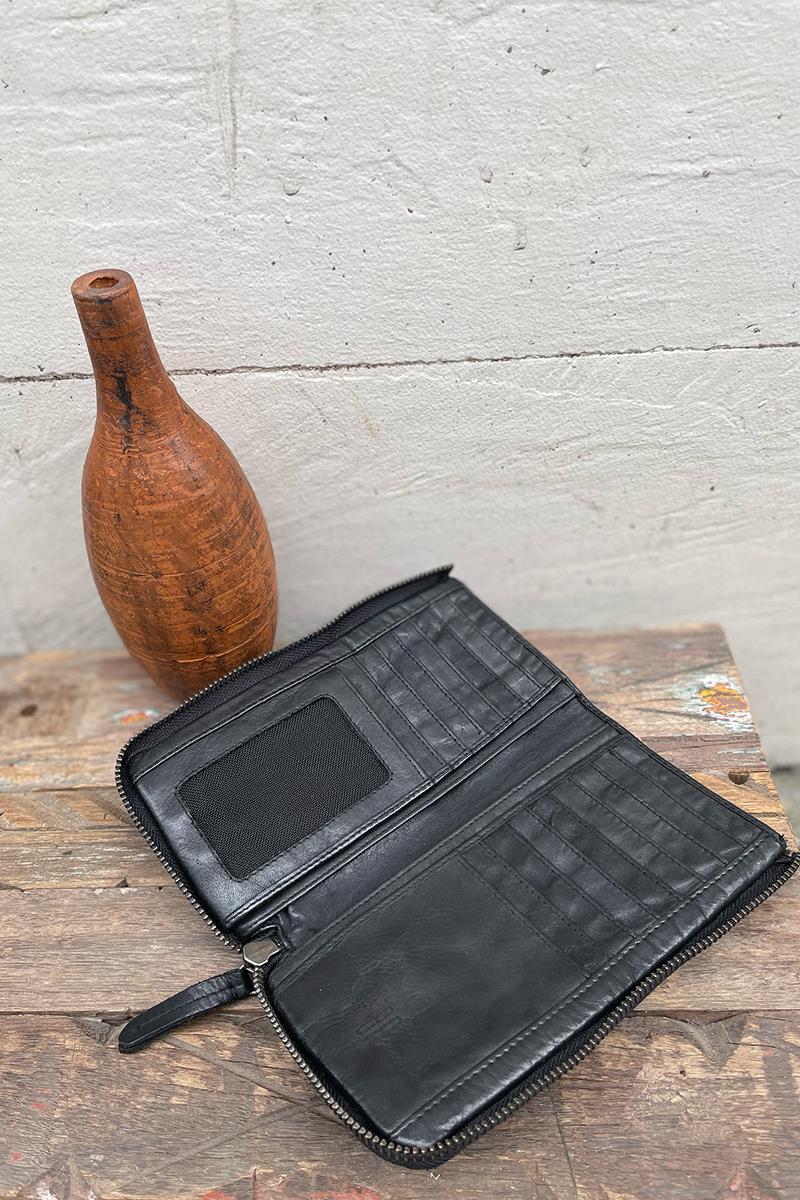 Una cartera de piel lavada ligera y muy funcional. Es ideal para llevar todos tus tarjetas y documentación de una manera ordenada y fácil de encontrar. En la parte interna tiene una gran cantidad de departamentos y divisiones que te permitirá organizar adecuadamente todo lo que necesites llevar. Se cierra con cremallera. En la parte externa tiene un departamento con cierre de broche y un bolsillo de cremallera. Ten en cuenta que las pieles lavadas pueden tener pequeñas marcas o imperfecciones.