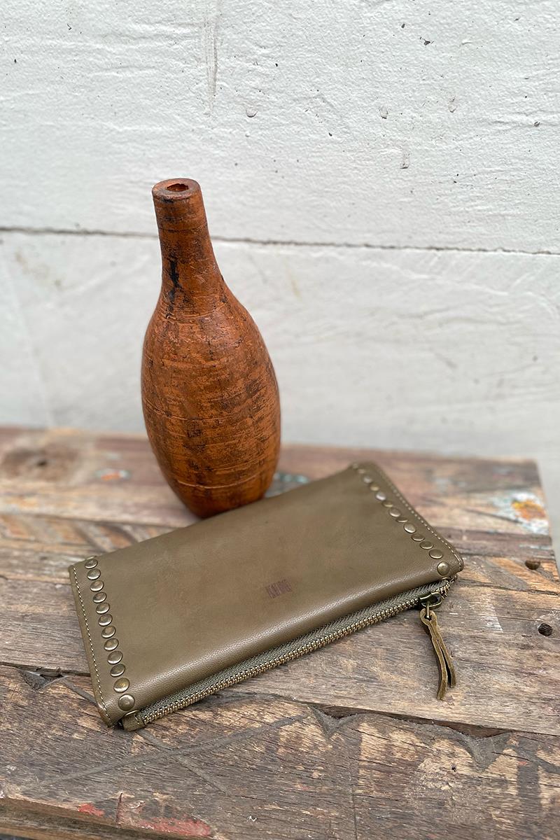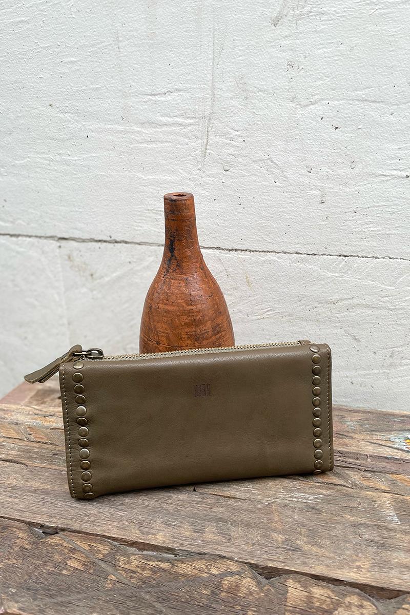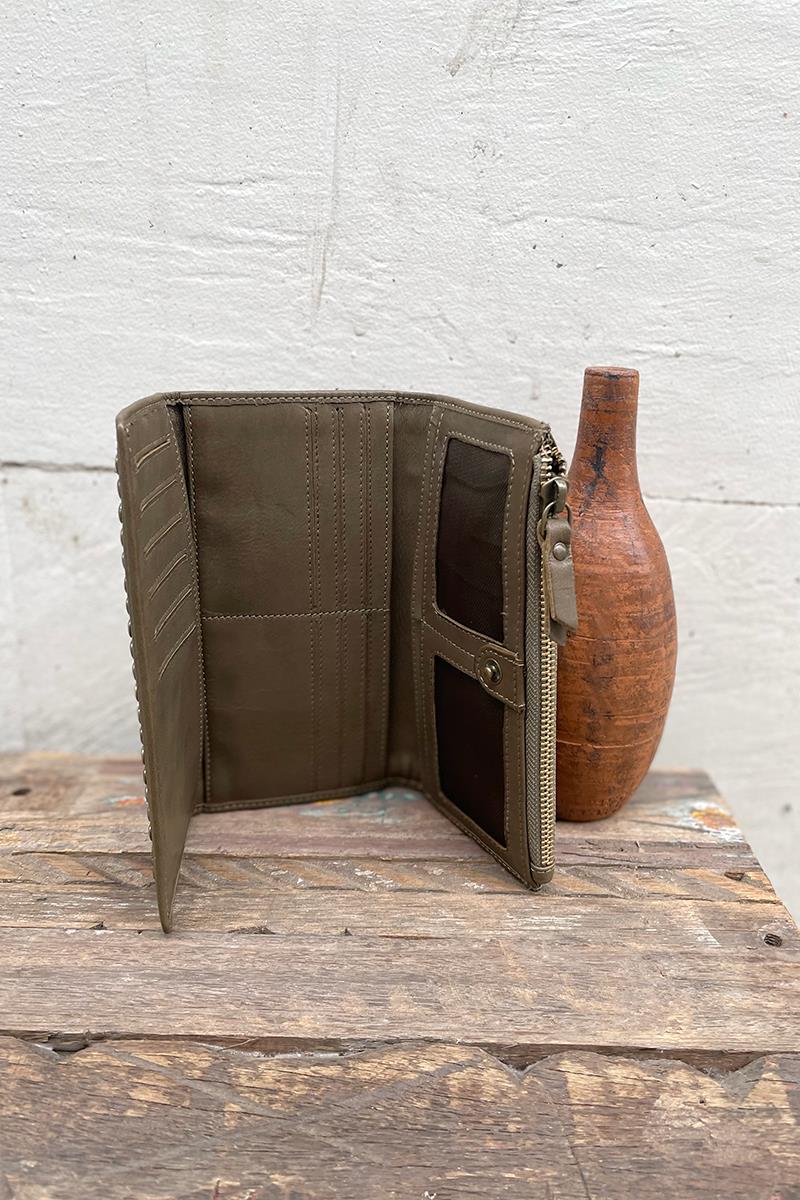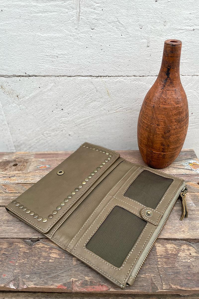 Una cartera de piel decorada con tachuelas. Es de tamaño grande, perfecta si quieres llevar contigo todos tus tarjetas y carnets. Se dobla en tres partes, en el interior tiene varias divisiones para tarjetas y algunos departamentos a lo largo perfectos para llevar los billetes estirados. Tiene además un bolsillo de cremallera con un tirador de piel al que puedes acceder si necesidad de abrirla.