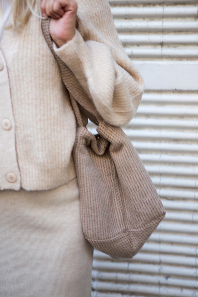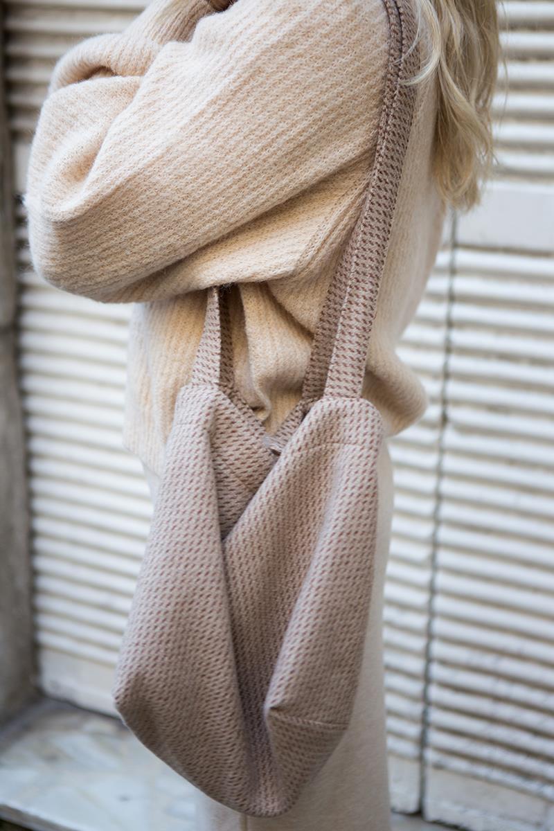 Bolsa tipo shopper en tonos tostados. Con un tejido muy agradable y suave. Es muy ligera y espaciosa, perfecta si necesitas llevar contigo muchas cosas. El cierre es doble, con imanes, podrás cerrar los dos quedando como una bombonera o si cierras sólo uno tiene forma de shopper. Tiene asas largas que te resultarán muy cómodas para llevarlo al hombro.