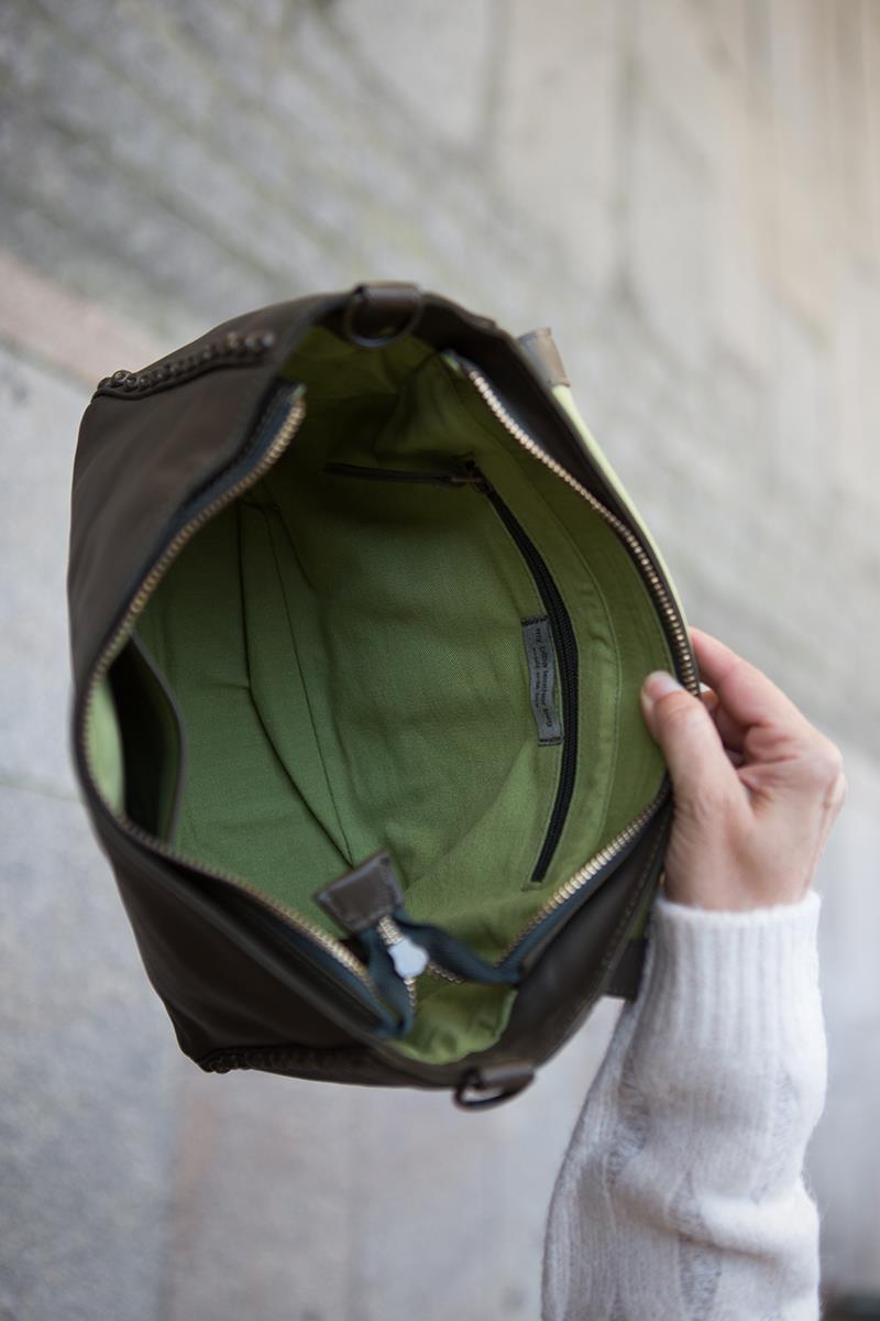 Un bolso de piel verde decorado con tachuelas. Un modelo estiloso, versátil y atemporal que te resultará muy cómodo y práctico gracias a su tamaño medio. Tiene dos asas diferentes que además se pueden quitar, con lo que podrás usarlas en otros bolsos. El asa corta con tachuelas es perfecta para llevarlo en la mano o al hombro y la tira tipo bandolera regulable es ideal para llevarlo cruzado o largo. Para poder acceder con comodidad a tus llaves o teléfono, cuenta con un bolsillo exterior de cremallera. El interior está forrado con tela a juego contiene un bolsillo de cremallera y otro abierto. Cierre de cremallera y tapa con imán.