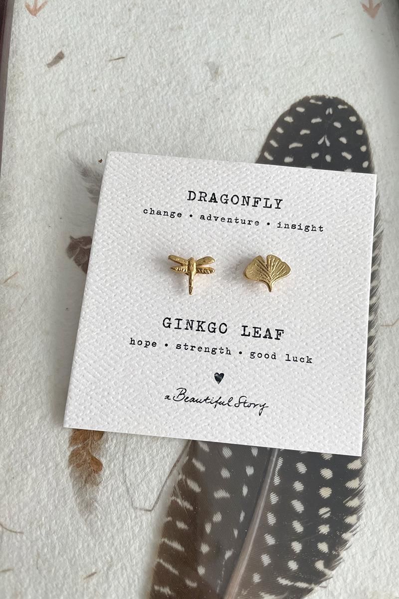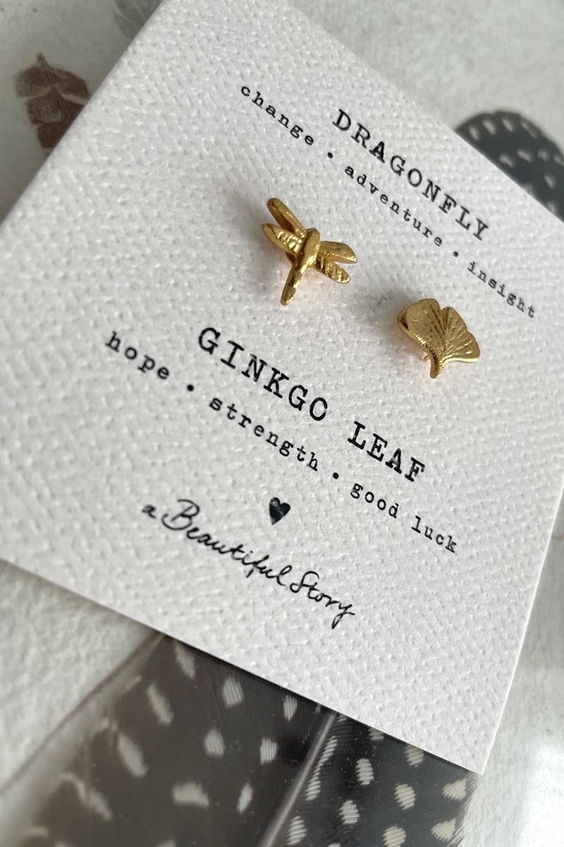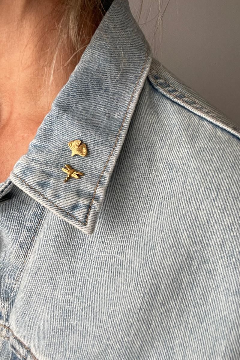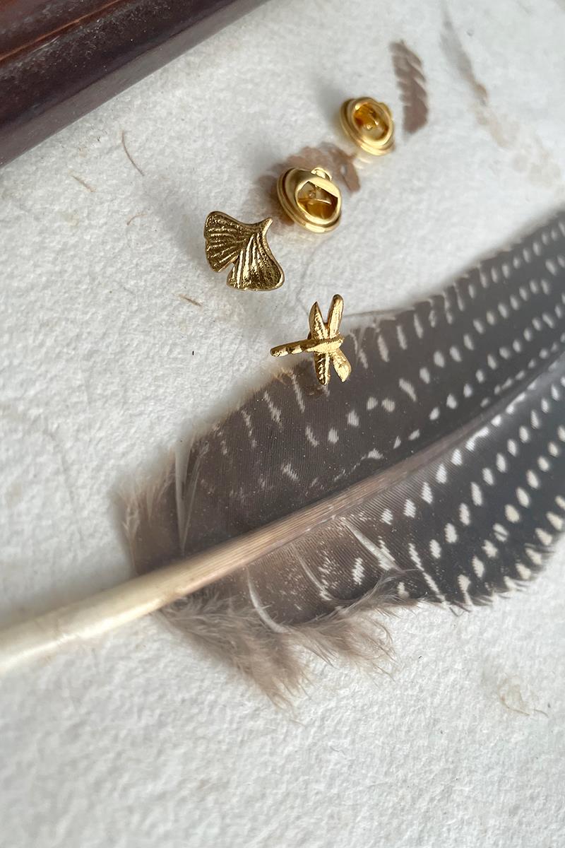 Una combinación ideal de dos pequeños broches sencillos y vistosos, perfectos para ponerte en tus prendas favoritas. Un regalo original para alguien especial o para tí mismo. La libélula simboliza el cambio, la aventura y la percepción. El ginkgo representa la esperanza, la fuerza y la buena suerte. Es de latón con acabado dorado y tiene cierre tipo pin. Medidas: 1,2 cm.