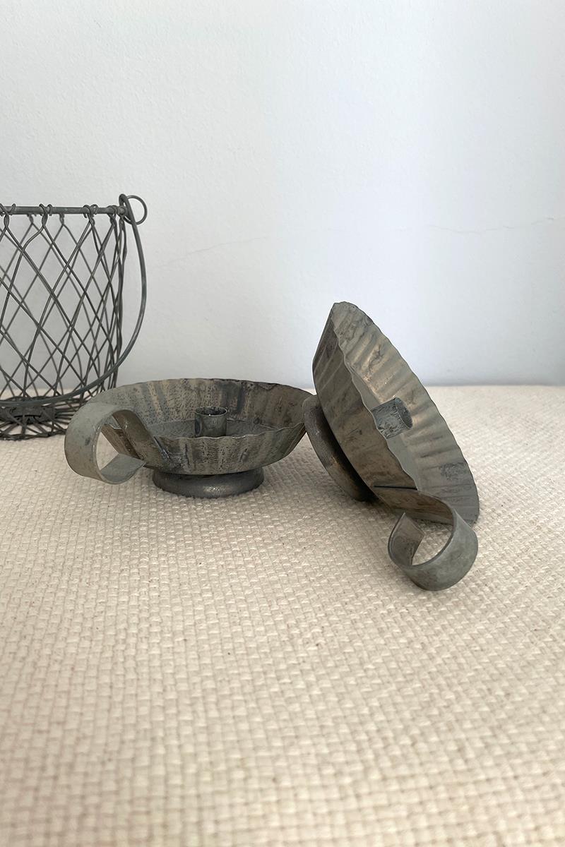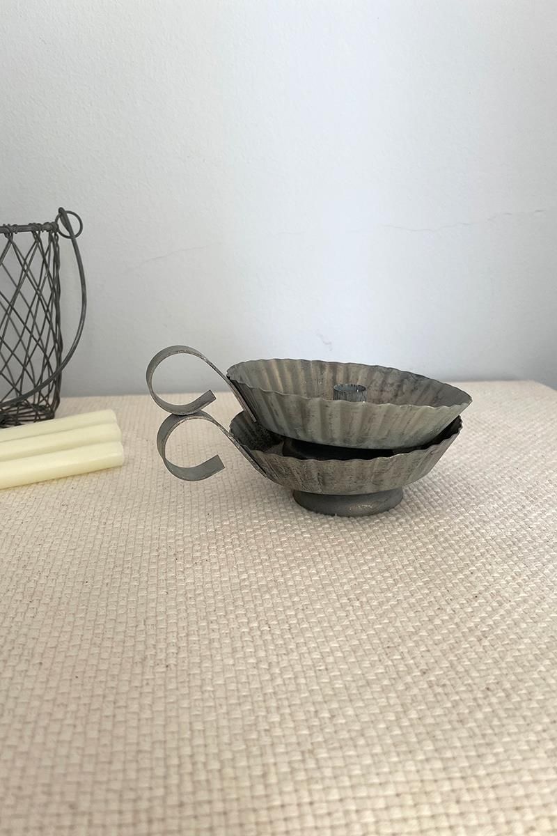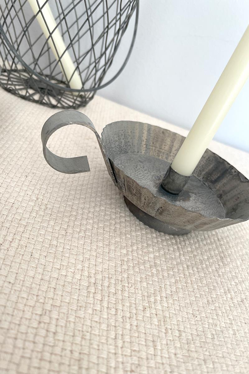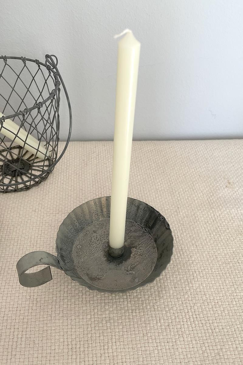 Candil de zinc pequeño con asa, de aspecto rústico y antiguo. Ten encuenta que es un material sin acabados por lo que puede presentar diferentes tonalidades o ligeras manchas. Está hecho para velas finas de unos 13mm de diámetro.. La vela no está incluida.