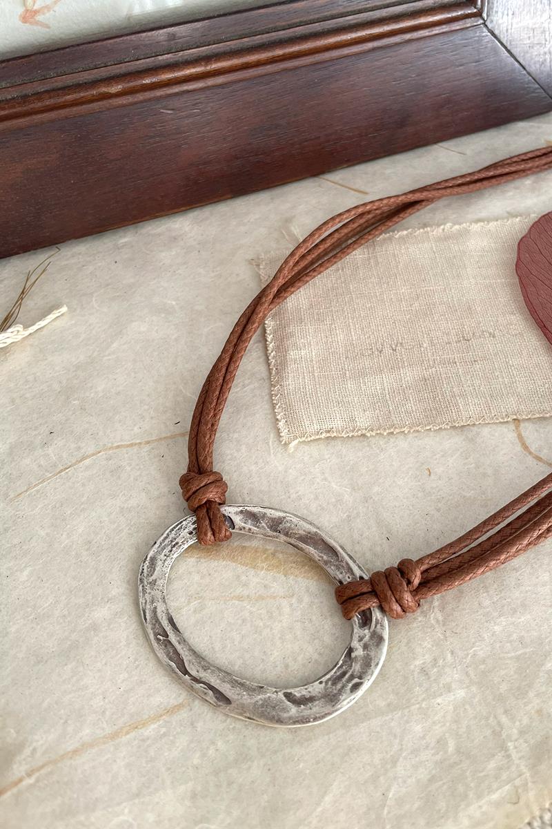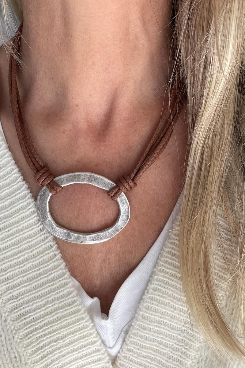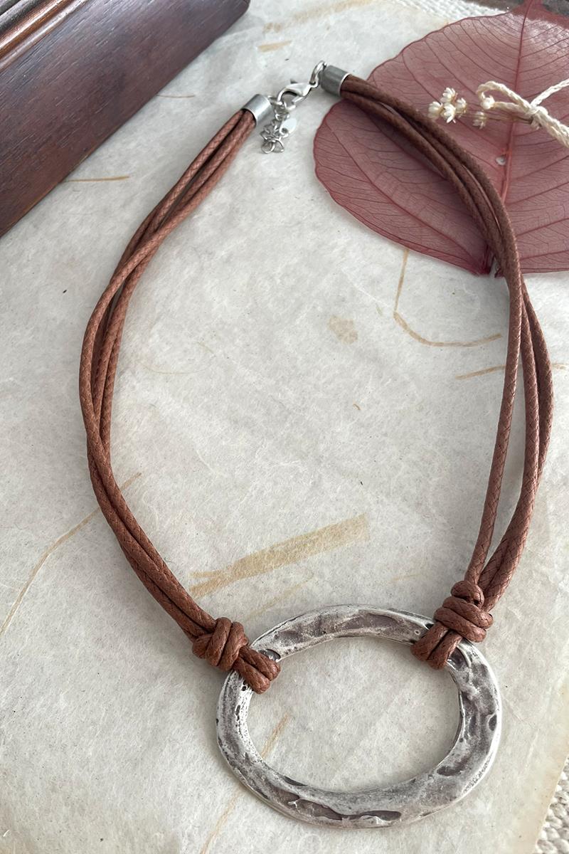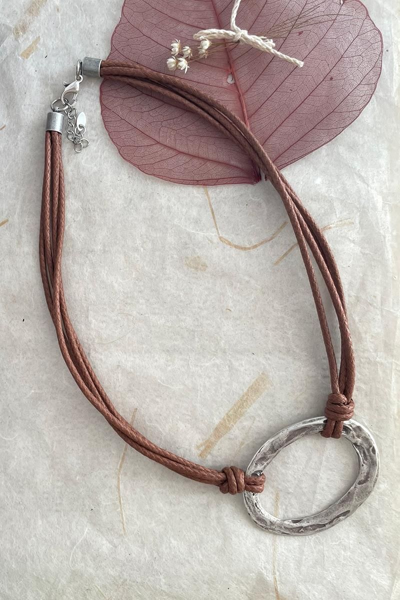 Collar corto con una pieza ovalada anudada con cordones de algodón encerado en tono marrón. Es un collar sencillo, de estilo minimalista pero muy vistoso, perfecto si te gustan las piezas con presencia y poco recargadas. Queda genial tanto encima de tus prendas cerradas como con escotes. Las piezas metálicas son de zamac y/o latón plateado envejecido.