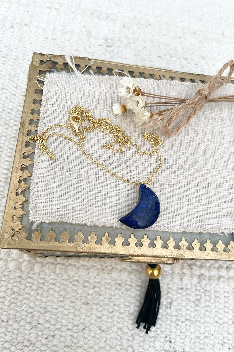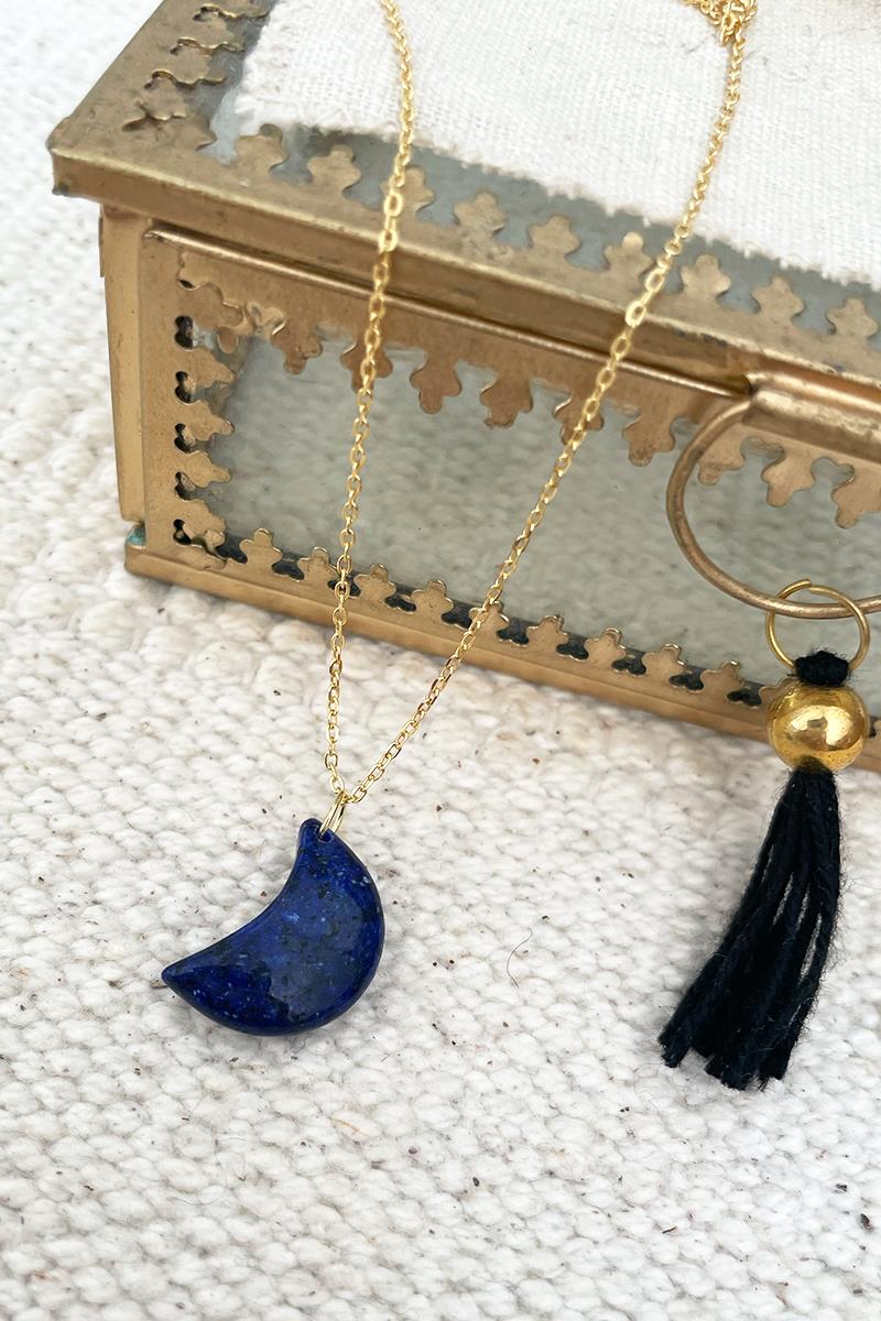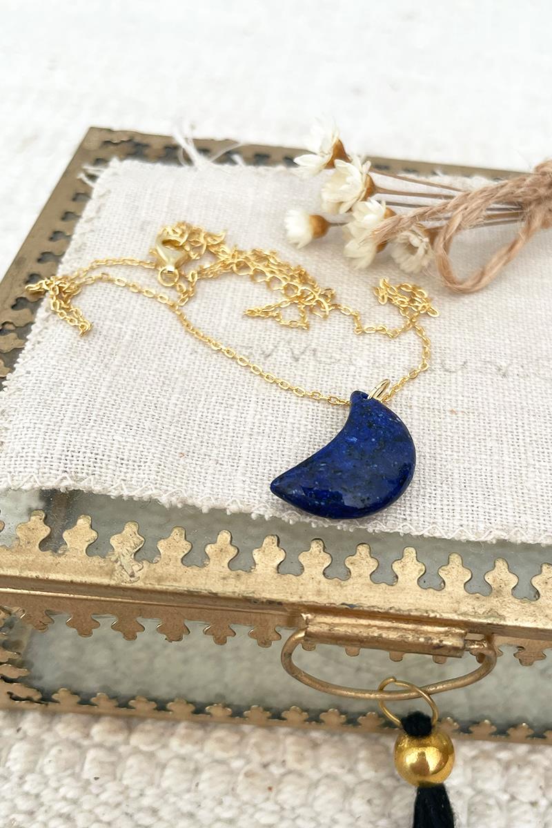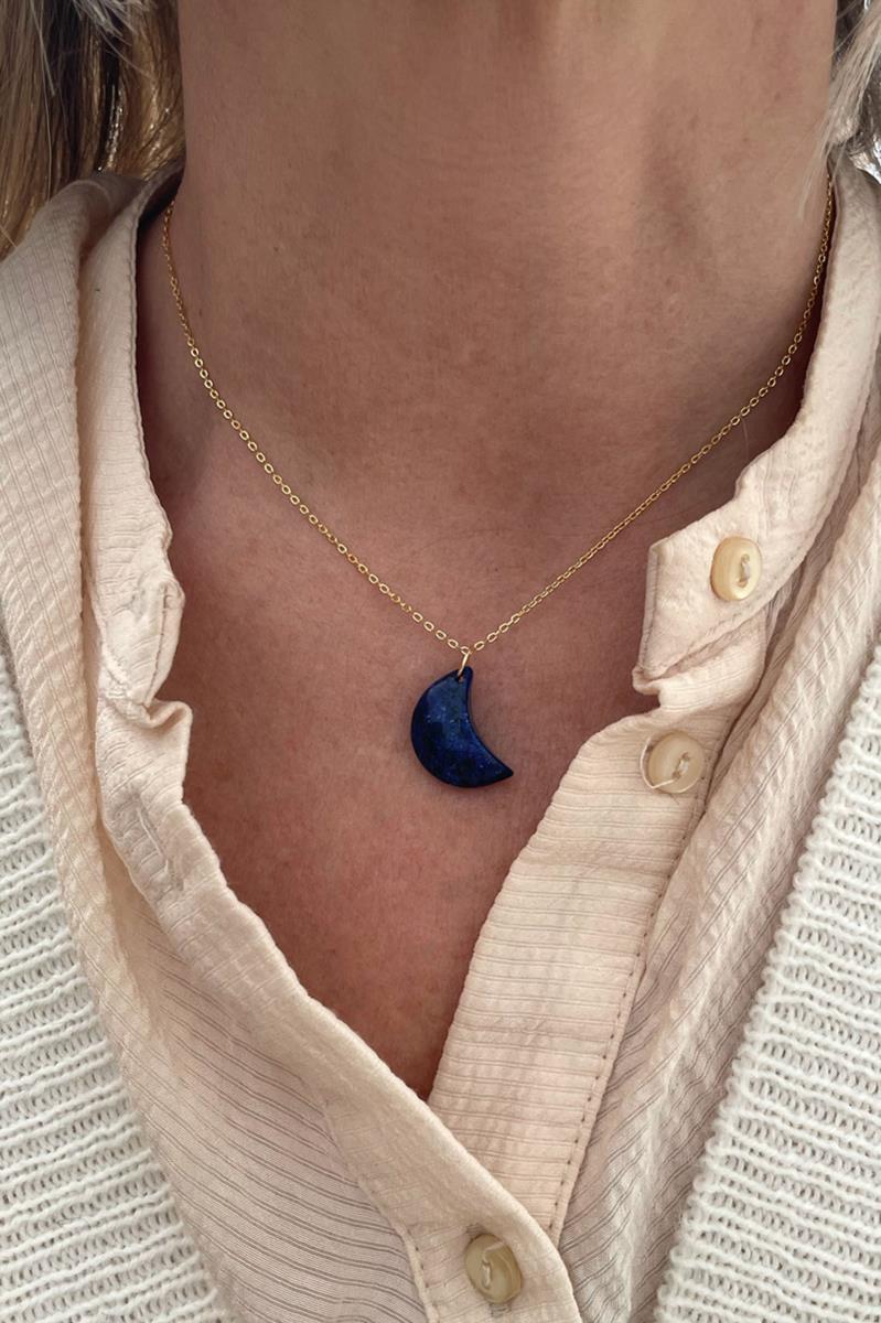 Collar con una luna de lapislázuli en una cadena finita. Un colgante sutil y delicado ideal para el día a día. Te quedará genial tanto si lo llevas solo como si lo combinas con otros collares de nuestra colección. Podrás ponerlo a la altura que desees gracias a la ampliación. Es de plata con baño de oro.