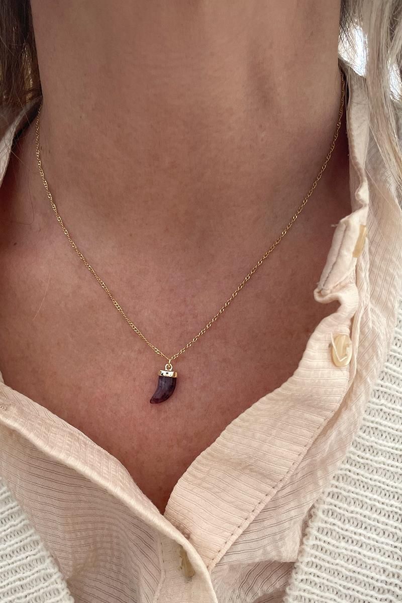 Collar con un pequeño cuerno de amatista en una cadena finita. Un colgante sutil y delicado ideal para el día a día. Te quedará genial tanto si lo llevas solo como si lo combinas con otros collares de nuestra colección. Es de plata con baño de oro. Ten en cuenta que se trata de piezas extraídas de la naturaleza y que no hay dos exactamente iguales, por eso la que recibas puede ser ligeramente diferente a la de las fotos.