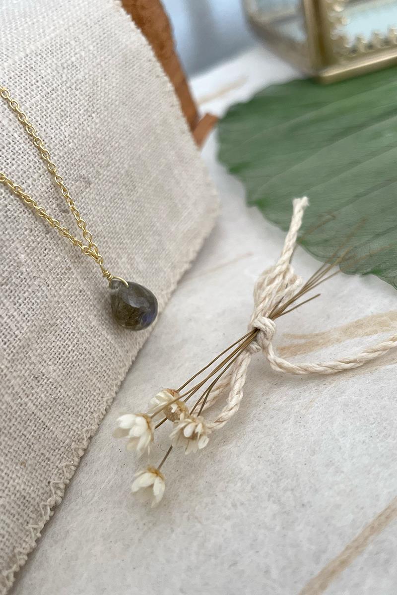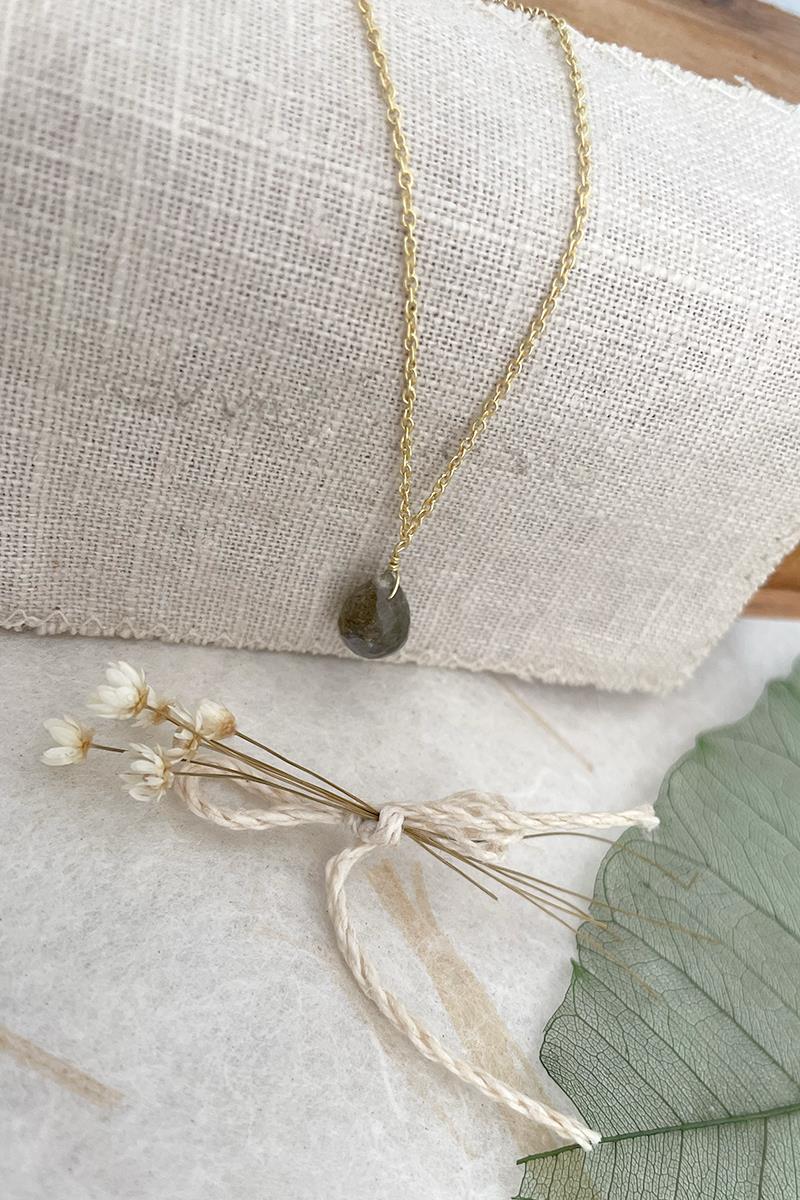 Una gota cuadrada de labradorita sobre cadena fina. Un collar sutil y delicado, perfecto para llevar solo o combinarlo con otros de nuestra colección. Todos los detalles metálicos son de latón dorado, libre de níquel, chapado en oro de 1 micra y 18kt sometido a un lacado electrolítico e-coating para mayor duración. Ten en cuenta que por su propia naturaleza cada gema es única, por lo que aquella que recibas puede ser ligeramente diferente a la de la foto.