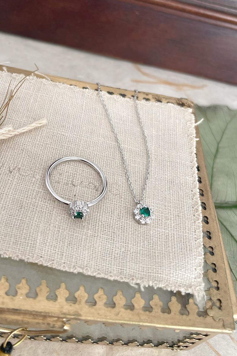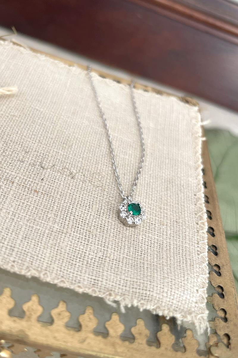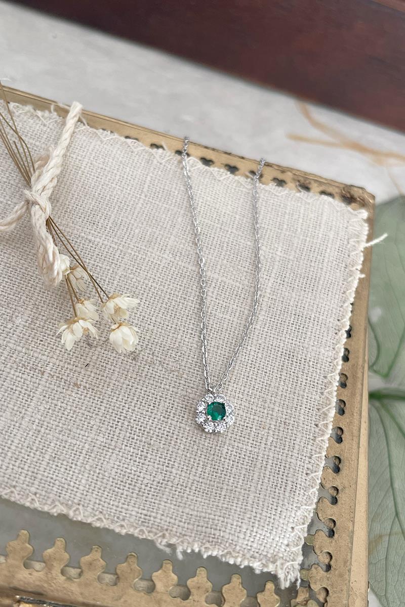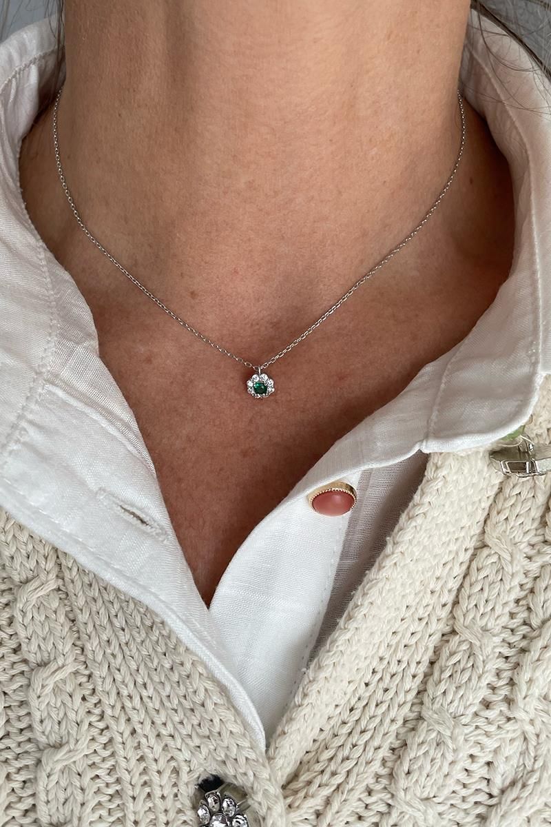 Un collar sencillo y sutil, ideal para el día a día. Con una pieza redonda de circonitas transparentes y un brillo verde que nos recuerda a las joyas de nuestras abuelas. Cadena fina dorada. Es perfecto para llevar solo o combinarlo con otros collares de nuestra colección. Disponible el anillo haciendo juego. Es de plata con baño de rodio.