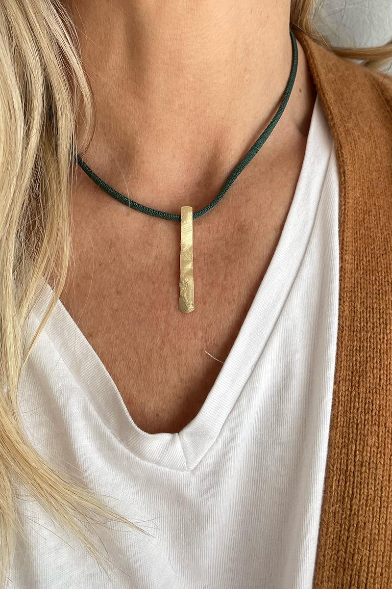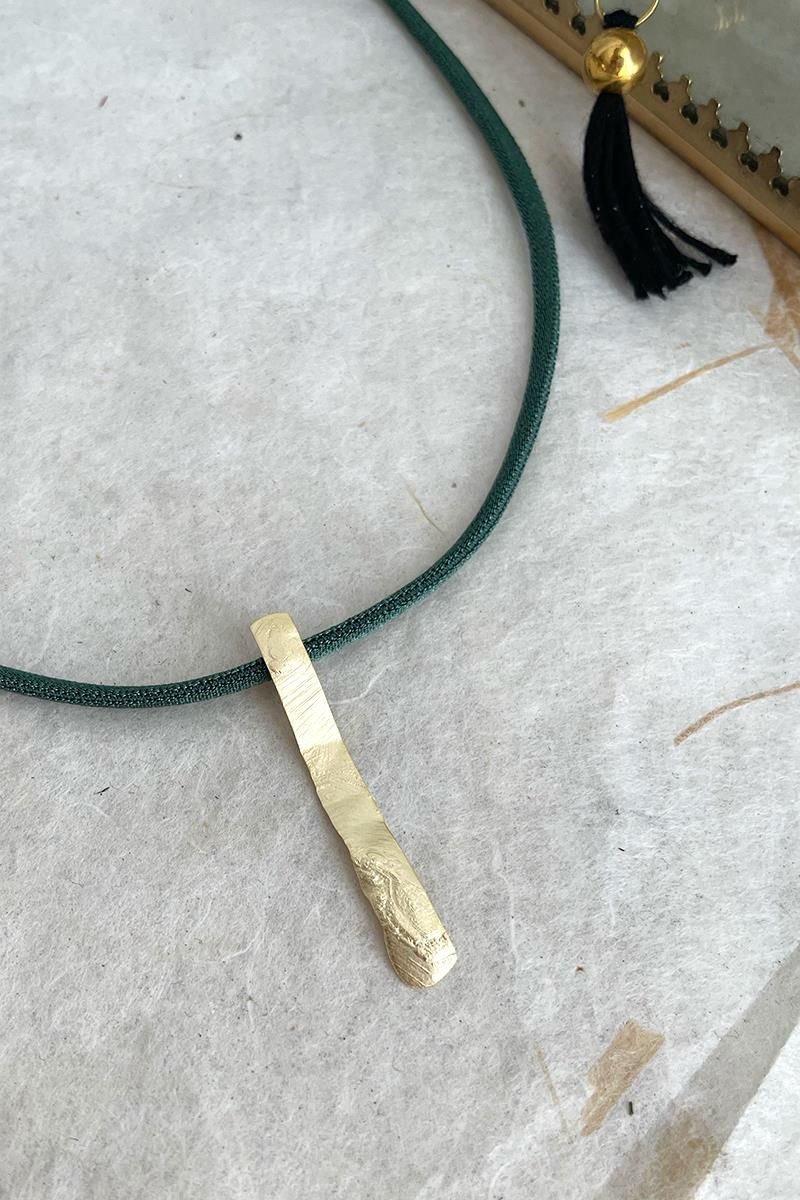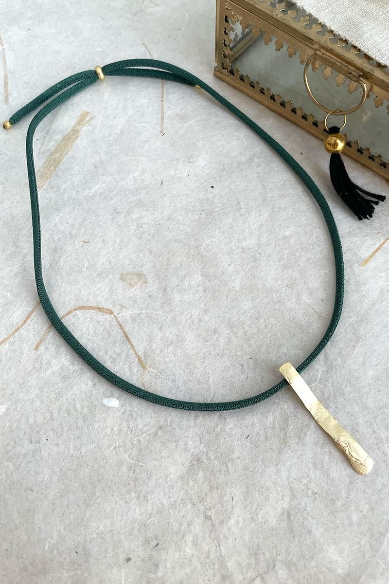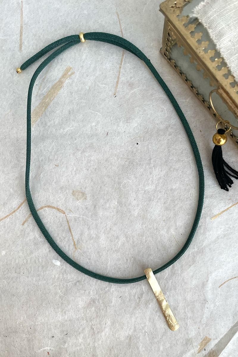 Collar corto con cordón verde oscuro y una pieza alargada. Una pieza hecha con cordón elástico, que además es regulable. Es un collar sencillo, de estilo minimalista pero muy vistoso, perfecto si te gustan las piezas con presencia y poco recargadas. Perfecto para poner sobre tus prendas cerradas o con escotes. Las piezas metálicas son de zamac y/o latón dorado.