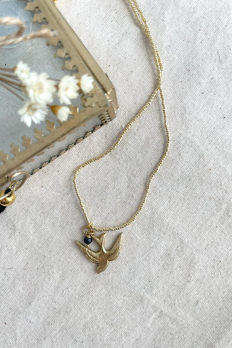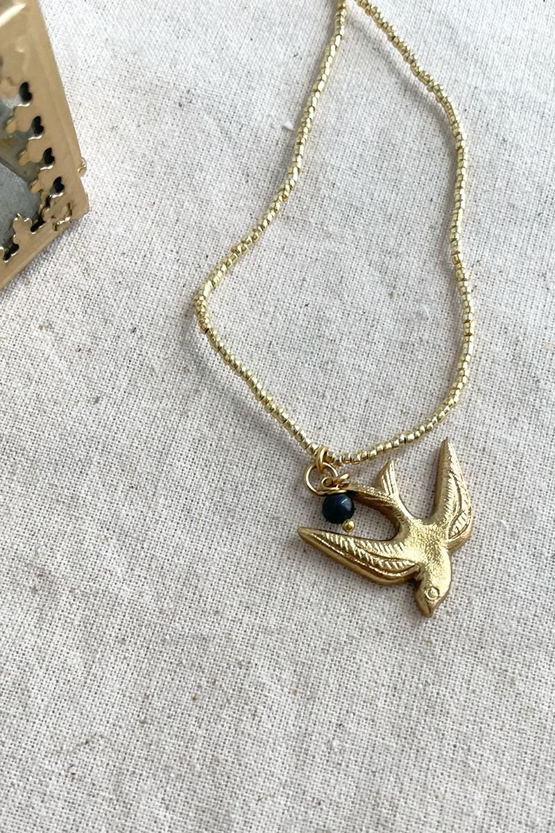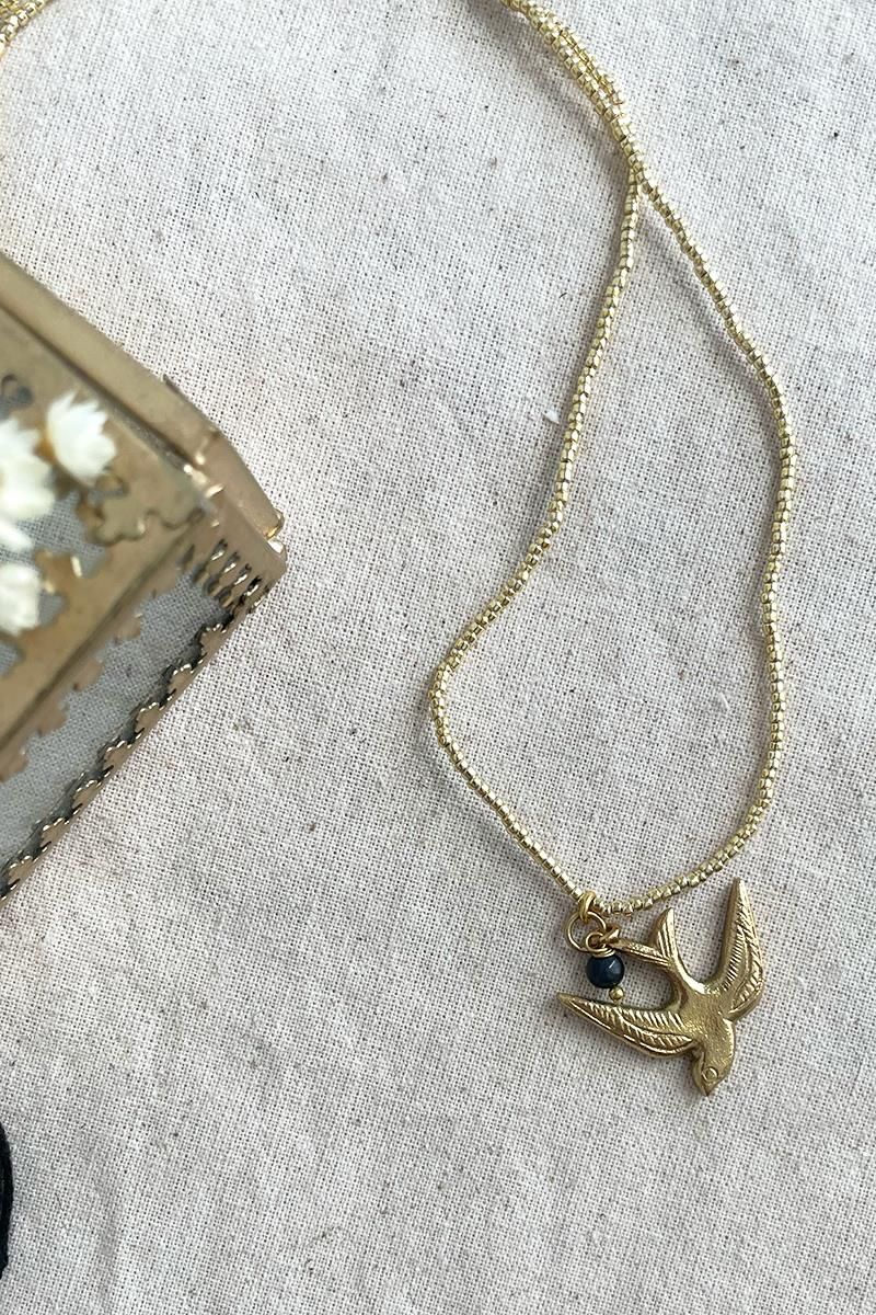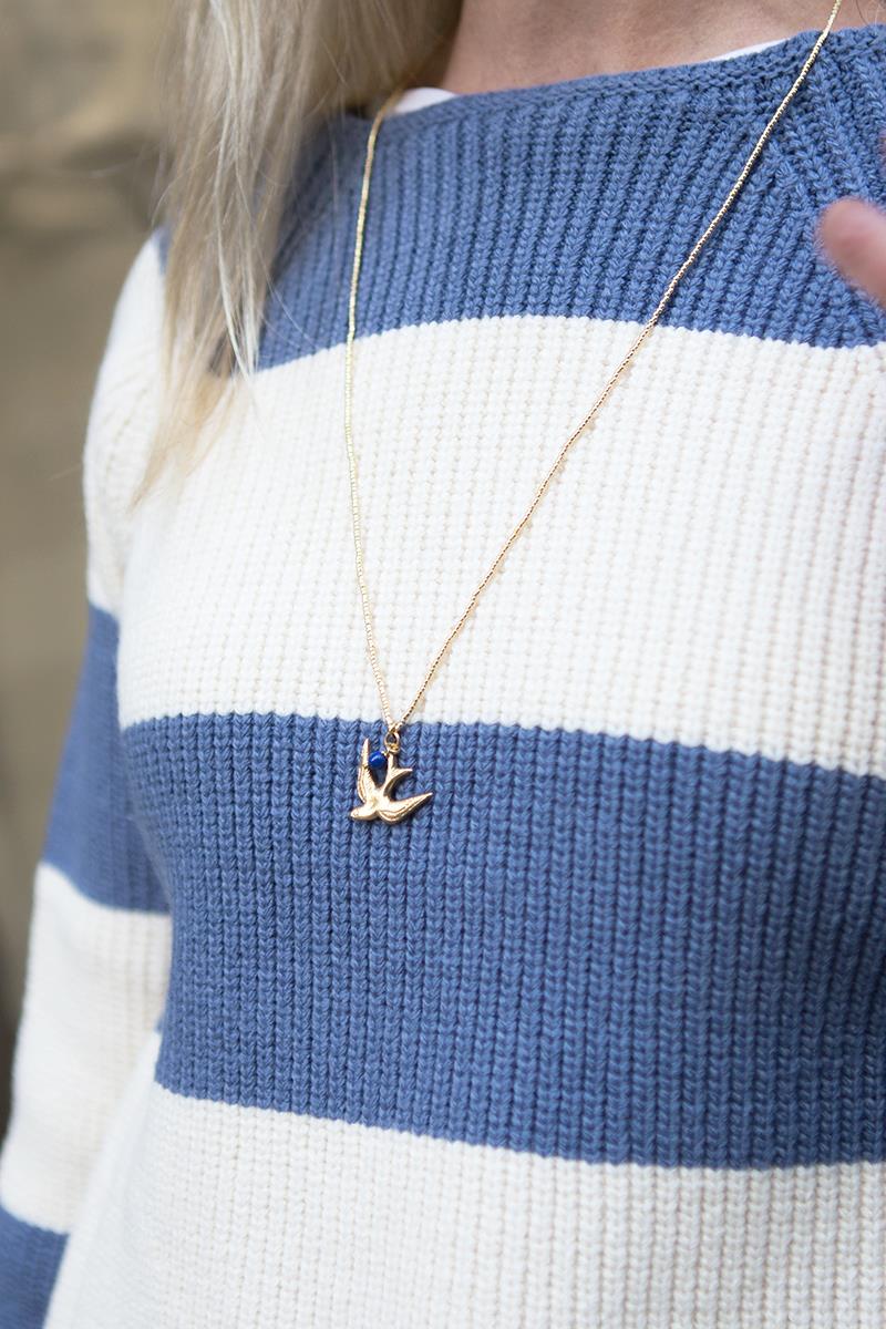 Collar largo de abalorios dorados con una golondrina acompañada de una pequeña bolita de lapislázuli. El lapislázuli hace amigos en todas partes. El lapislázuli es sabio y establece conexiones con facilidad. Un regalo con esta piedra preciosa de color azul intenso es una buena manera de celebrar una preciosa amistad. Reforzado además con la golondrina que también simboliza la amistad y la felicidad. Una pieza sencilla pero muy vistosa, perfecta para combinar con otros collares más cortos de nuestra colección. Es un collar sin cierre que se entra perfectamente por la cabeza gracias a su longitud.