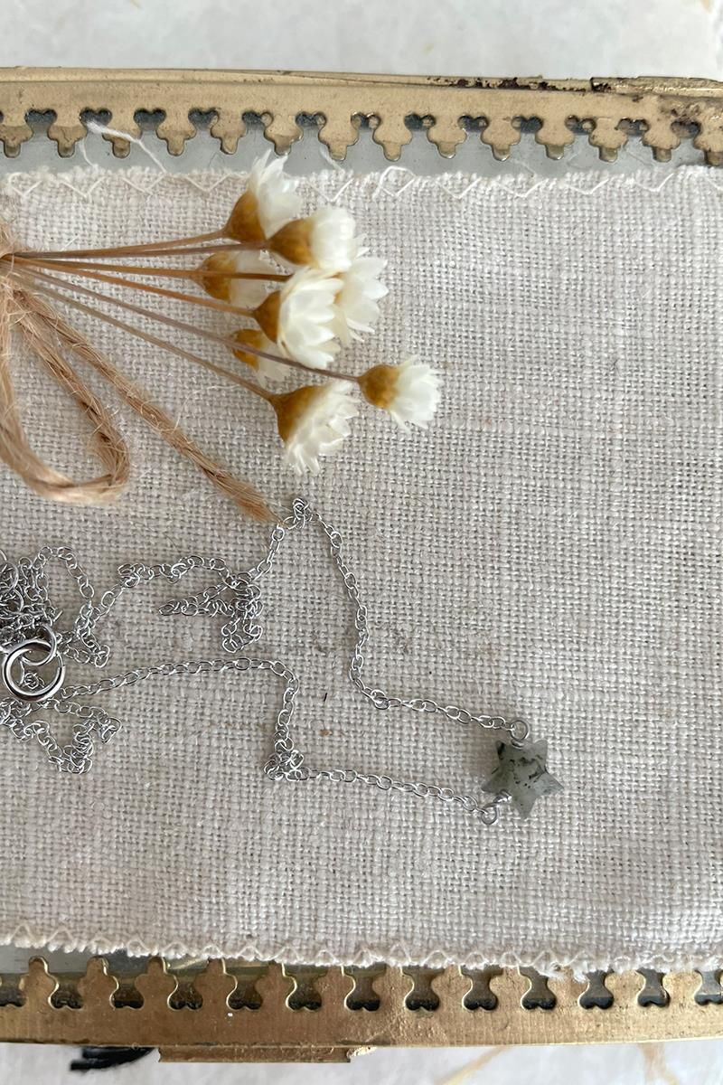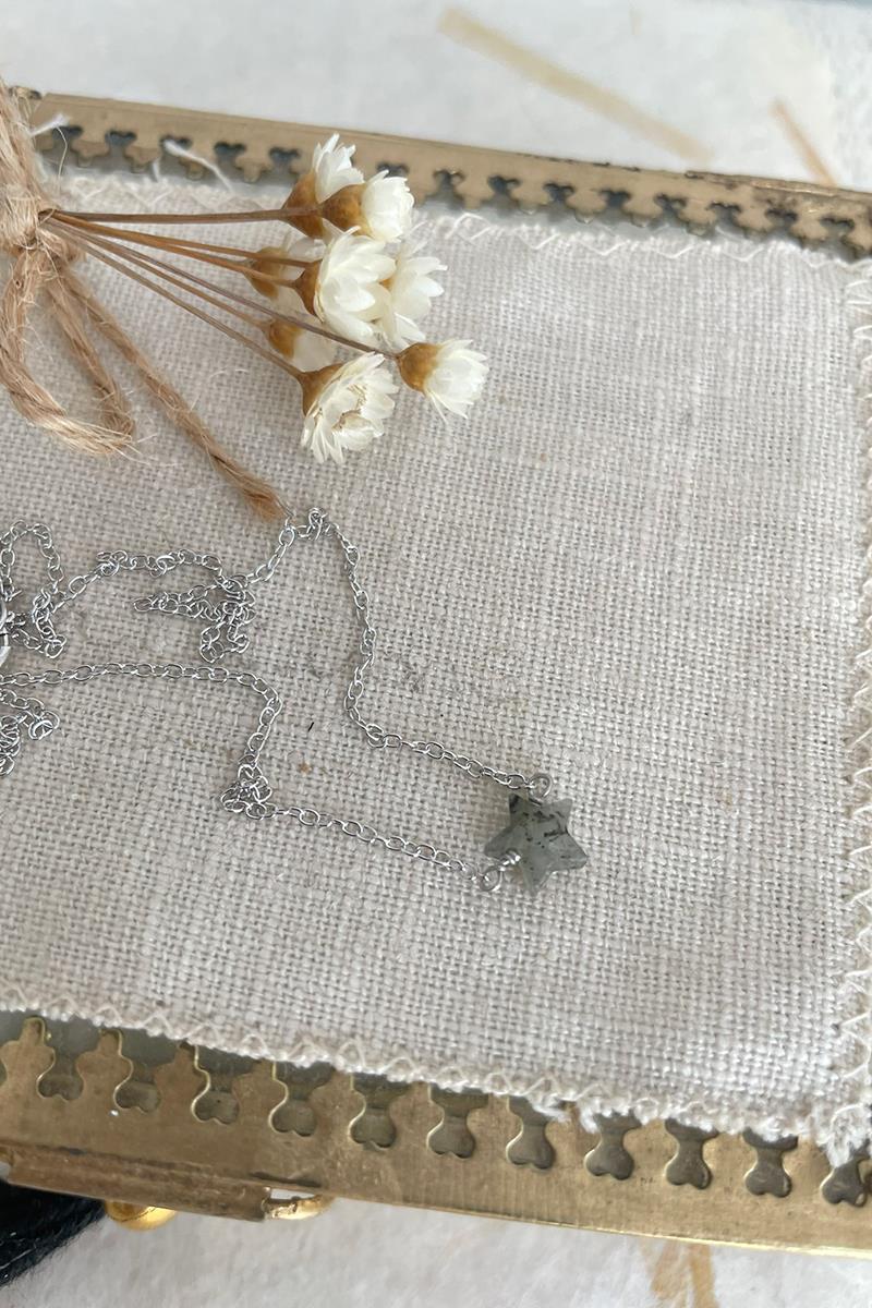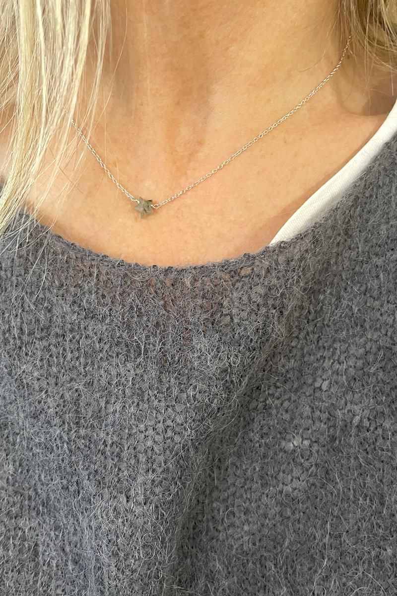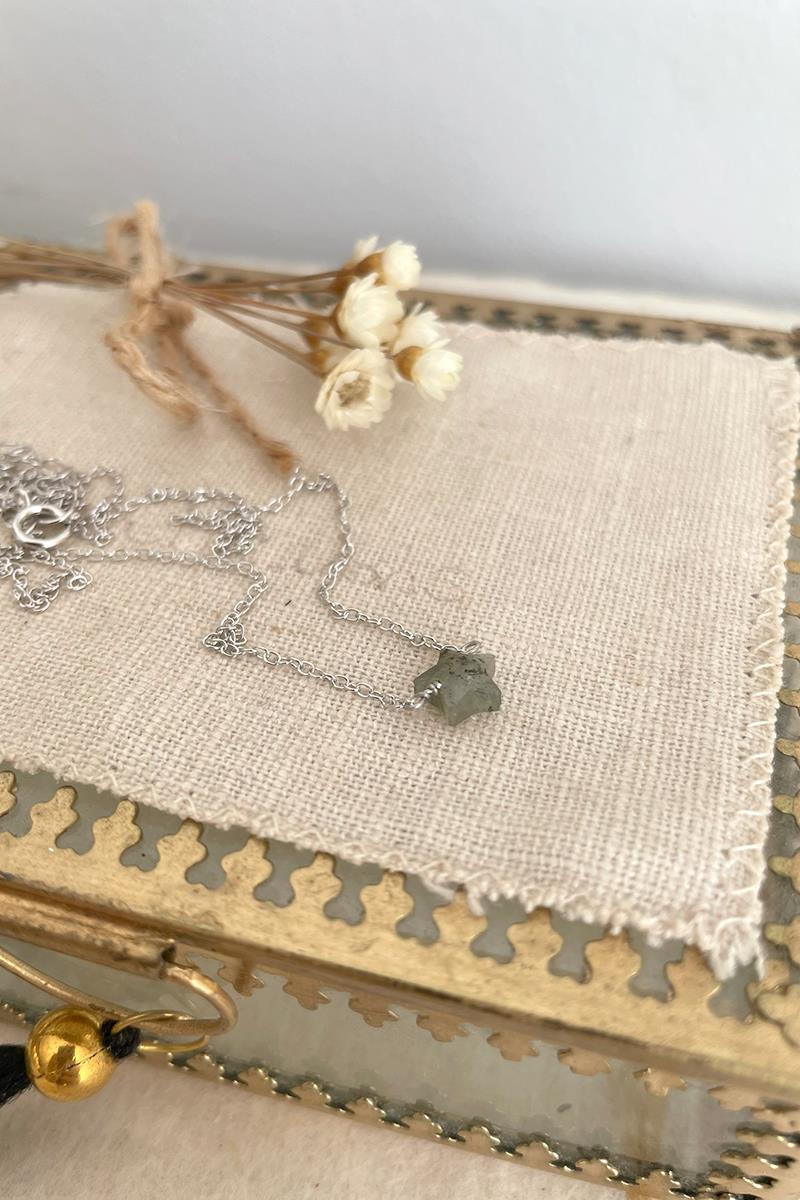 Una pequeña estrella de labradorita sobre cadena fina. Un colgante sutil y delicado, pero muy vistoso. Perfecto para llevar solo o combinarlo con otros collares de nuestra colección. Disponible en plata rodiada. Largo aprox. 40 cm con alargador de 5 cm.