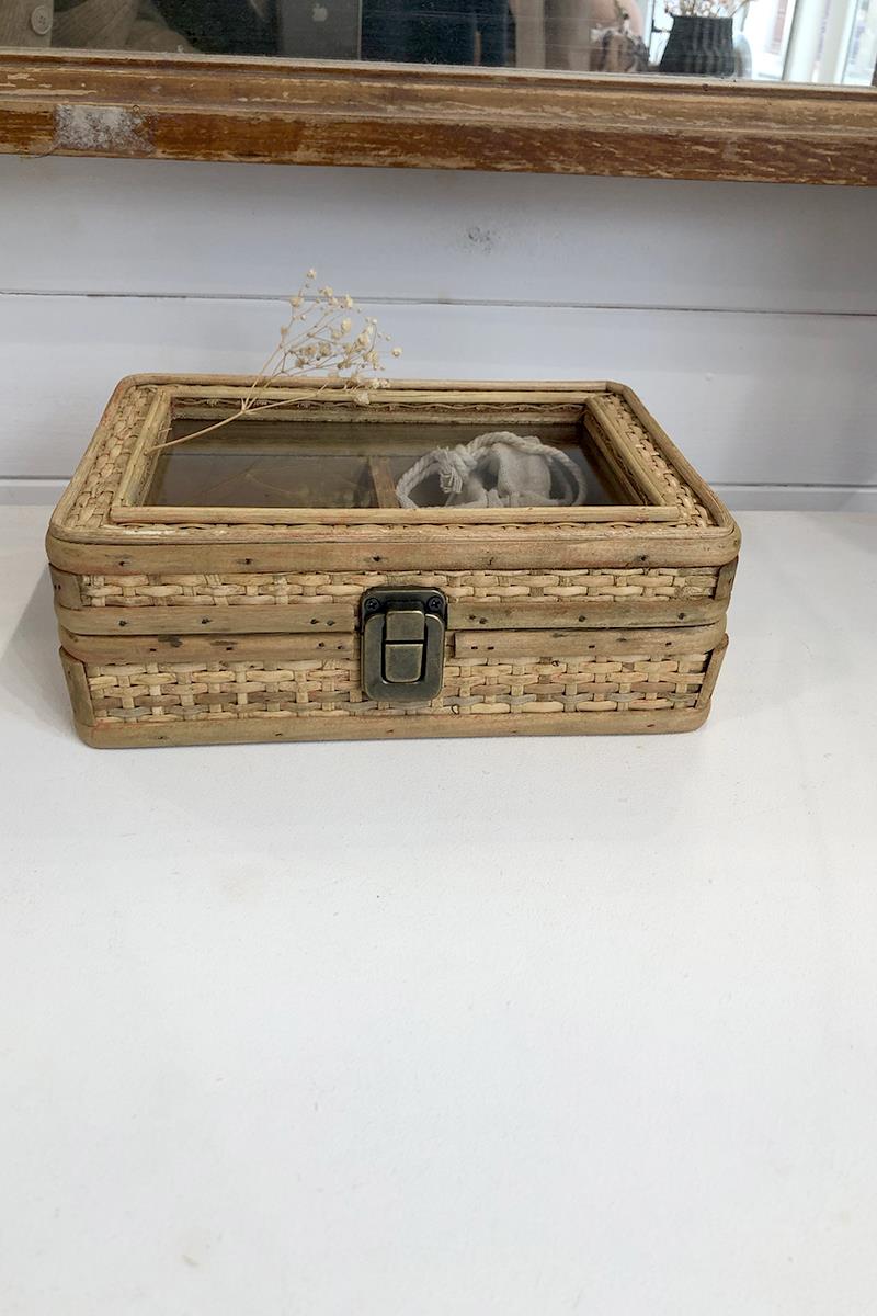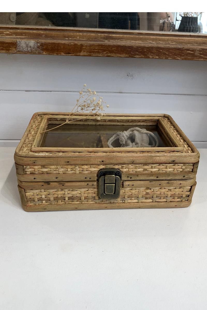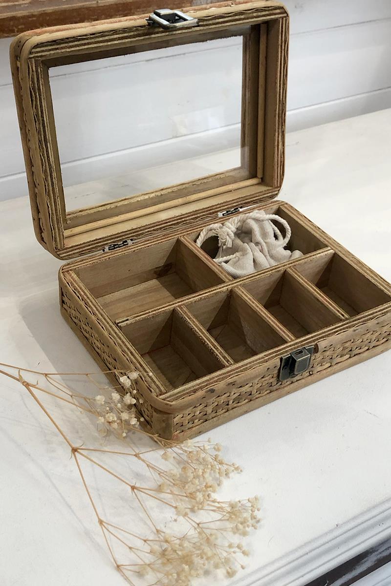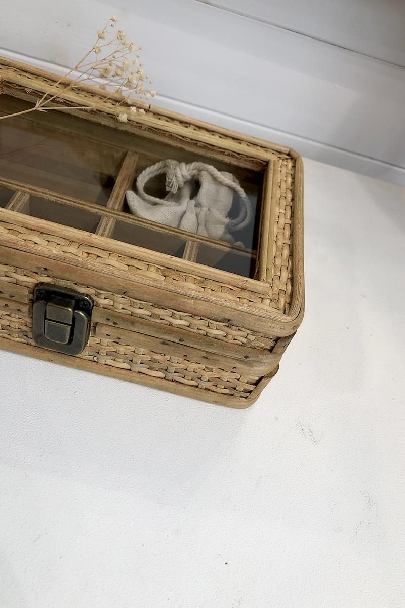 Caja rectangular de ratán con tapa acristalada. Tiene 6 compartimentos en su interior, dos grandes y cuatro pequeños. Cierre de latón. Utilízala como joyero, para guardar relojes o artículos de tamaño pequeño. Perfecta para cualquier estancia de tu casa, ya que además de práctica resulta muy decorativa.
