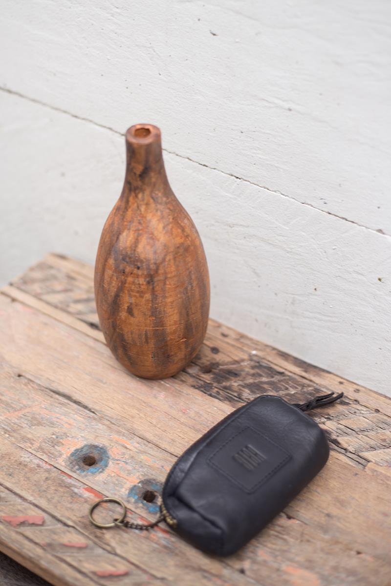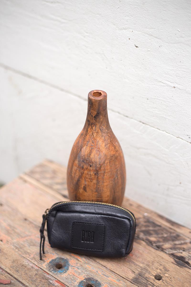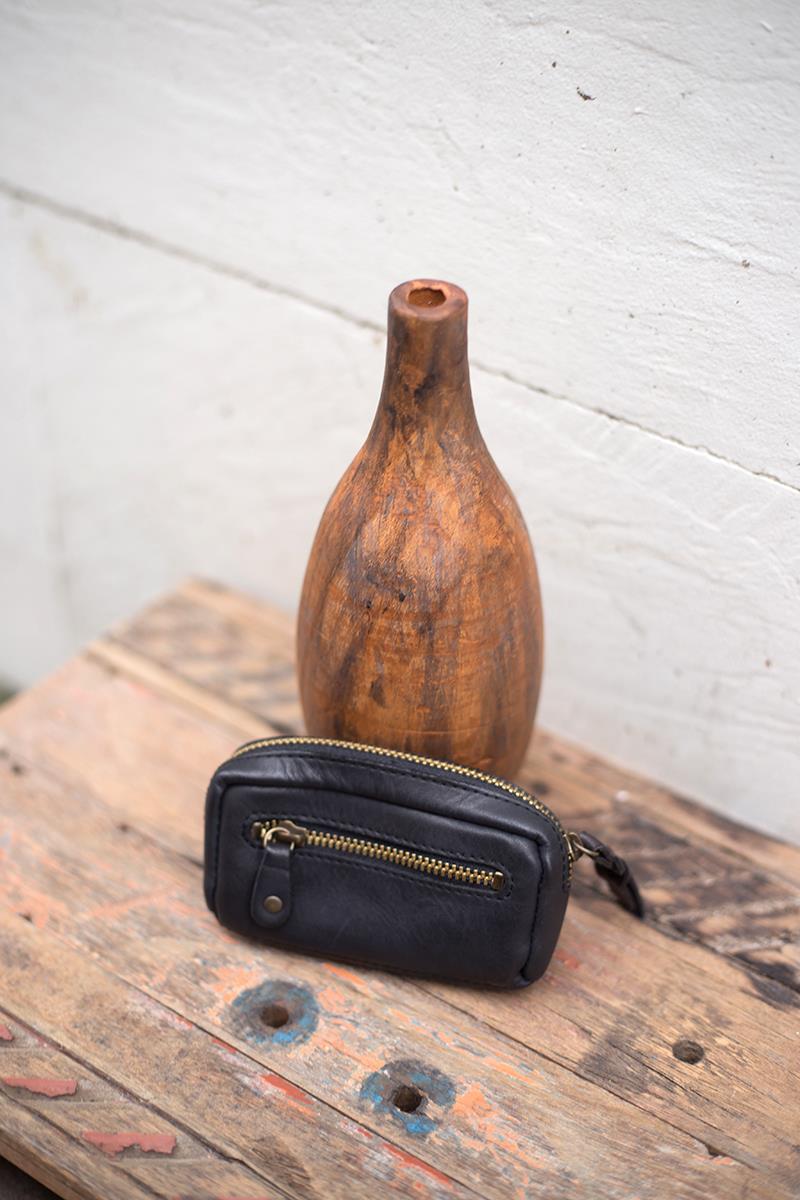 Un monedero pequeño y muy funcional. Perfecto para llevar tus tarjetas y el dinero en efectivo, además incluye un aro para llevar las llaves en el interior. Con cierre de cremallera y un tirador para mayor comodidad. Es de piel negra y no tiene forro, ni divisiones en el interior. En la parte exterior tiene un bolsillo con cremallera.