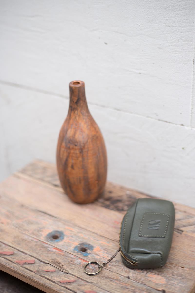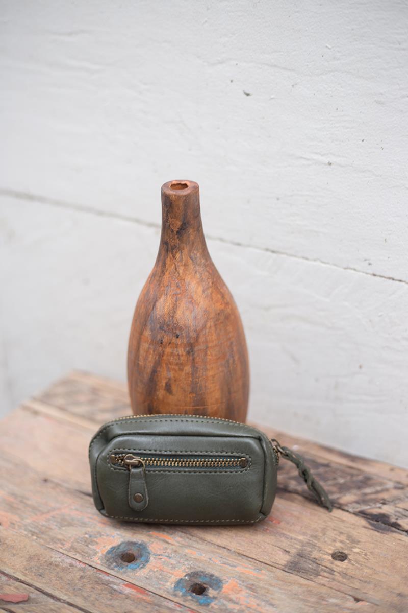 Un monedero pequeño y muy funcional. Perfecto para llevar tus tarjetas y el dinero en efectivo, además incluye un aro para llevar las llaves en el interior. Con cierre de cremallera y un tirador para mayor comodidad. Es de piel verde y no tiene forro, ni divisiones en el interior. En la parte exterior tiene un bolsillo con cremallera.
