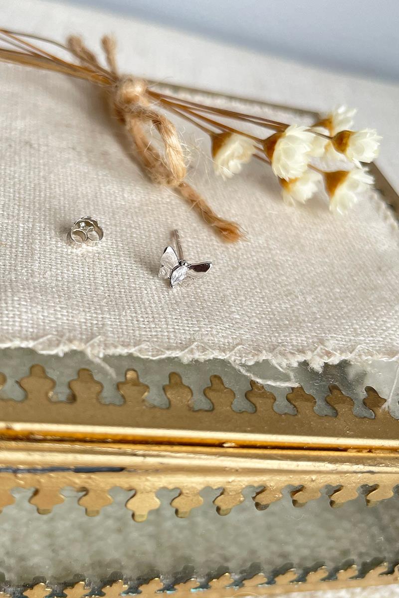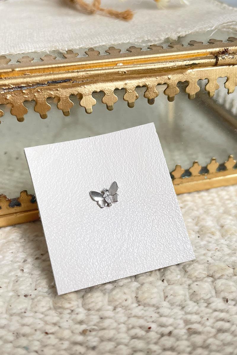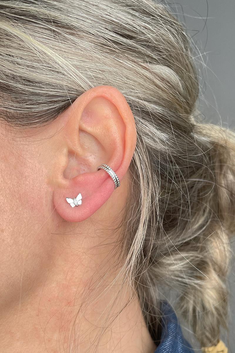 Pendiente con forma de mariposa y una pequeña circonita. Queda muy bien en cualquiera de las perforaciones. Con cierre tradicional de presilla. Busca en nuestra colección otros pendientes para hacer una combinación perfecta. Es de plata con baño de rodio. Se vende individualmente.