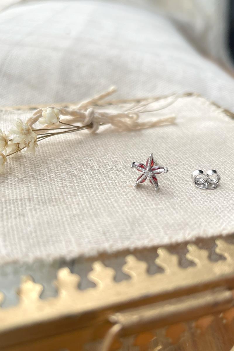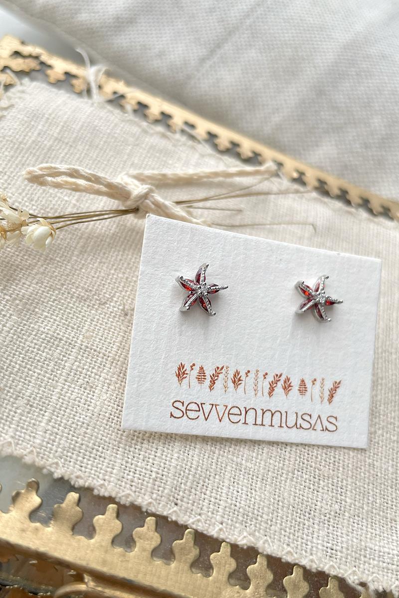 Pendientes pequeños con forma de estrella de mar. Con brillos y cristales rojizos. Tienen el tamaño perfecto para usar a diario. Con cierre tradicional de presilla. Son de plata con baño de rodio.