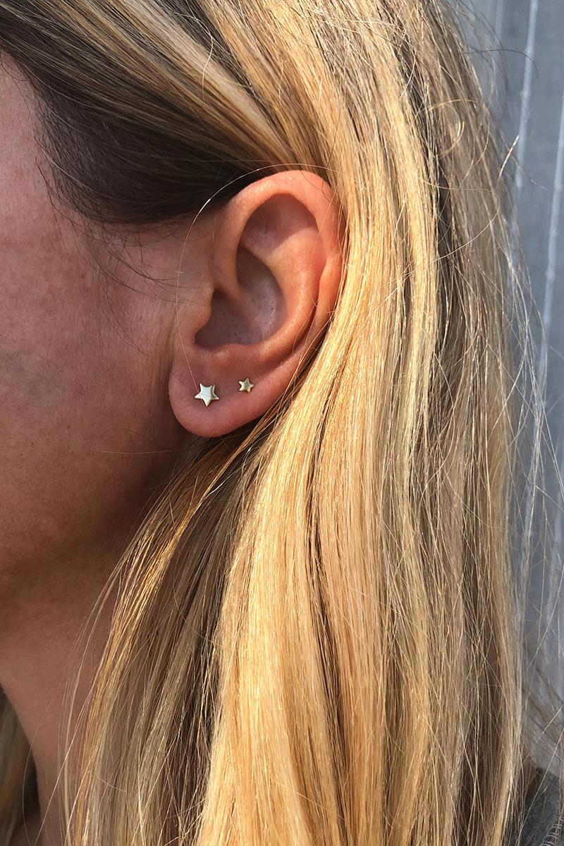 Pendiente con forma de estrella. Es muy pequeñito, por lo que es adecuado para segunda y posteriores perforaciones. Combínalo con otras estrellas de nuestra colección, te quedará genial coordinado con pendientes de luna. Es de plata con baño de oro. Cierre tradicional de presión. Se venden individualmente. En la última foto es el pendiente mas pequeño.