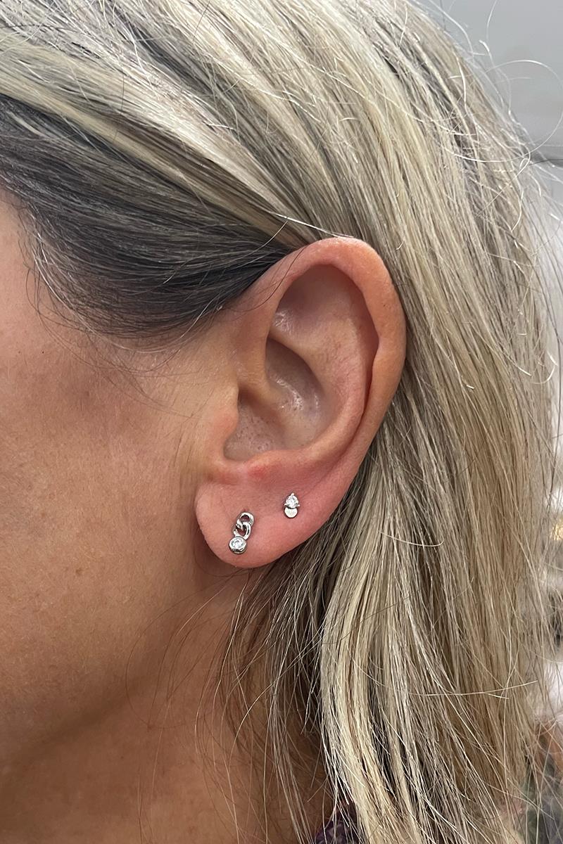 Pendiente con forma de eslabones y una pequeña circonita. Queda muy bien en cualquiera de las perforaciones. Con cierre tradicional de presilla. Busca en nuestra colección otros pendientes para hacer una combinación perfecta. Es de plata rodiada. Se vende individualmente.