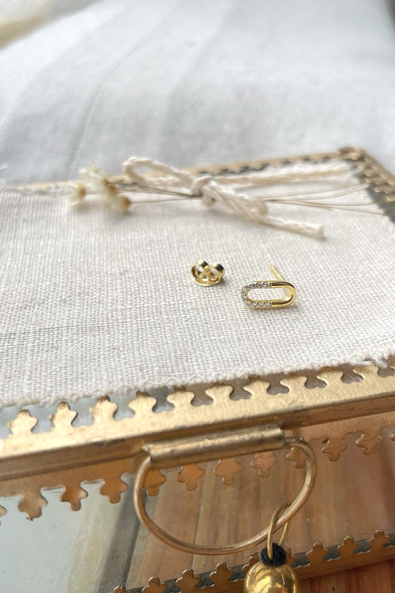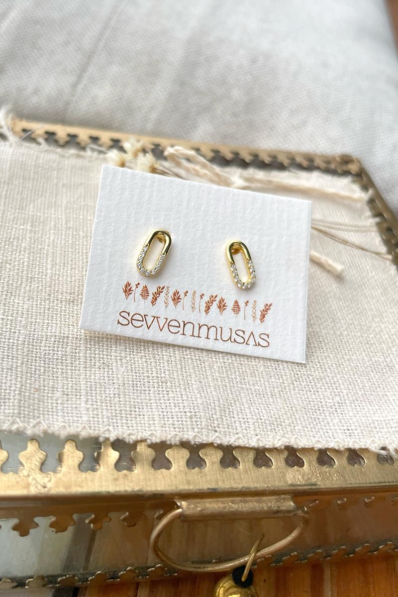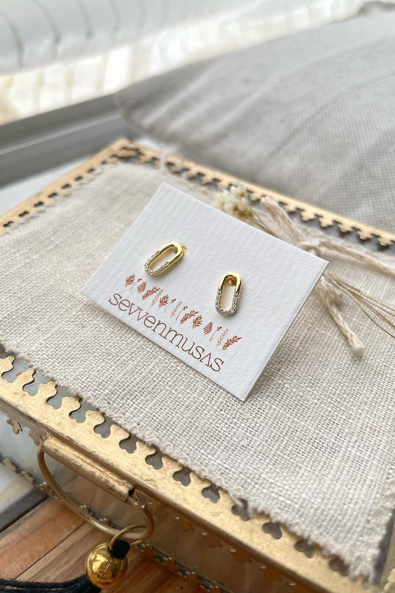 Unos pendientes pequeños pero muy vistosos. Con forma ovalada y mini circonitas que le dan mucho brillo. Perfectos para diario si buscas pendientes pequeños con un toque diferente. Con cierre de presilla tradicional. Son de plata con baño de oro. Largo 0,8 cm.
