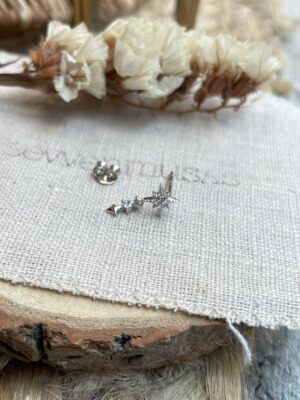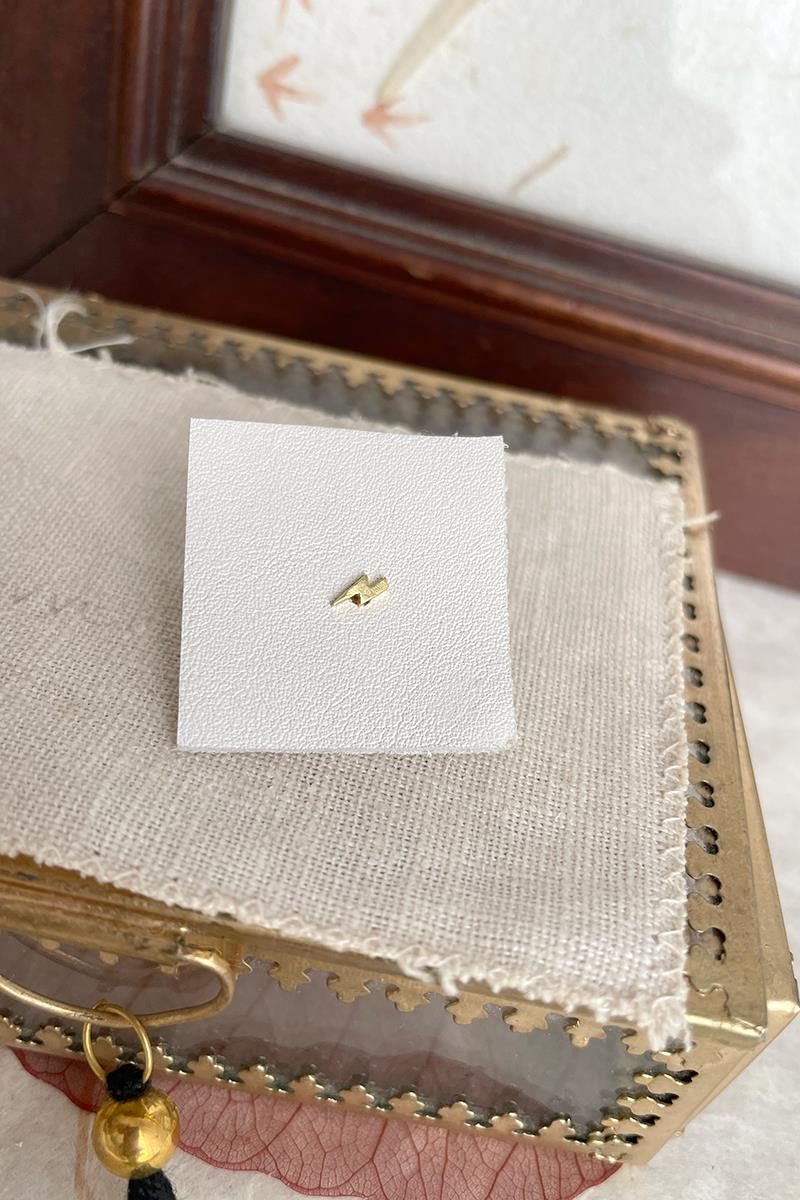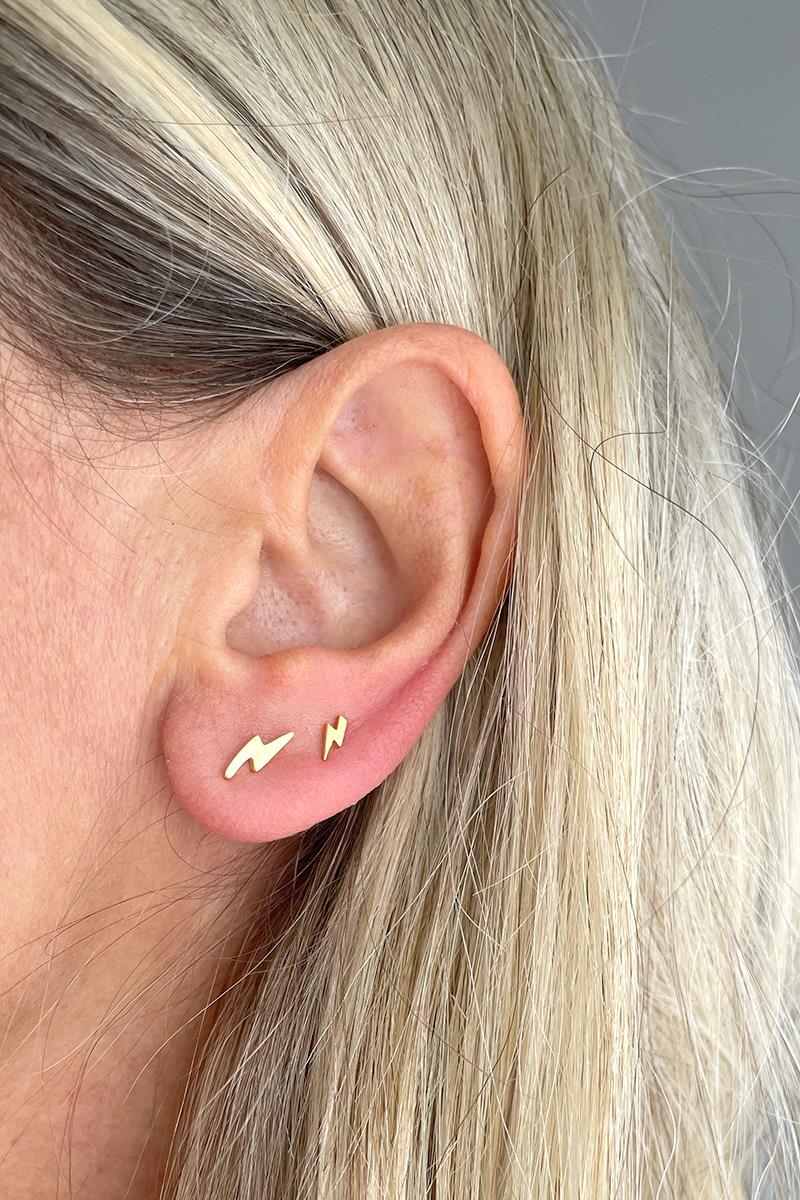 Pendiente muy chiquitín con forma de rayo. Su tamaño lo hace ideal para poner es segundas y posteriores perforaciones, si tienes el lóbulo pequeño será perfecto para la perforación principal. Perfecto para combinar con nuestro rayo más grande o con el arito con rayo. En las fotos es el modelo más pequeño. Con cierre de presilla tradicional. Se vende individualmente. Mide 5 mm de largo. Es de plata con baño de oro.