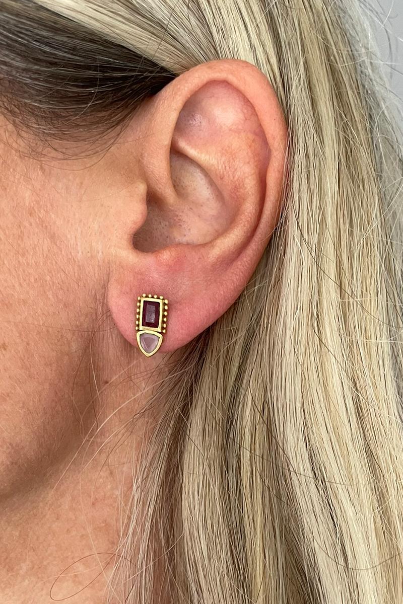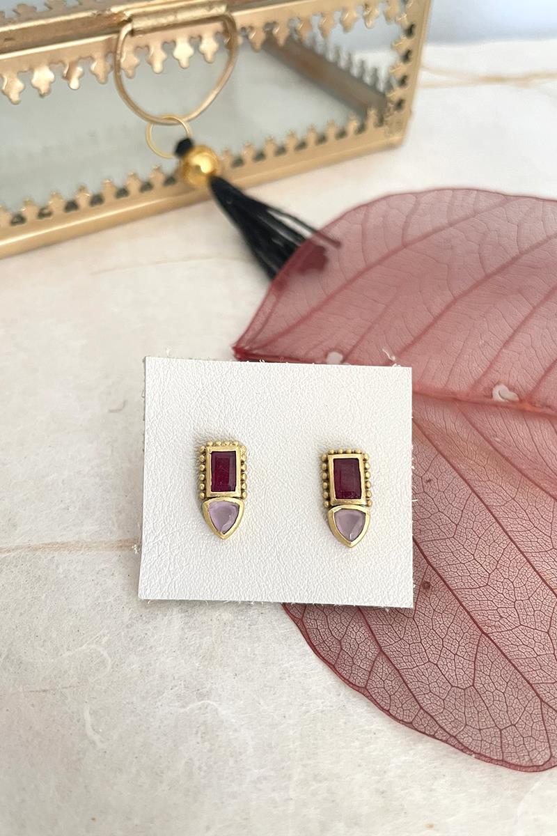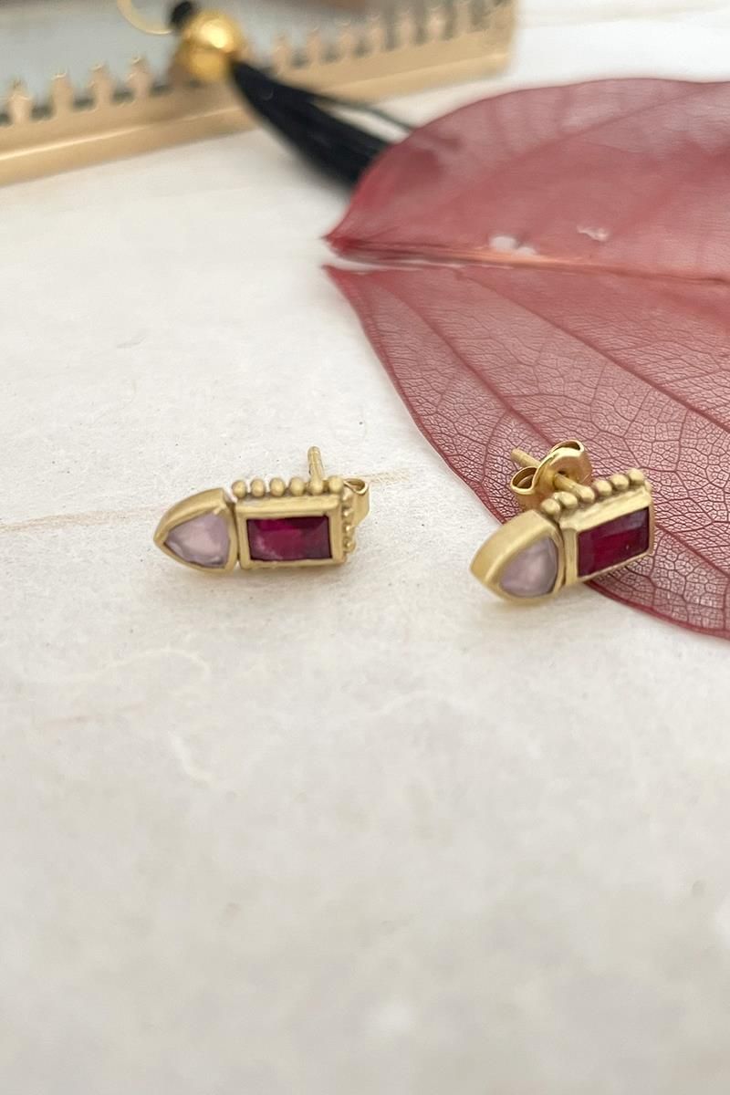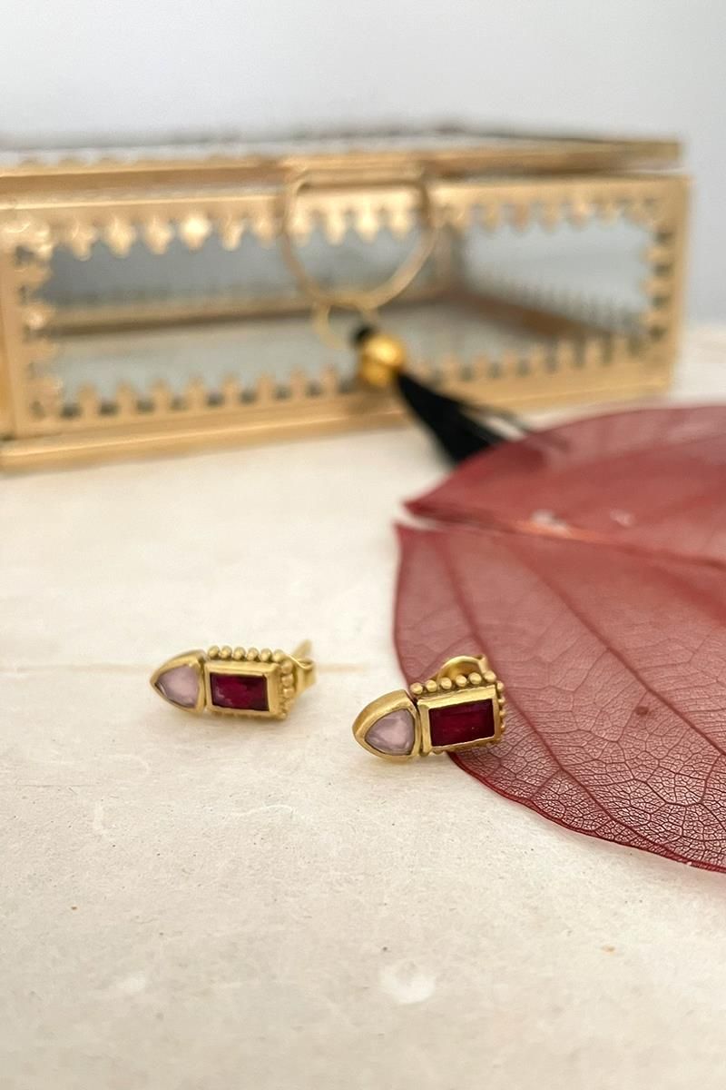 Unos pendientes pequeños y sencillos que destacan por la combinación de dos gemas en tonos rosados: turmalina y cuarzo rosa. Tienen un diseño muy favorecedor que los hace perfectos para el día a día, sin pasar desapercibidos. Son unos pendientes muy ligeros. Con cierre tradicional de presilla. Hechos de latón, libre de níquel, chapado en oro y con un lacado para mayor duración.