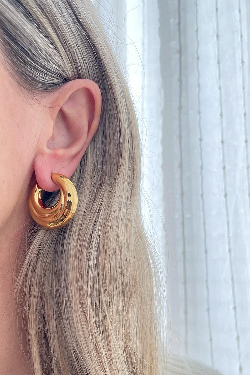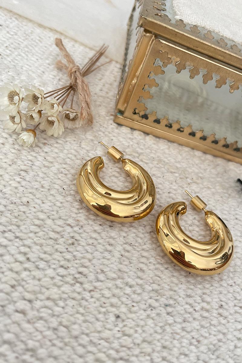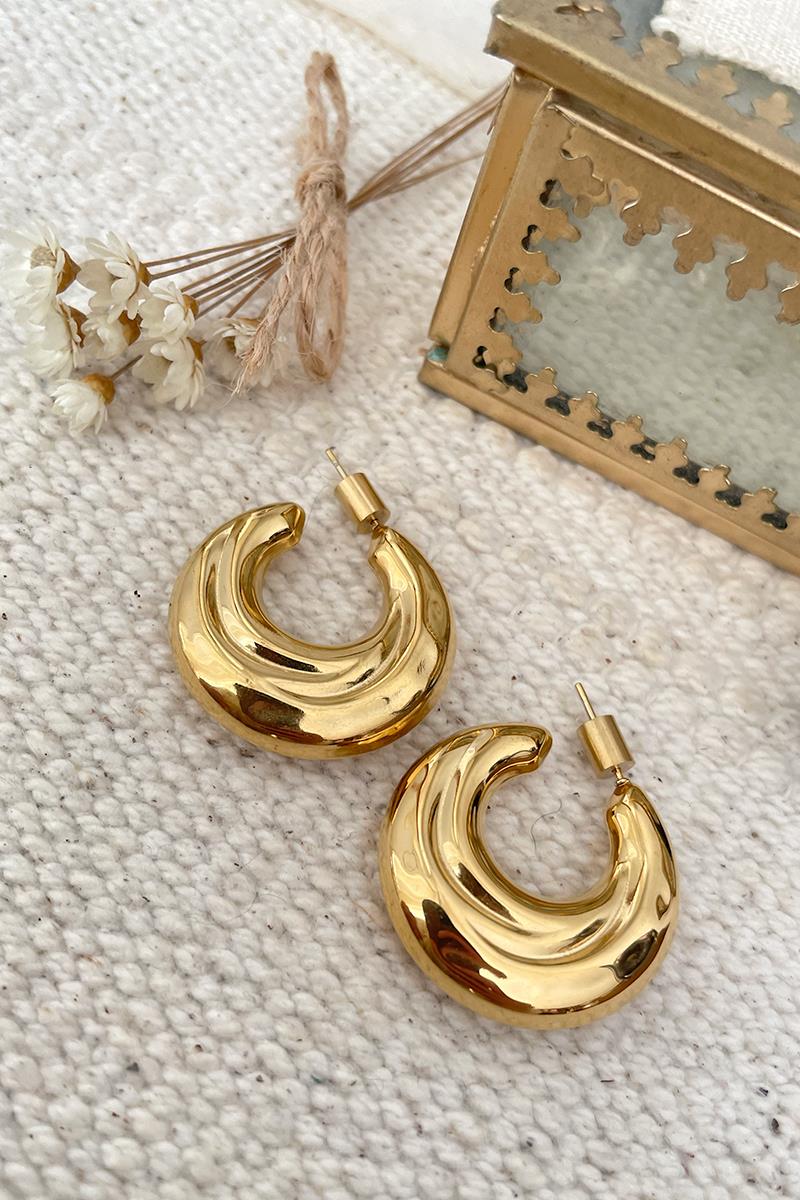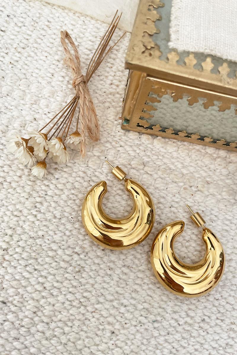 Pendientes grandes tipo semi aro con diseño irregular de inspiración ochentera. Son muy favorecedores y elegantes. Ideales para llevar en un evento especial. Te resultarán bastante ligeros a pesar de su tamaño ya que son huecos. Con cierre de cilindro. Son de acero dorado.