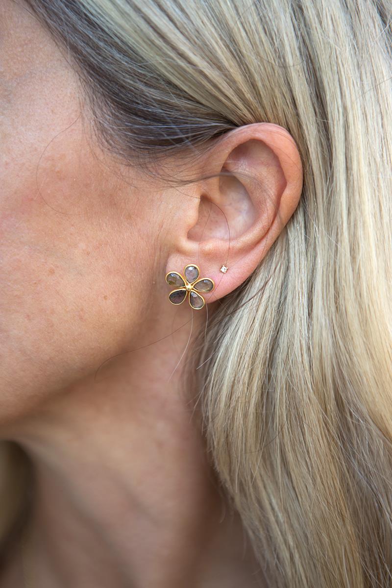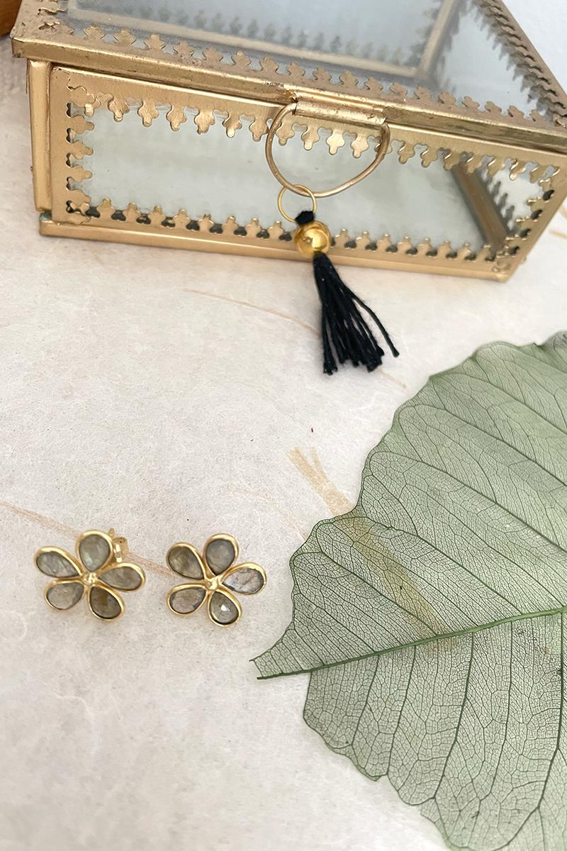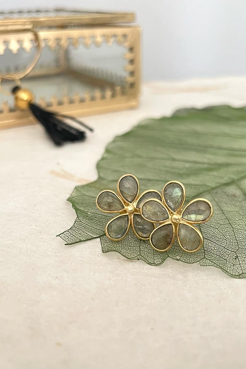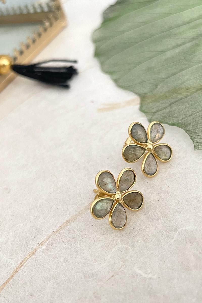 Pendientes con forma de flor, en los que cada pétalo es una pieza de labradorita. Muy elegantes y originales, son perfectos tanto para un día cualquiera como para una ocasión especial. Son unos pendientes muy ligeros. Con cierre tradicional de presilla. Hechos de latón, libre de níquel, chapado en oro y con un lacado para mayor duración.