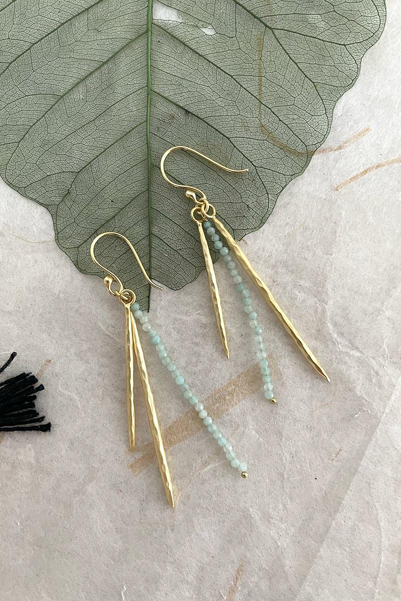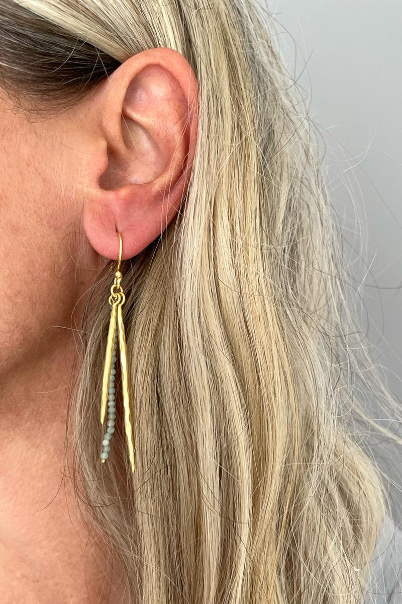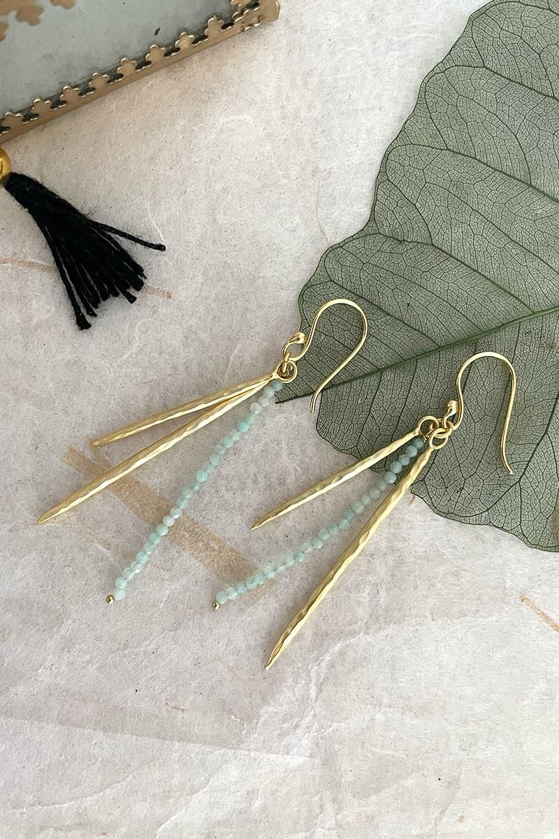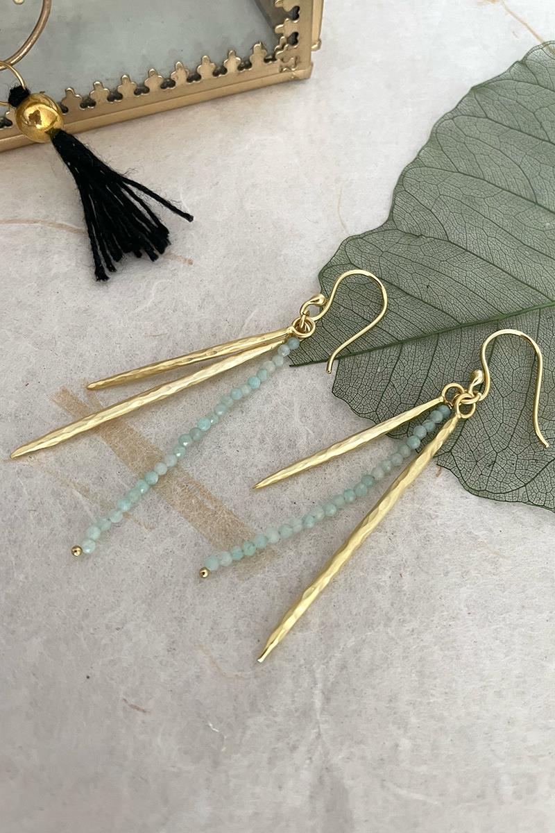 Pendientes largos con una tira de pequeñas amazonitas. Muy elegantes y originales, son perfectos para el día a día si eres de pendientes largos o también para una ocasión especial. Son unos pendientes muy ligeros. Con cierre de gancho. Hechos de latón, libre de níquel y chapado en oro con acabado mate.