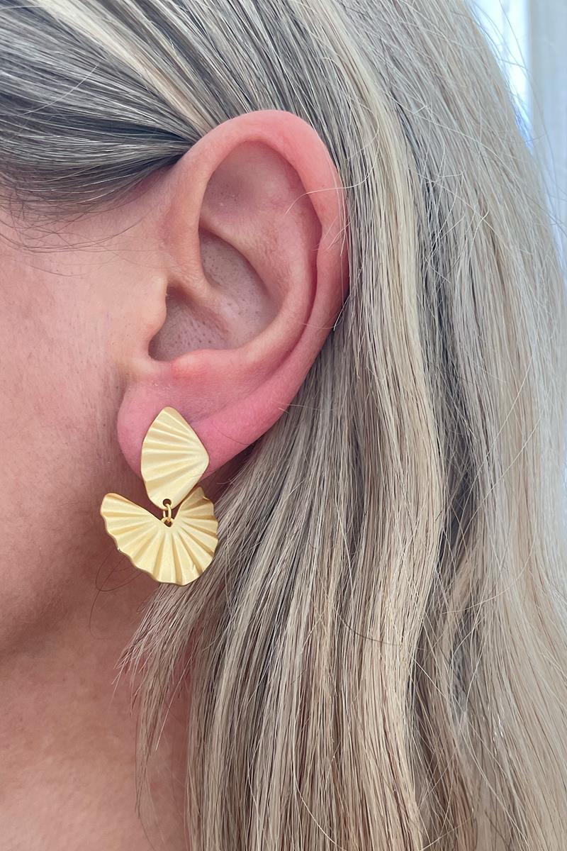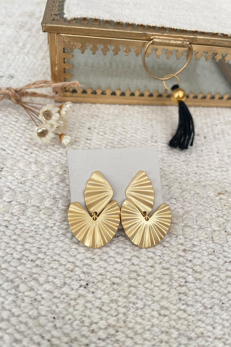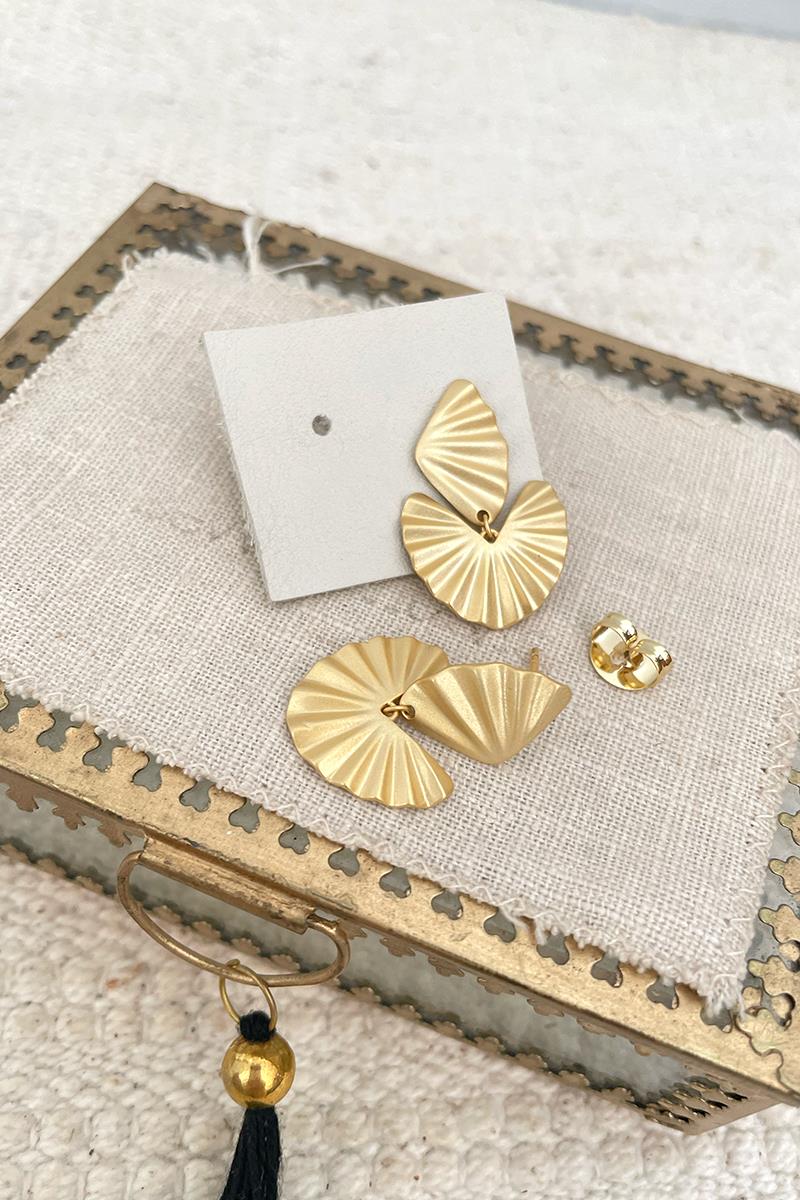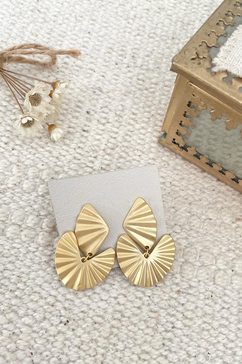 Pendientes largos formados con forma de abanico y un bonito acabado dorado mate. Con una pieza fija y otra colgante que les da mucho movimiento. Son ideales para un evento especial si buscas una pieza que no sea demasiado grande, pero que resulte muy vistosa. Son unos pendientes muy ligeros. Con cierre tradicional de presilla. Son de bronce con baño de oro.