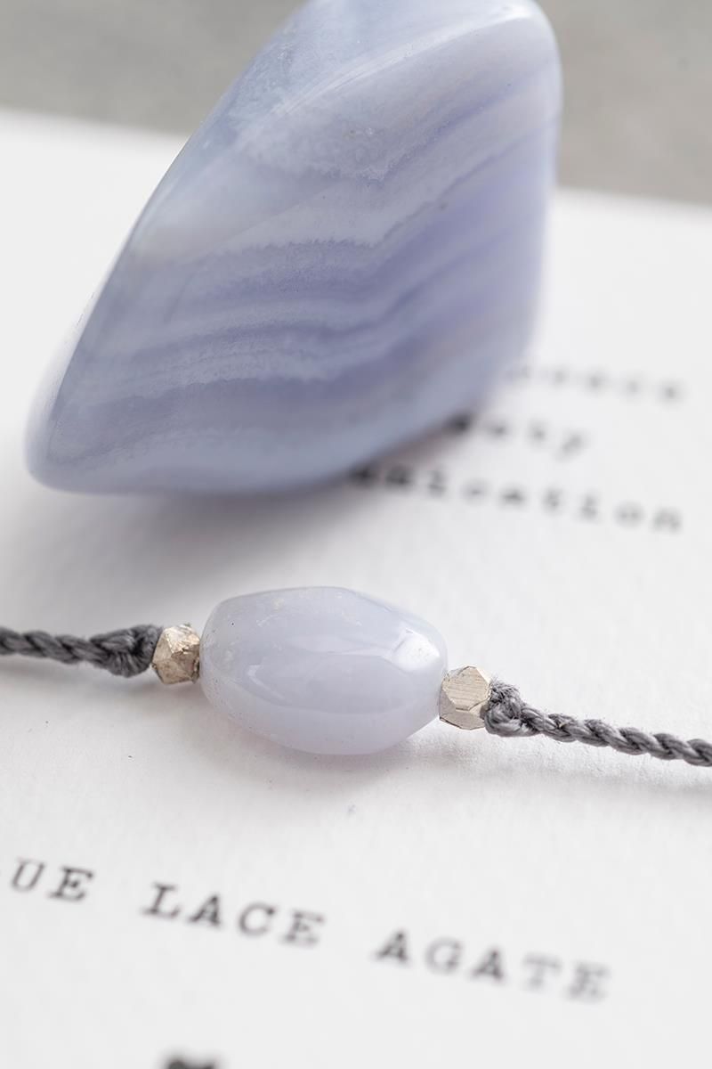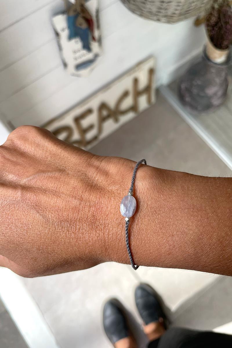 Pulsera artesanal elaborada con cordón de algodón gris y una piedra natural de ágata azul, una gema conocida por su energía calmante y su influencia positiva en la comunicación. Incorpora pequeños detalles en latón plateado que le aportan un toque moderno y elegante. El cierre ajustable mediante nudo corredizo permite adaptarla fácilmente a cualquier muñeca, asegurando comodidad y un ajuste perfecto. La Ágata Azul es la piedra de la comunicación y la serenidad. Te ayuda a mantener la calma en conversaciones difíciles y a expresar tu verdadero mensaje con claridad y equilibrio. Una joya con significado profundo y estilo atemporal.