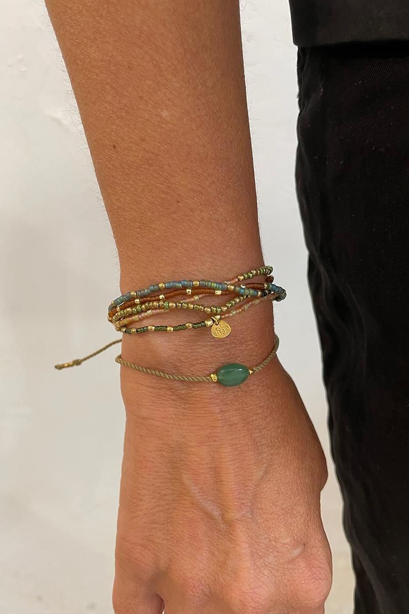Pulsera realizada con cordón de algodón tostado y una piedra de aventurina. Pequeños detalles en latón dorado. El cierre es regulable mediante un nudo corredizo.