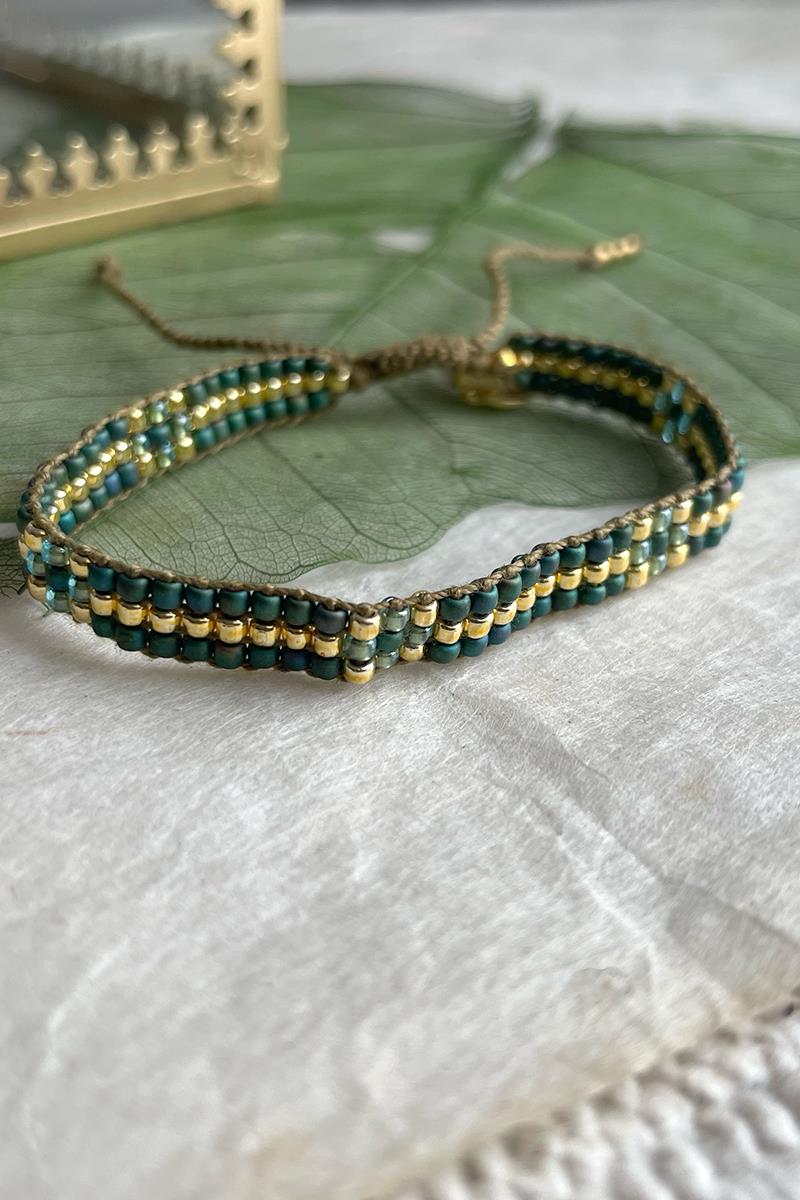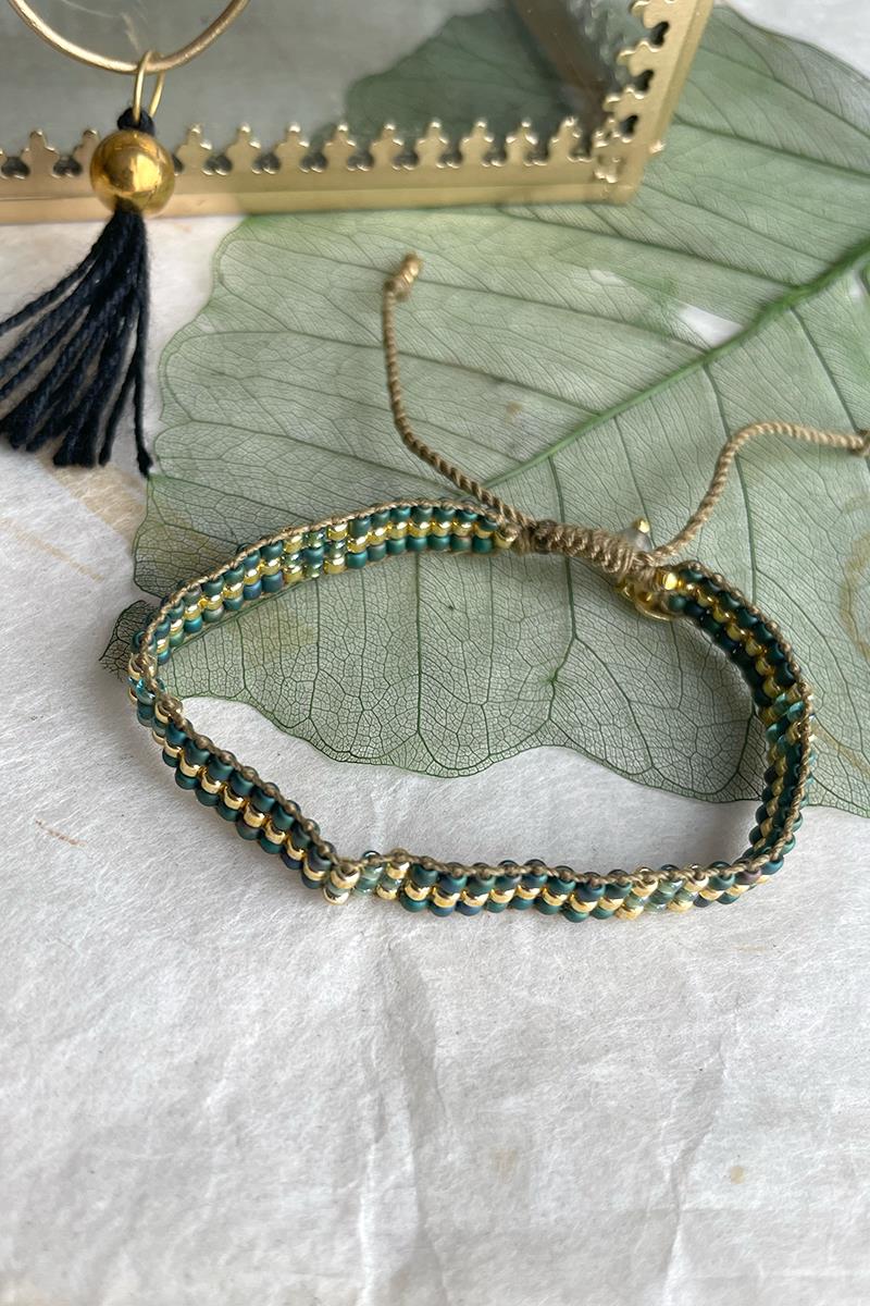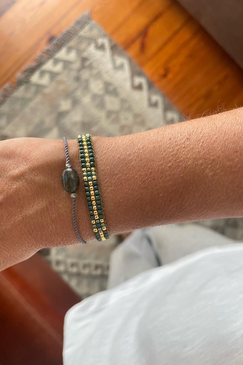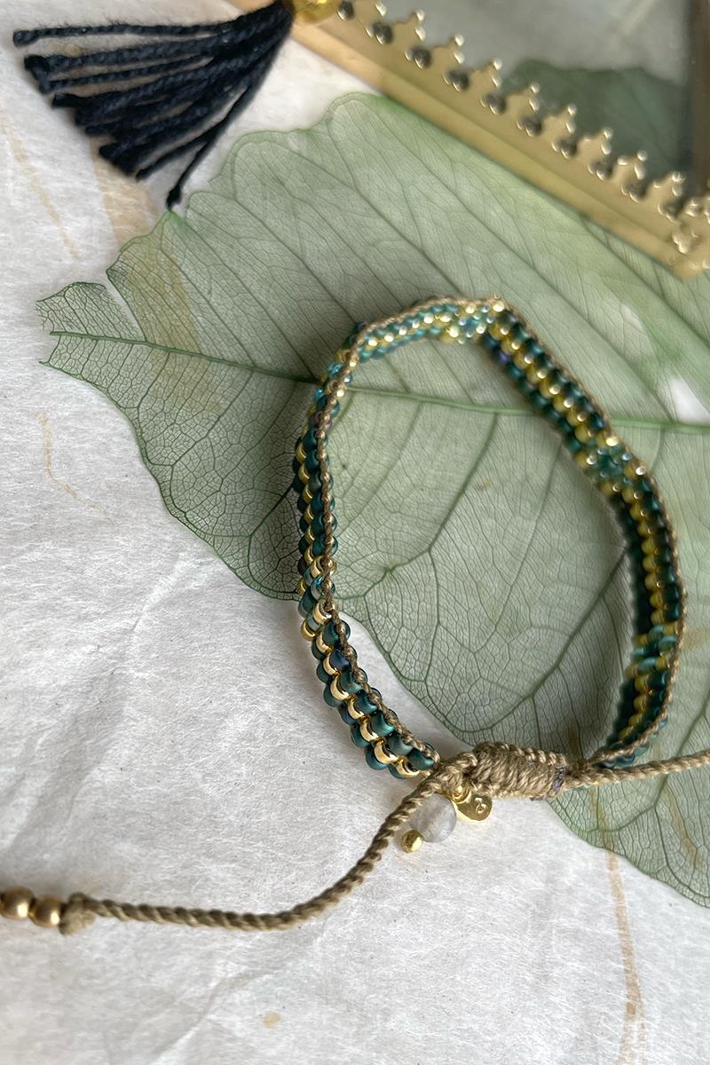Competent es una pulsera hecha de abalorios combinados en tonos de verde y dorados, con un diseño que parece una flor. Tiene una pequeña pieza de labradorita en uno de los extremos. Es ajustable mediante un nudo corredizo. Todos los detalles metálicos son de latón dorado.