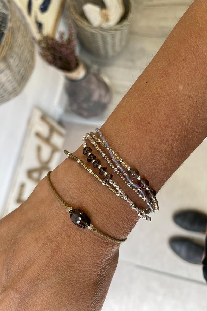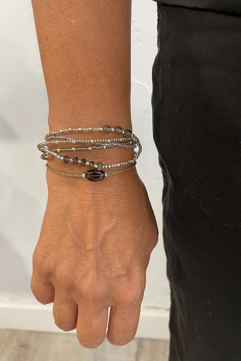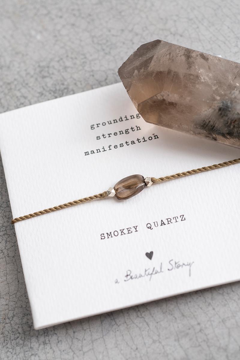 Pulsera realizada con cordón de algodón grisáceo y una piedra de cuarzo ahumado. Pequeños detalles en latón plateado. El cierre es regulable mediante un nudo corredizo. El cuarzo ahumado te ayuda a seguir adelante. ¿Ha llegado el momento de dejar ir algo? El cuarzo ahumado te acompaña hacia la claridad. Es un lienzo en blanco.
