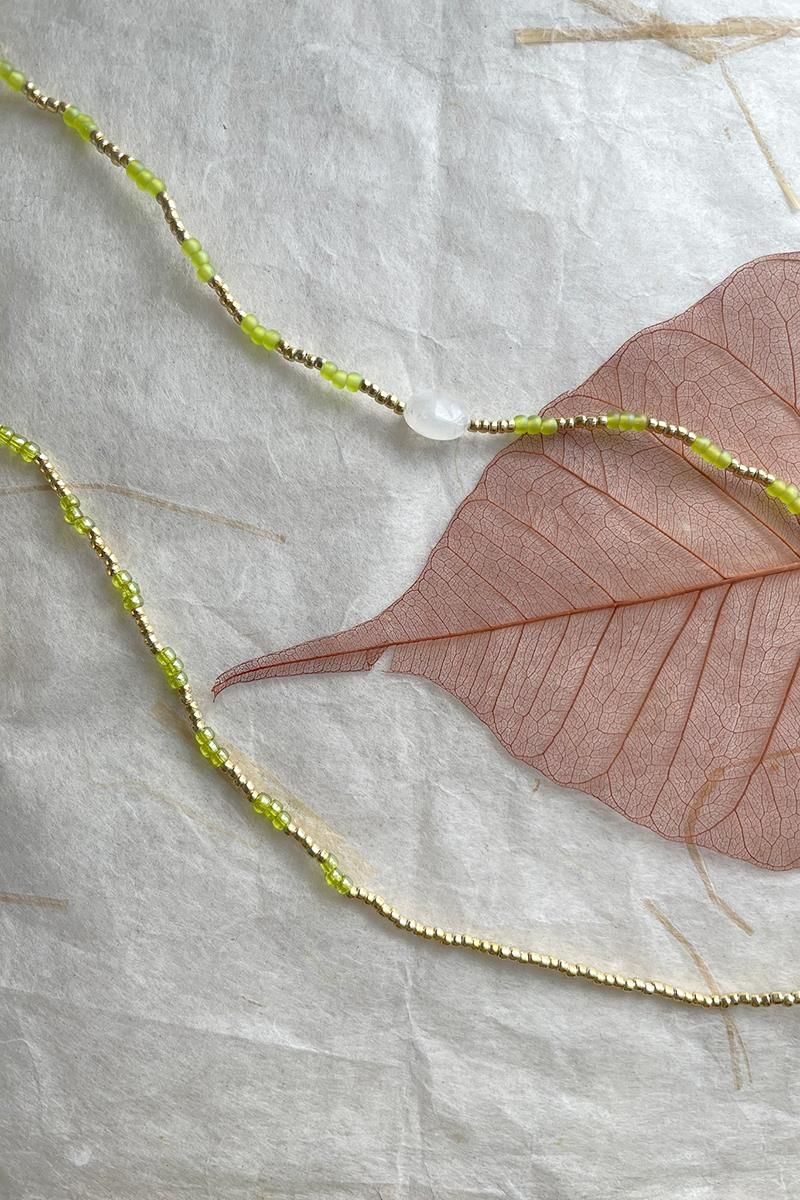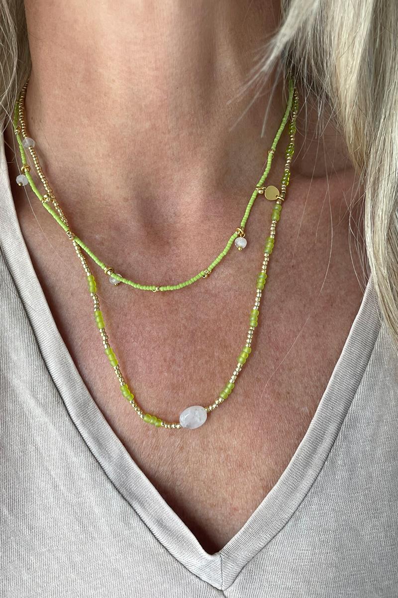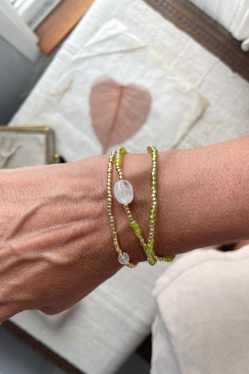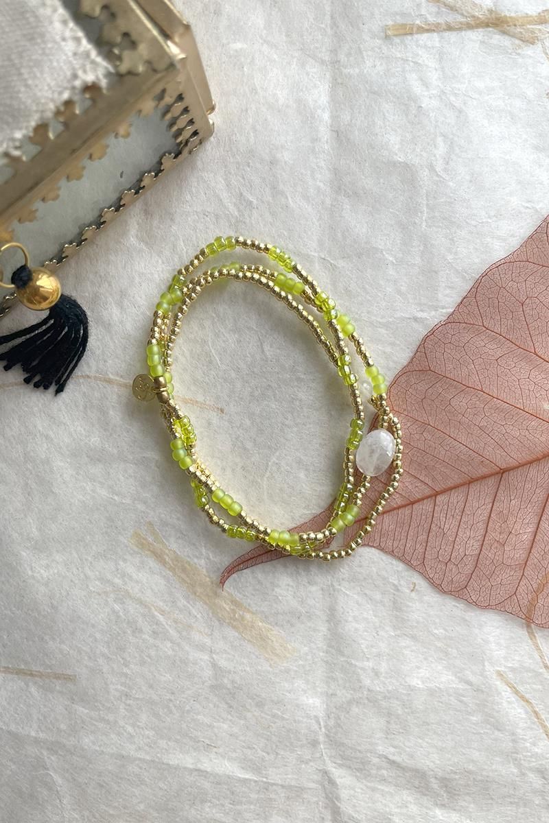 Energetic es una pieza versátil, tiene cordón elástico que te permite llevarla como pulsera dándole tres vueltas o como collar. Hecha con una bonita combinación de abalorios color lima con dorados. Con dos piezas de piedra luna en dos tamaños diferentes intercaladas. La piedra lunar representa la sabiduría femenina. Esta piedra preciosa mágica te protege. Un regalo con piedra luna es perfecto para un embarazo o un parto. O como regalo para ti misma, simplemente porque sí.