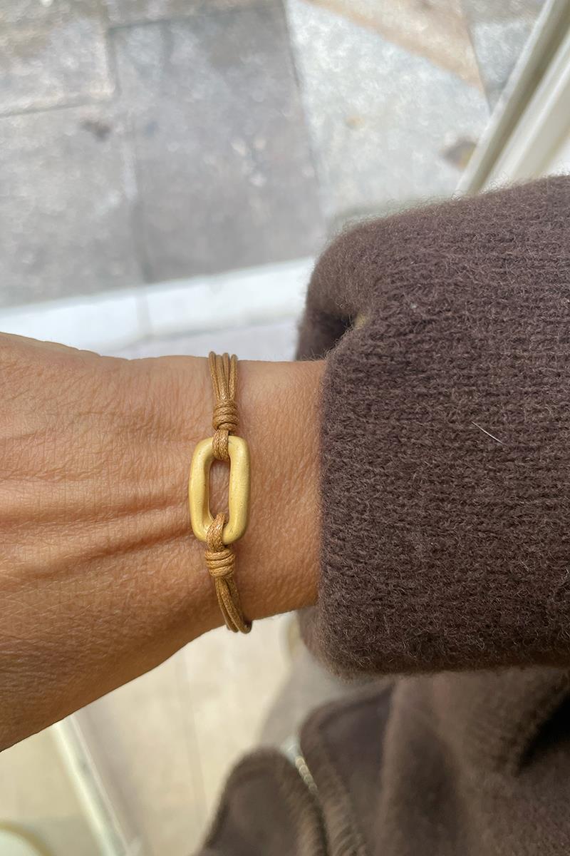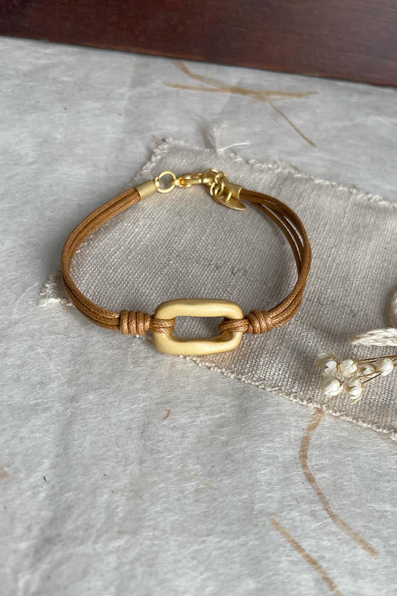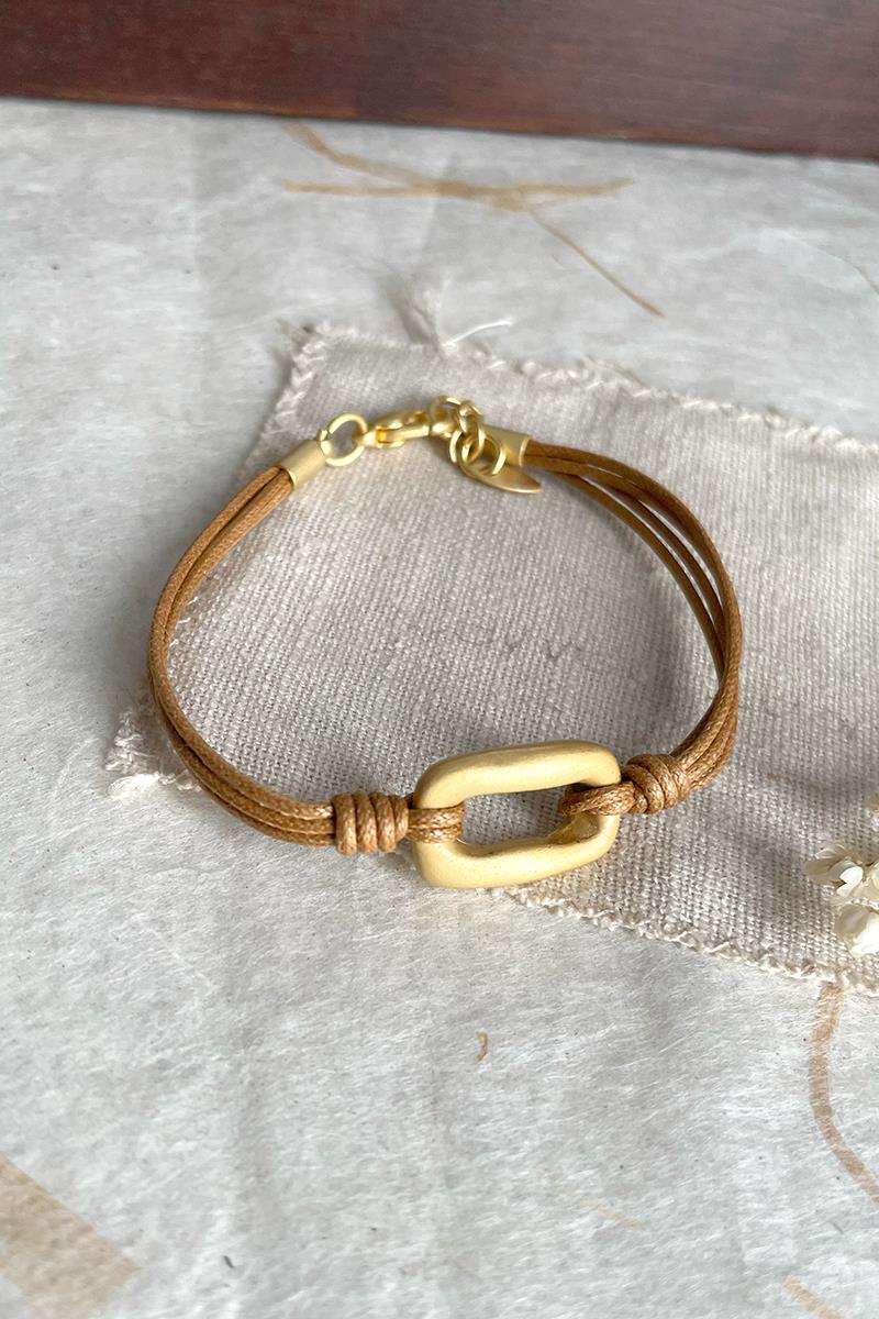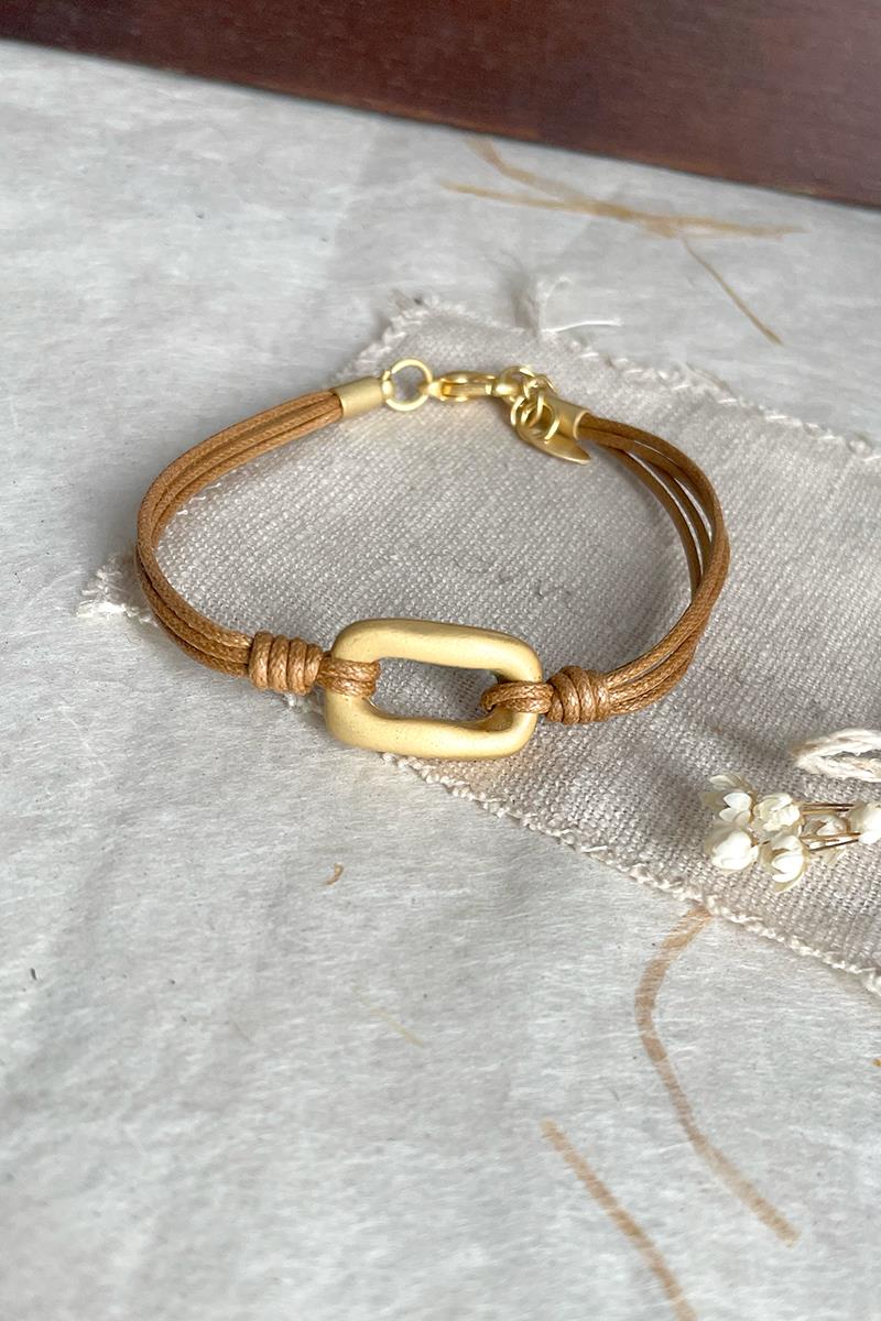 Pulsera con un eslabón anudado con cordones de algodón encerado en tono camel. Es un pulsera sencilla pero muy vistosa. Con cierre de mosquetón. Las piezas metálicas son de zamac y/o latón dorado con acabado mate. Disponible el collar a juego, un conjunto perfecto para regalar o para tí misma si eres de llevar piezas combinadas.