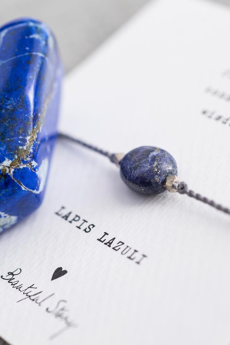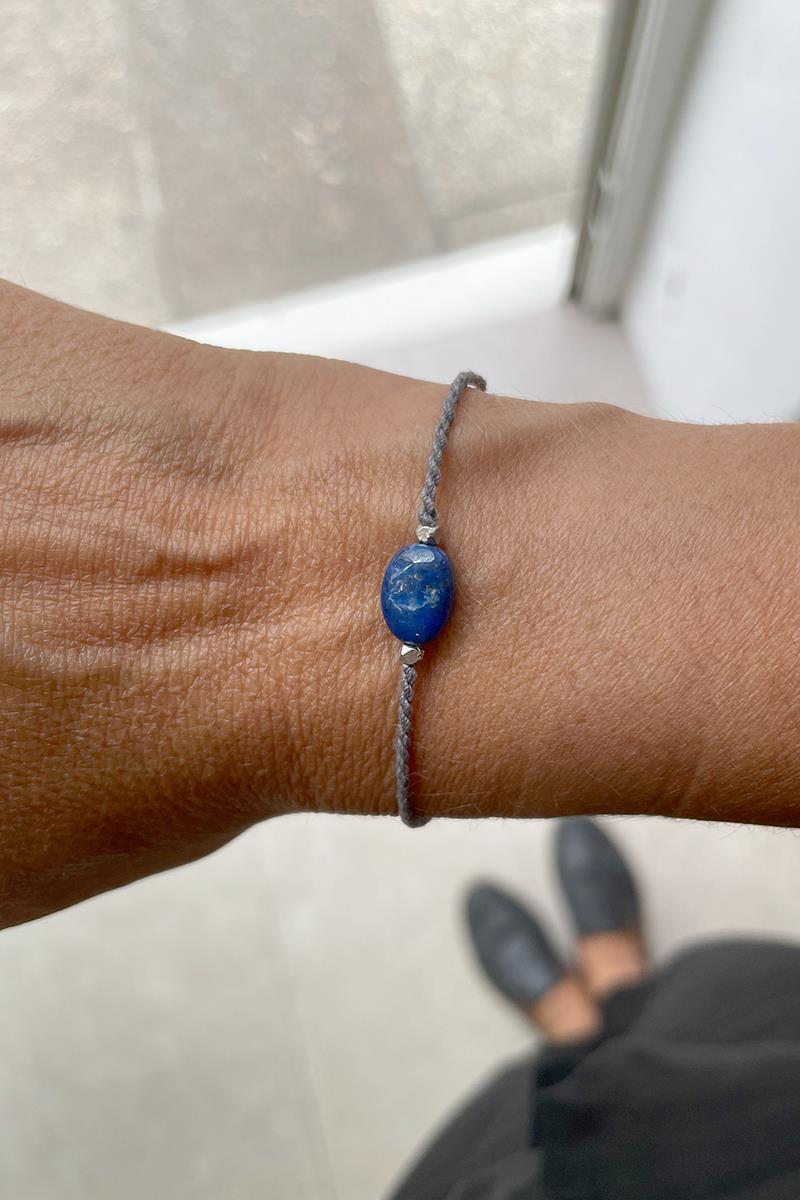 Pulsera realizada con cordón de algodón gris y una piedra de lapislázuli. Pequeños detalles en latón plateado. El cierre es regulable mediante un nudo corredizo. El lapislázuli hace amigos en todas partes. El lapislázuli es sabio y establece conexiones con facilidad. Un regalo con esta piedra preciosa de color azul intenso es una buena manera de celebrar una preciosa amistad.