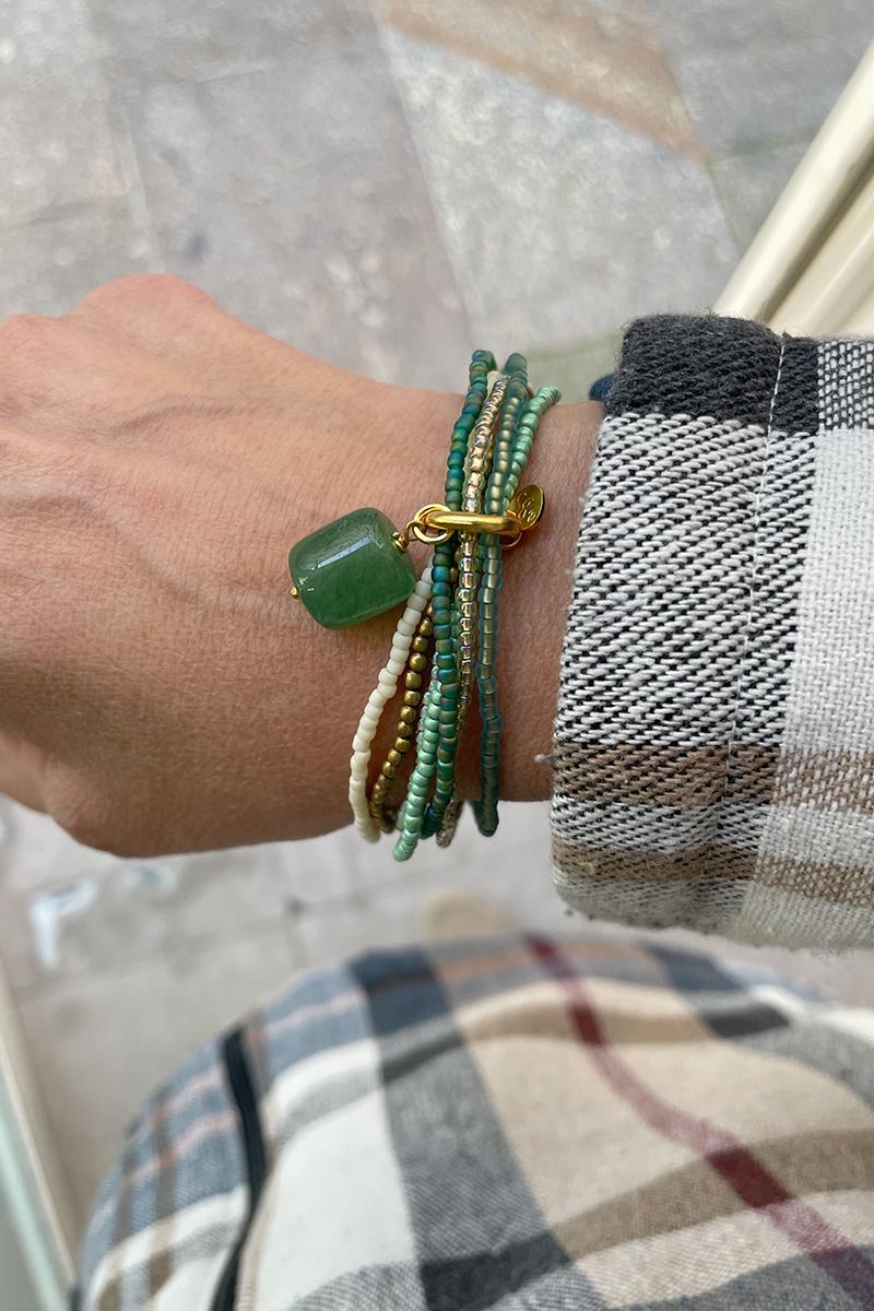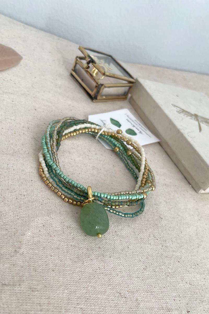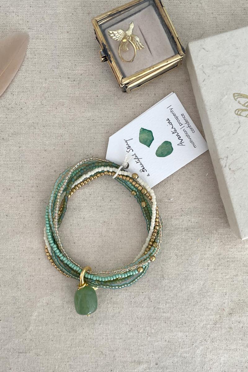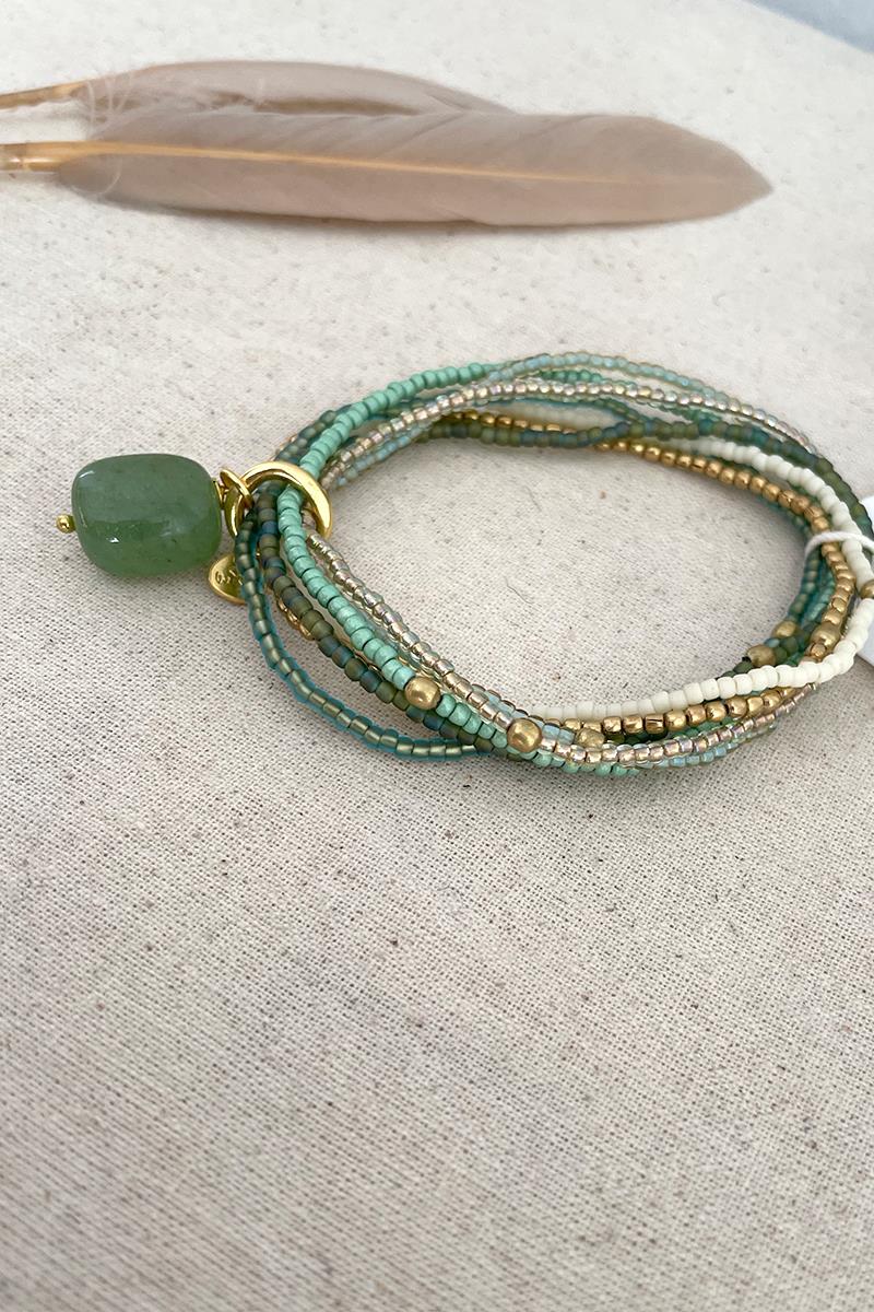 Nirmala es una pulsera formada por siete tiras con abalorios en diferentes tonos formando una combinación perfecta. Este modelo lleva una piedra de aventurina coordinada con abalorios verdes, crudos y dorados. La aventurina es la gema de la motivación, la seguridad y el crecimiento personal. Es una pieza muy vistosa y original, te resultará fácil de poner y quitar gracias a los cordones elásticos.