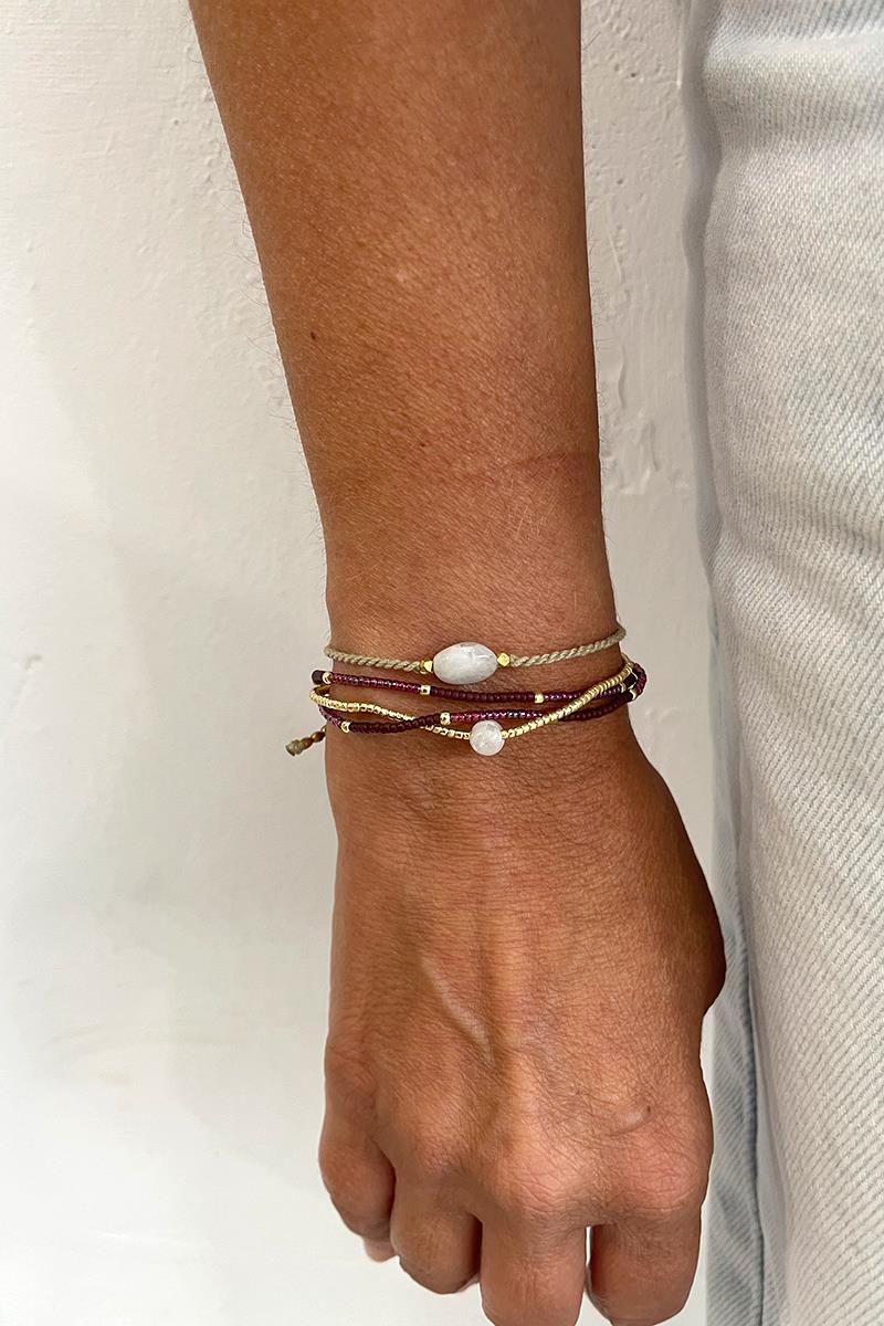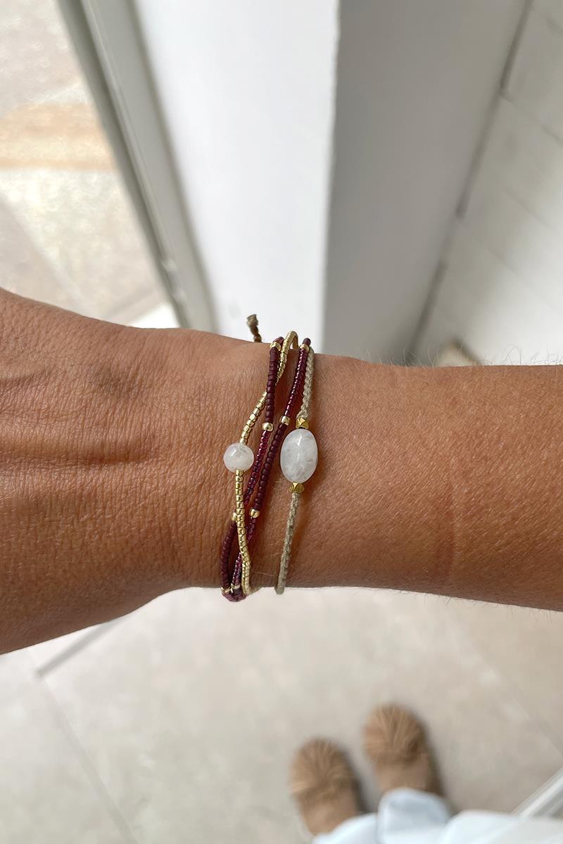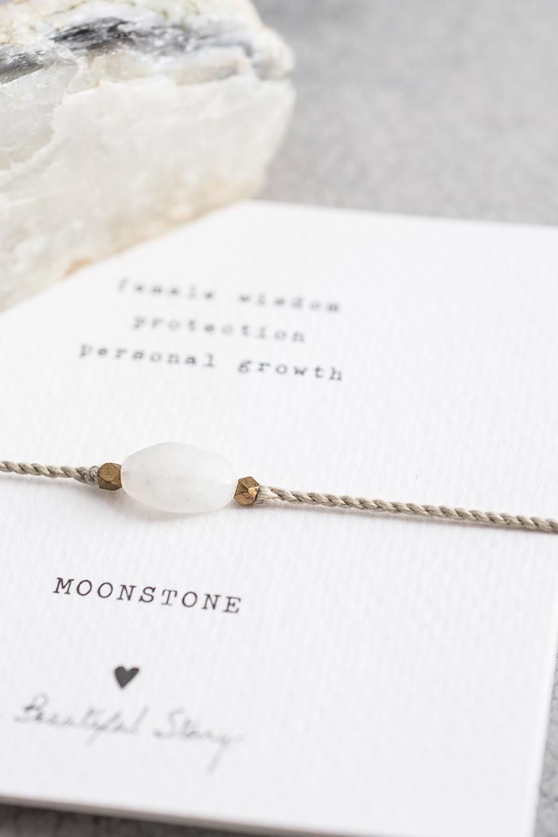 Pulsera realizada con cordón de algodón beige y una piedra de piedra luna. Pequeños detalles en latón dorado. El cierre es regulable mediante un nudo corredizo. Piedra Luna te ayuda con tu crecimiento personal, potencia tu sabiduría femenina y te protegerá.