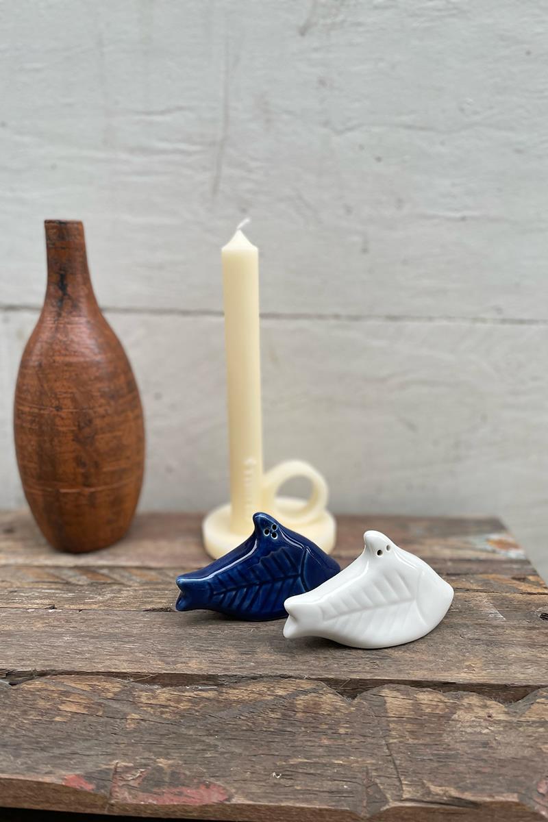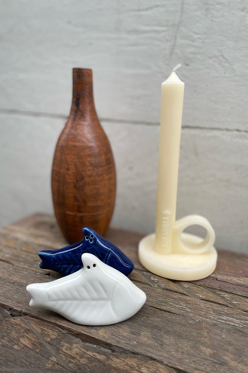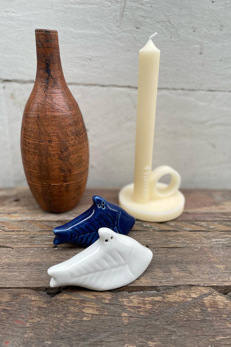 Juego de salero con forma de peces de cerámica. El pez blanco es para la sal y el pez azul para la pimienta. En la base tienen un tapón por donde podrás rellenarlos. Un juego ideal para sorprender a tus invitados o para regalarle a alguien especial.